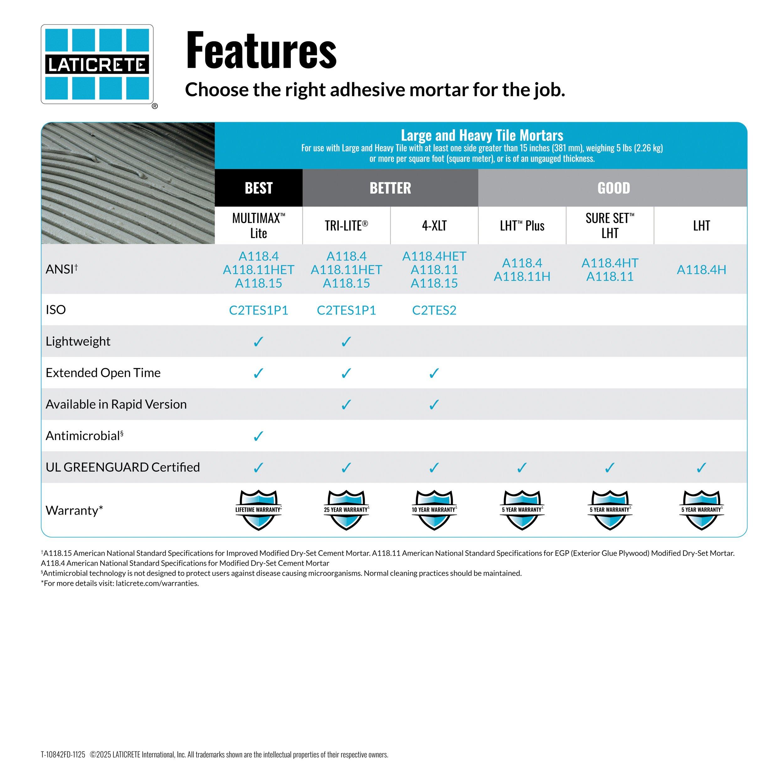 • Exceeds ANSI standards A118.15, A118.4, and A118.11