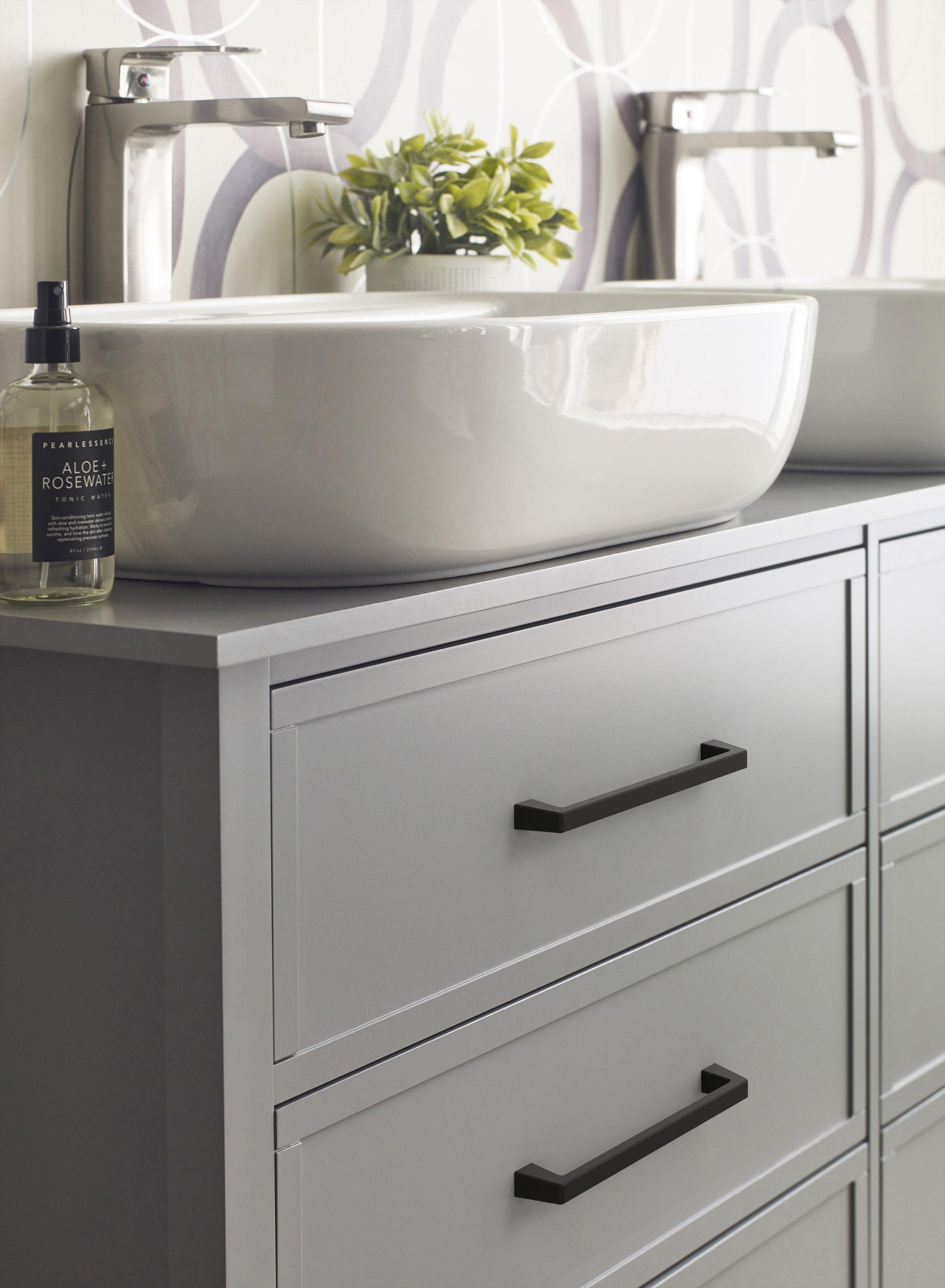 - Complete the look with matching cabinet knobs, drawer pulls and bath hardware from the Amerock Blackrock collection