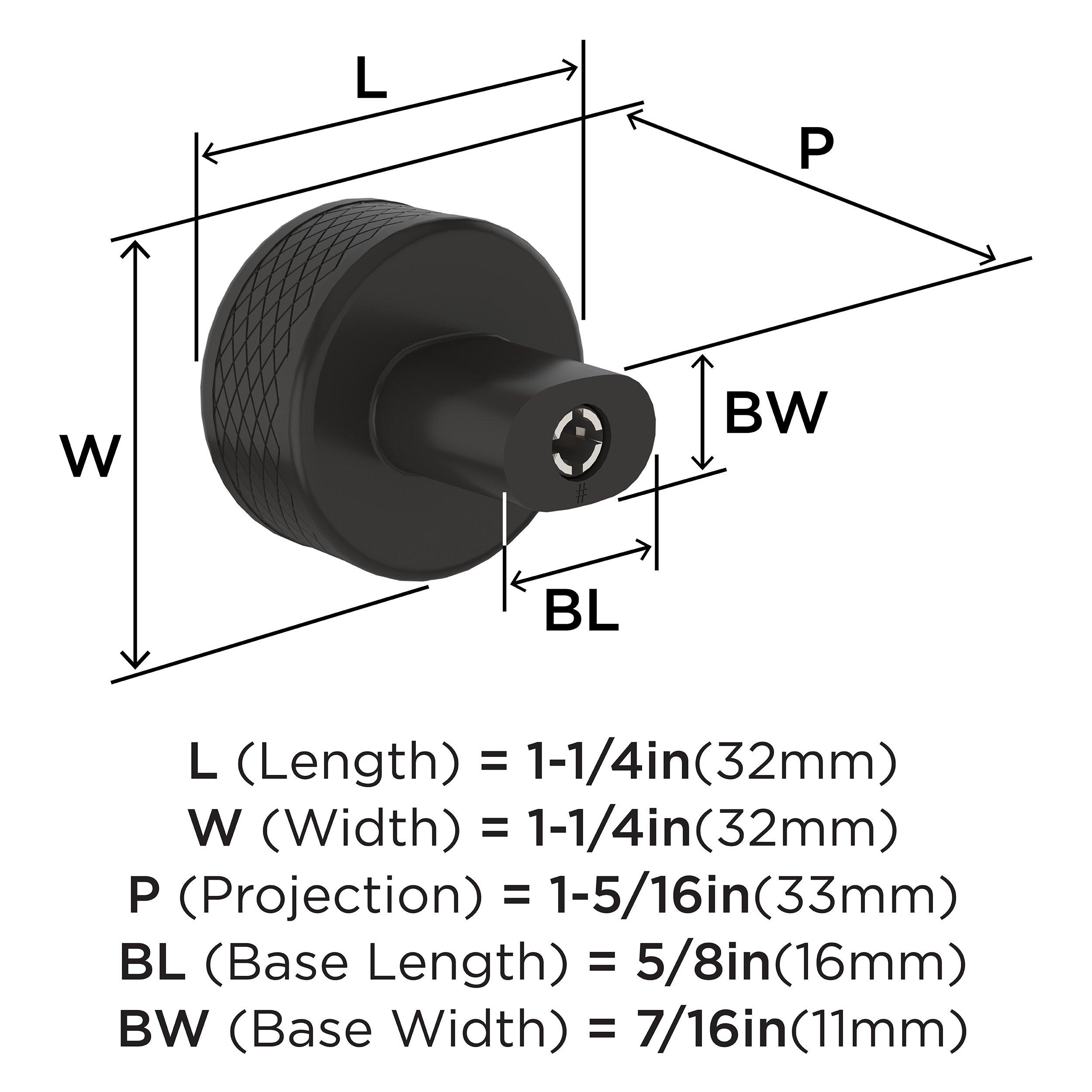The Amerock Bronx 1-1/4 in. Black Bronze Cabinet Knob is finished in black bronze matte. The subtle knurling of the Bronx collection adds a sophisticated and modern industrial twist to the traditional bar pull, certain to add designer flair to any space.