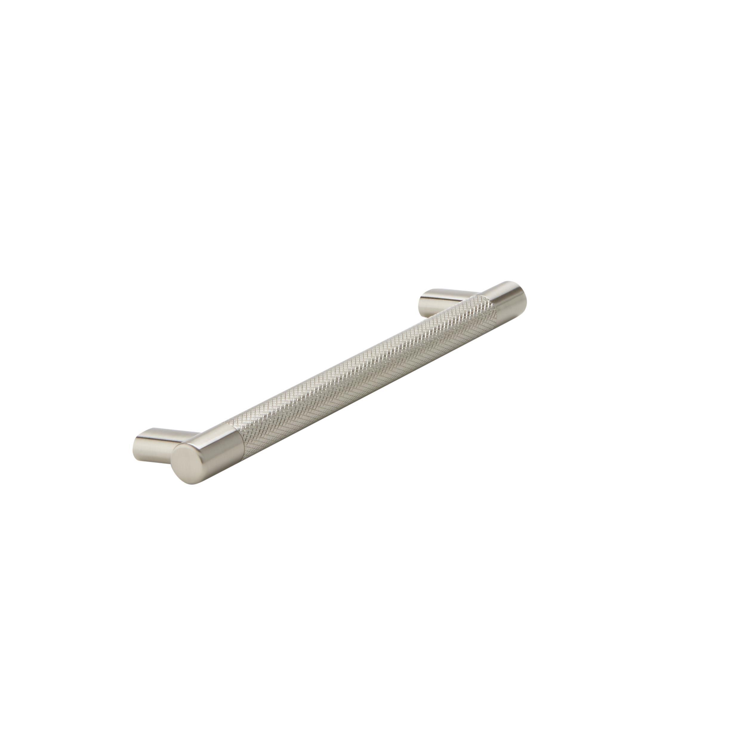 The Amerock Bronx 8 in. Center-to-Center Satin Nickel Cabinet Pull is finished in satin nickel satin. The subtle knurling of the Bronx collection adds a sophisticated and modern industrial twist to the traditional bar pull, certain to add designer flair to any space.