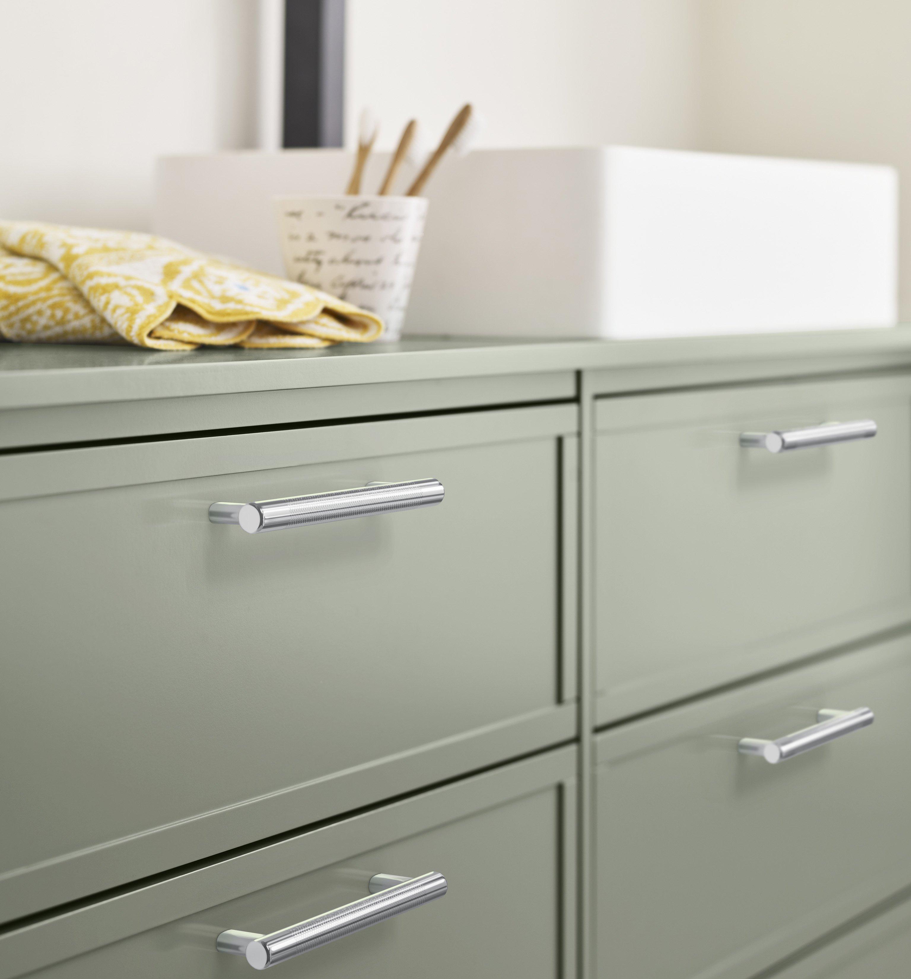 The Amerock Bronx 6-5/16 in. Center-to-Center Polished Chrome Cabinet Pull is finished in polished chrome polished. The subtle knurling of the Bronx collection adds a sophisticated and modern industrial twist to the traditional bar pull, certain to add designer flair to any space.