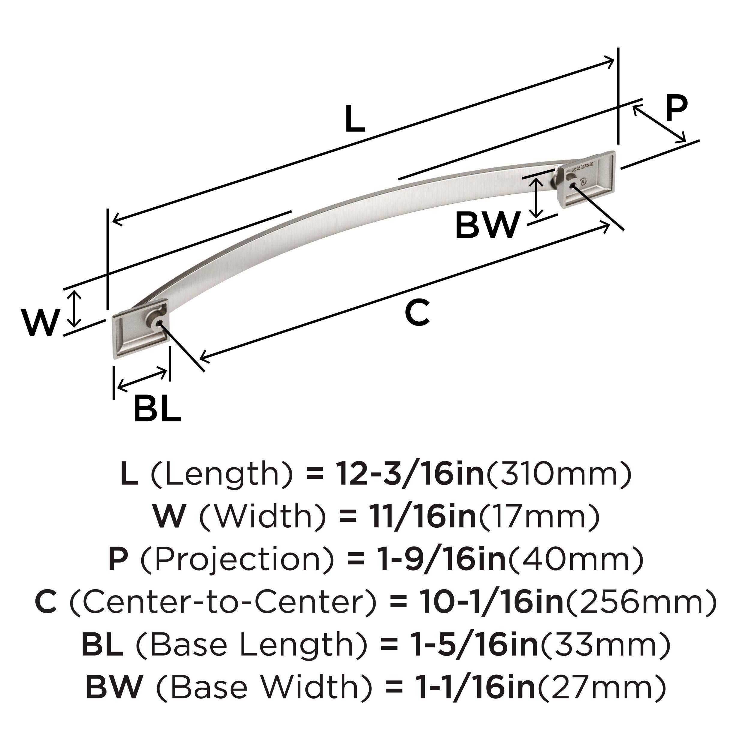 The Amerock Candler 10-1/16 in. Center-to-Center Satin Nickel Cabinet Pull is finished in satin nickel satin. With strong lines and soft curves, the Candler collection offers a casual feel that imparts timeless character