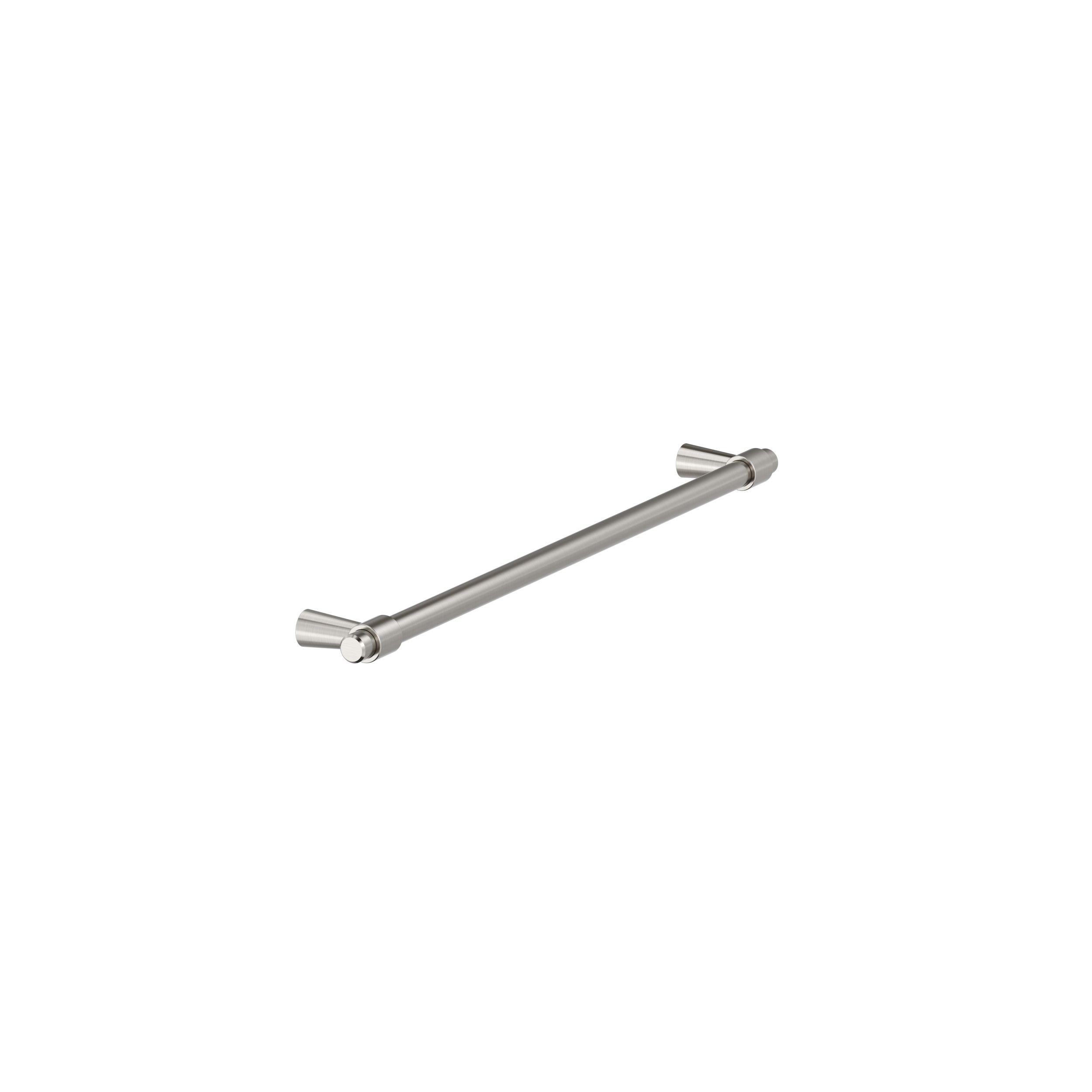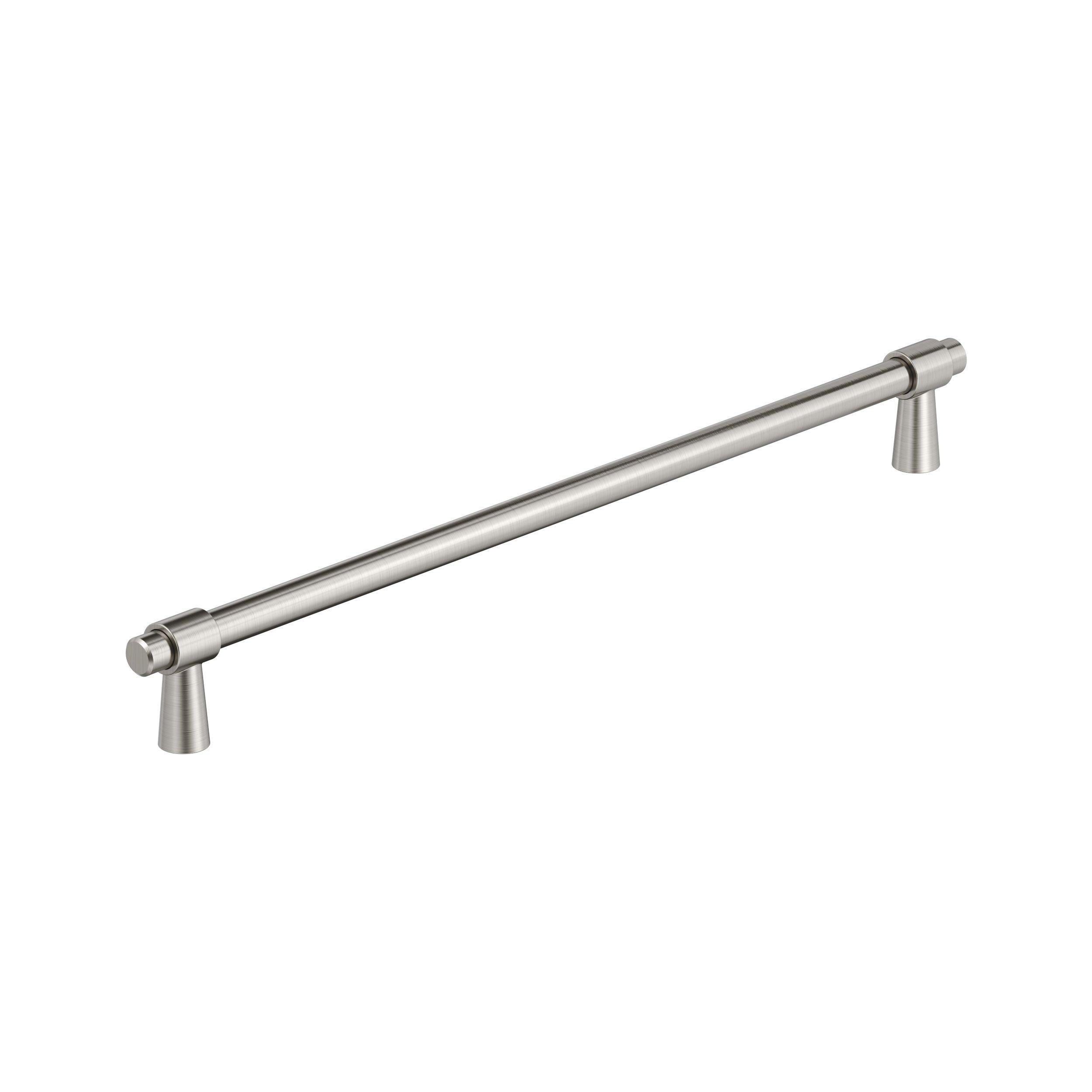 The Amerock Destine 12-5/8 in. Center-to-Center Satin Nickel Cabinet Pull is finished in satin nickel satin. With its minimalistic forms, the Destine collection imparts mid-century modern flair to any décor with its streamlined, assembled design.