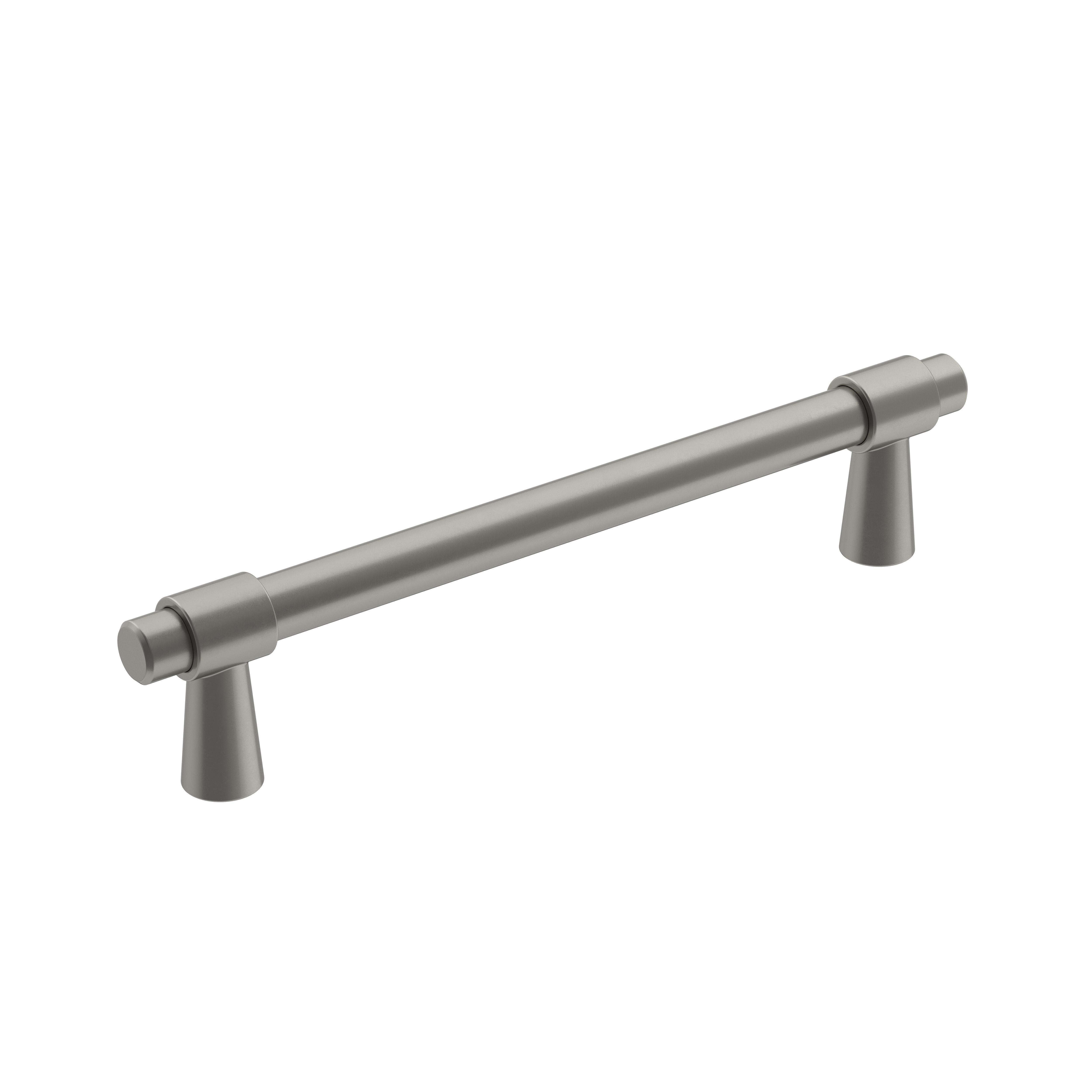 The Amerock Destine 5-1/16 in. Center-to-Center Satin Nickel Cabinet Pull is finished in satin nickel satin. With its minimalistic forms, the Destine collection imparts mid-century modern flair to any décor with its streamlined, assembled design.