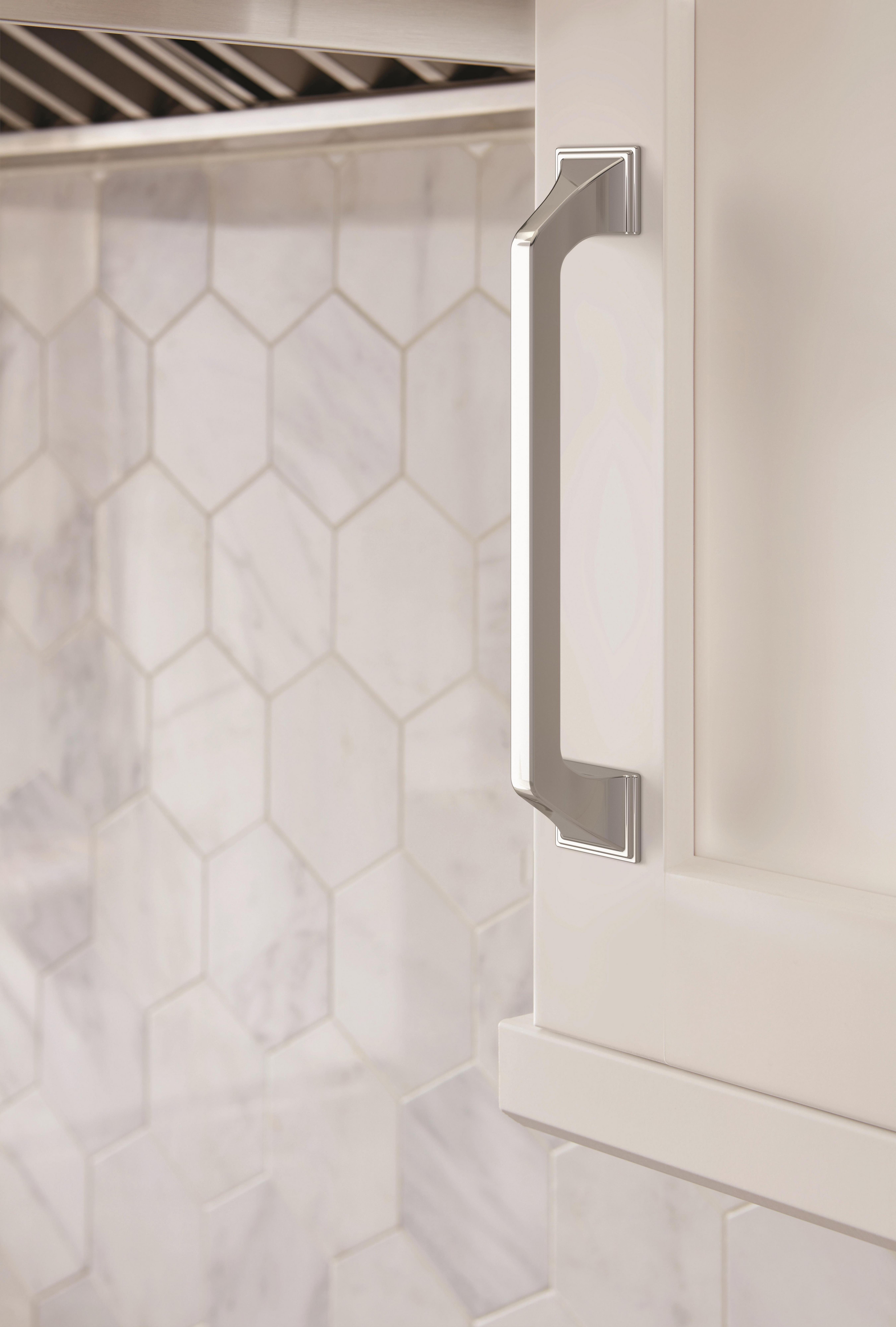 The Amerock Exceed 6-5/16 in. Center-to-Center Polished Chrome Cabinet Pull is finished in polished chrome polished. The Exceed collection blends inviting curves with distinctive pedestal edges, creating a composition that is as unexpected as it is timeless.