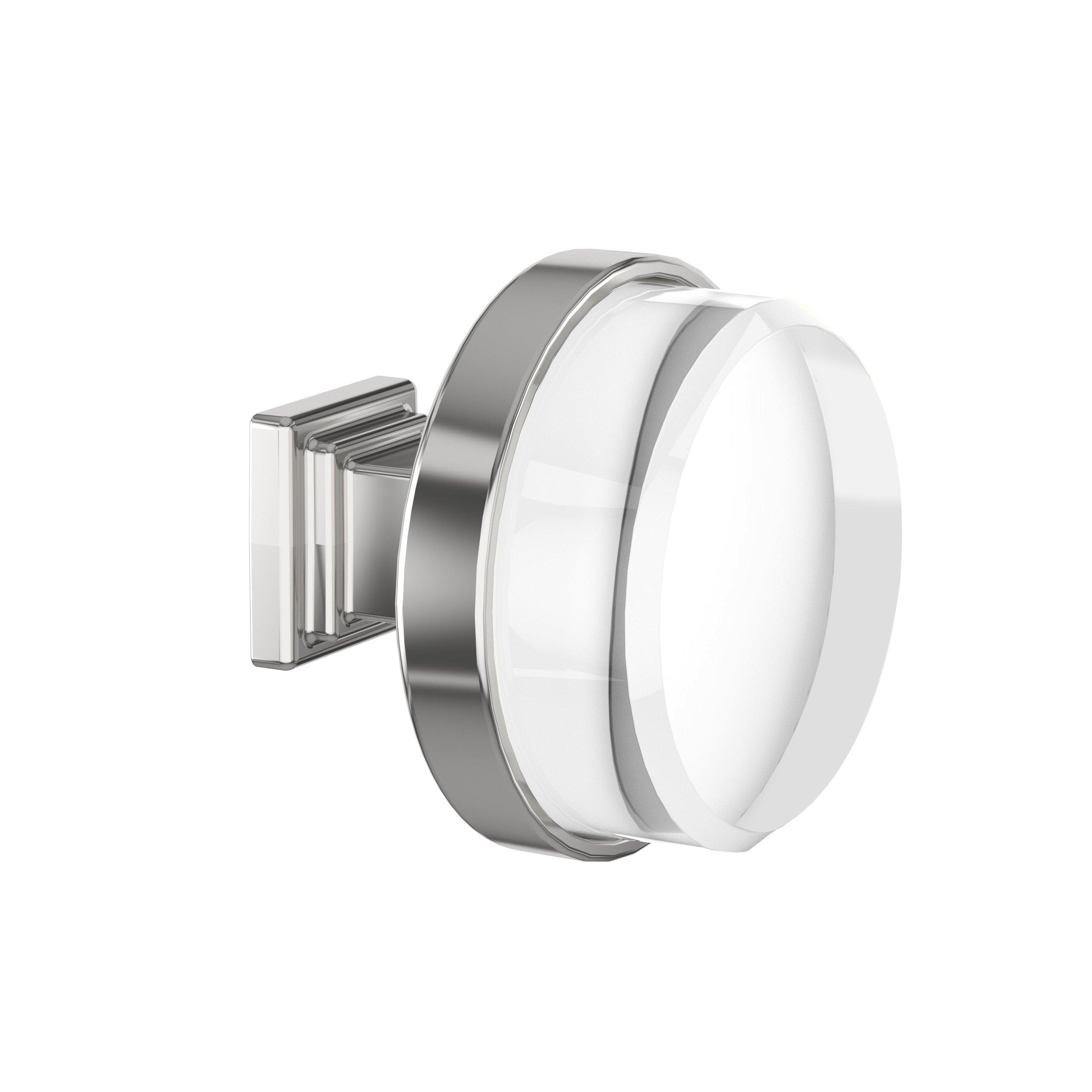 The Amerock Glacio 1-1/2 in. Clear and Polished Chrome Cabinet Knob is finished in polished chrome polished. In the Glacio collection, graceful metallic mountings hold clear accents that seem to float above the surface for an ethereal look and feel.