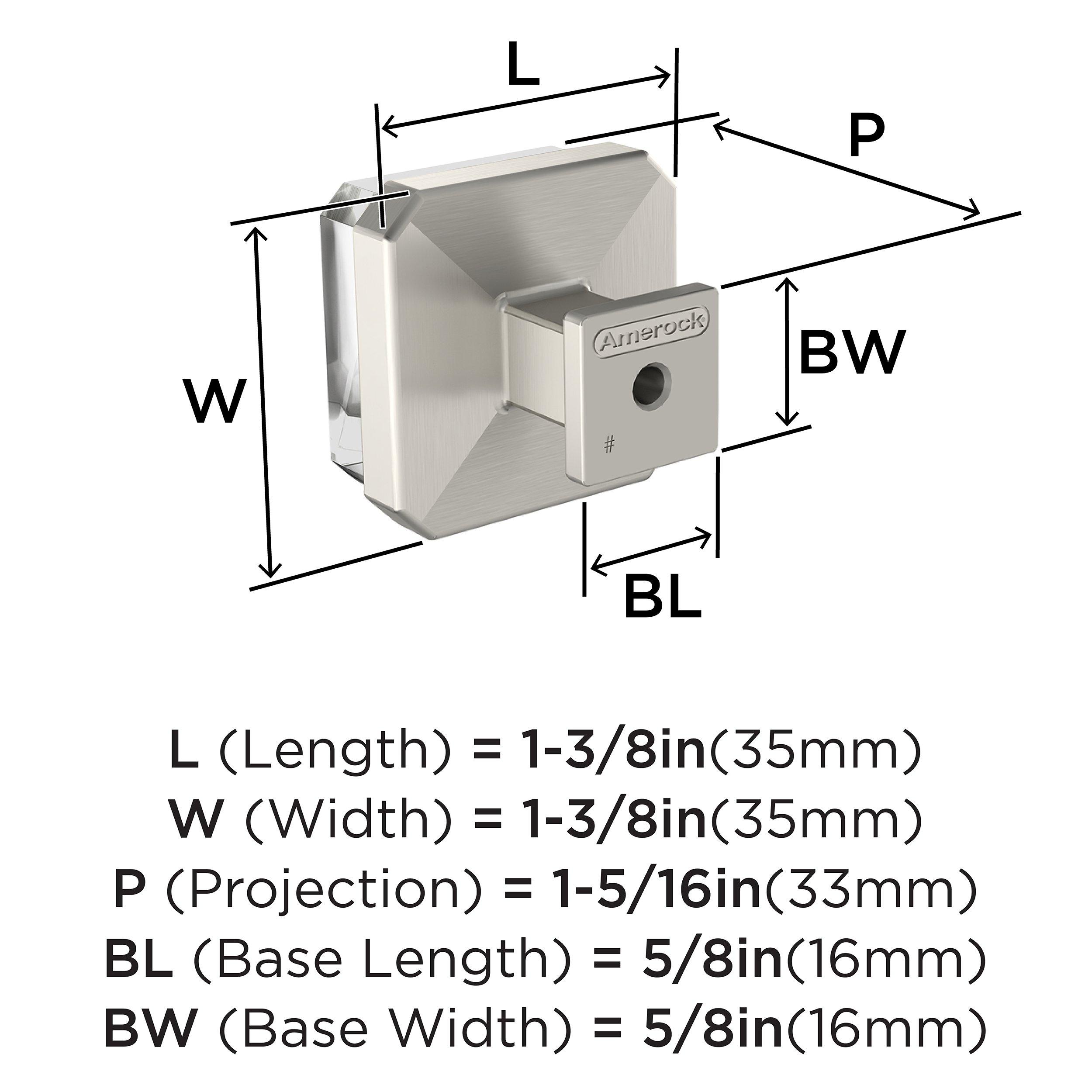The Amerock Glacio 1-3/8 in. Clear and Satin Nickel Cabinet Knob is finished in satin nickel satin. In the Glacio collection, graceful metallic mountings hold clear accents that seem to float above the surface for an ethereal look and feel.