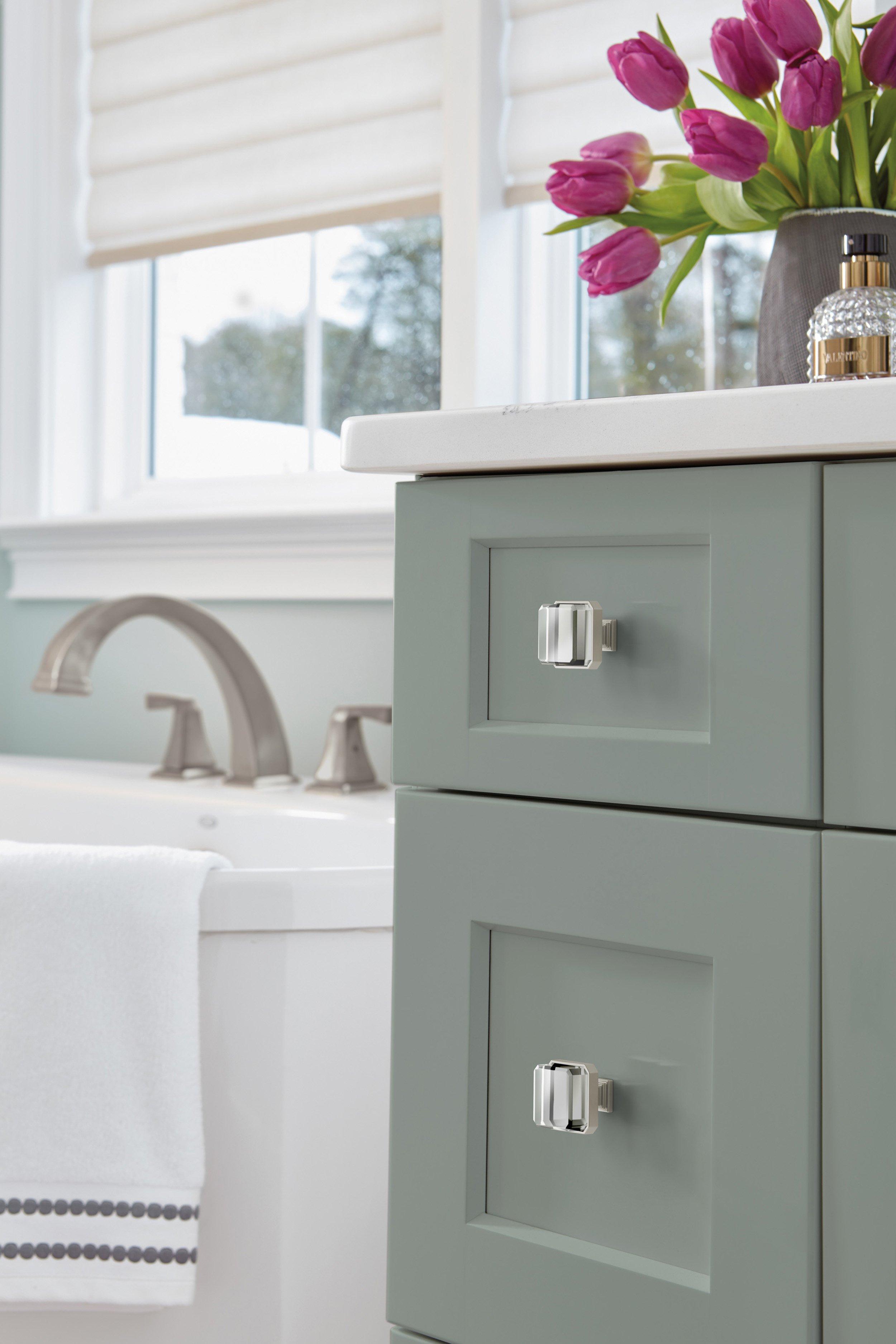 - Complete the look with matching cabinet knobs, drawer pulls and bath hardware from the Amerock Glacio collection