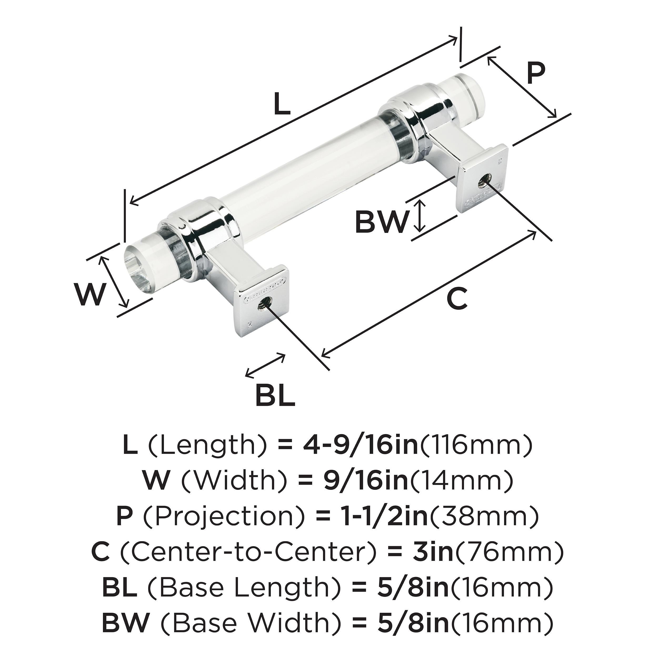 The Amerock Glacio 3 in. Center-to-Center Clear and Polished Chrome Cabinet Pull is finished in polished chrome polished. In the Glacio collection, graceful metallic mountings hold clear accents that seem to float above the surface for an ethereal look and feel.