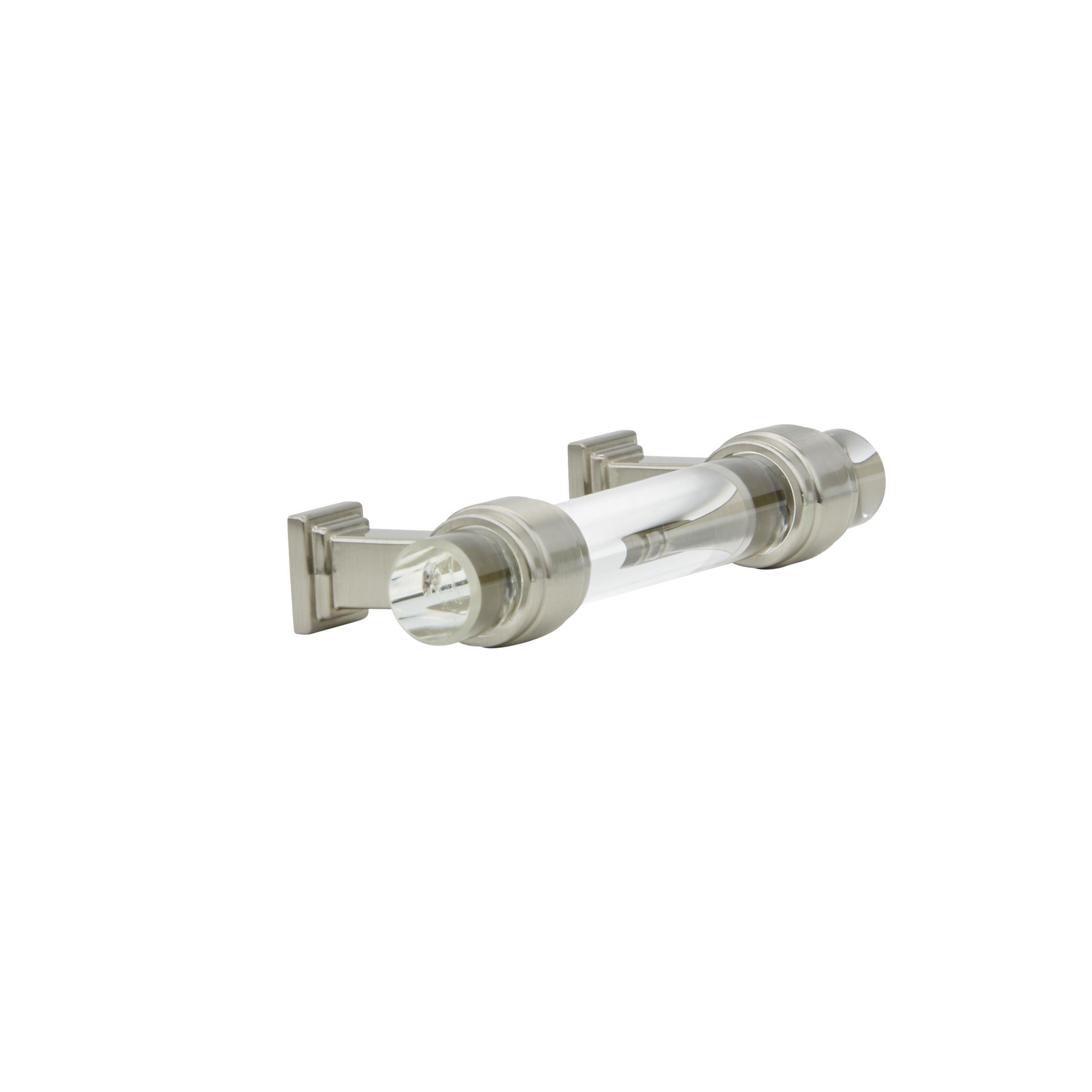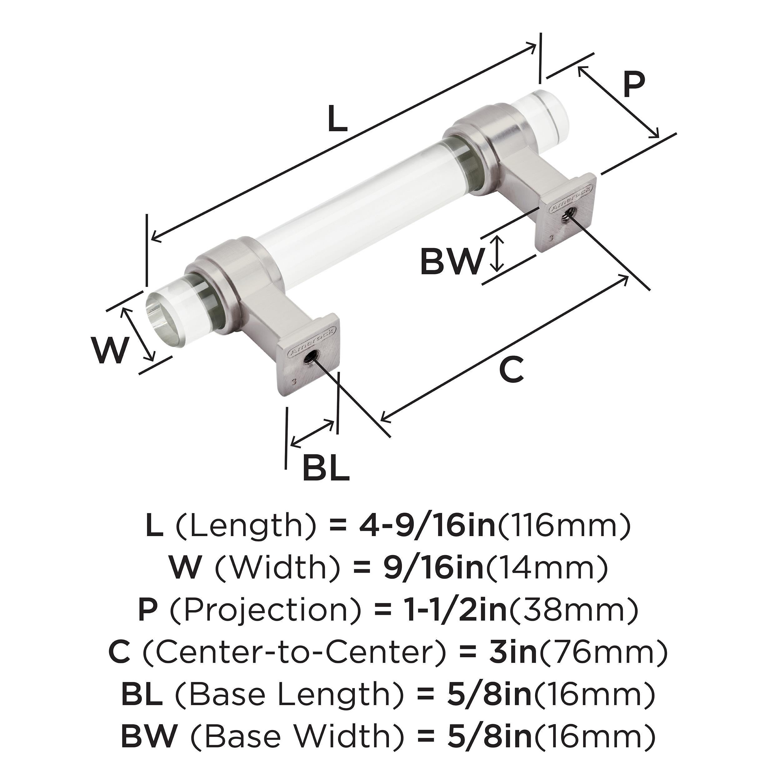The Amerock Glacio 3 in. Center-to-Center Clear and Satin Nickel Cabinet Pull is finished in satin nickel satin. In the Glacio collection, graceful metallic mountings hold clear accents that seem to float above the surface for an ethereal look and feel.