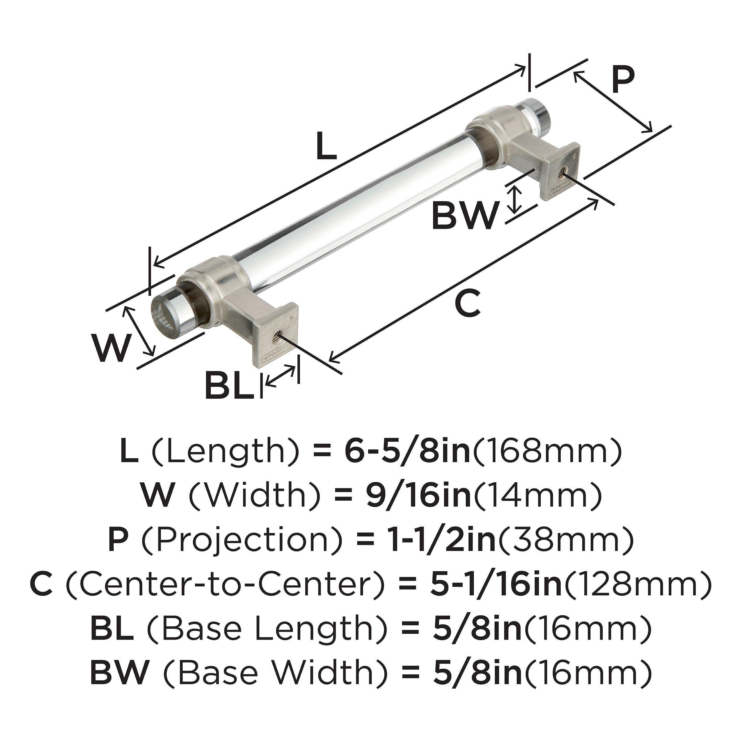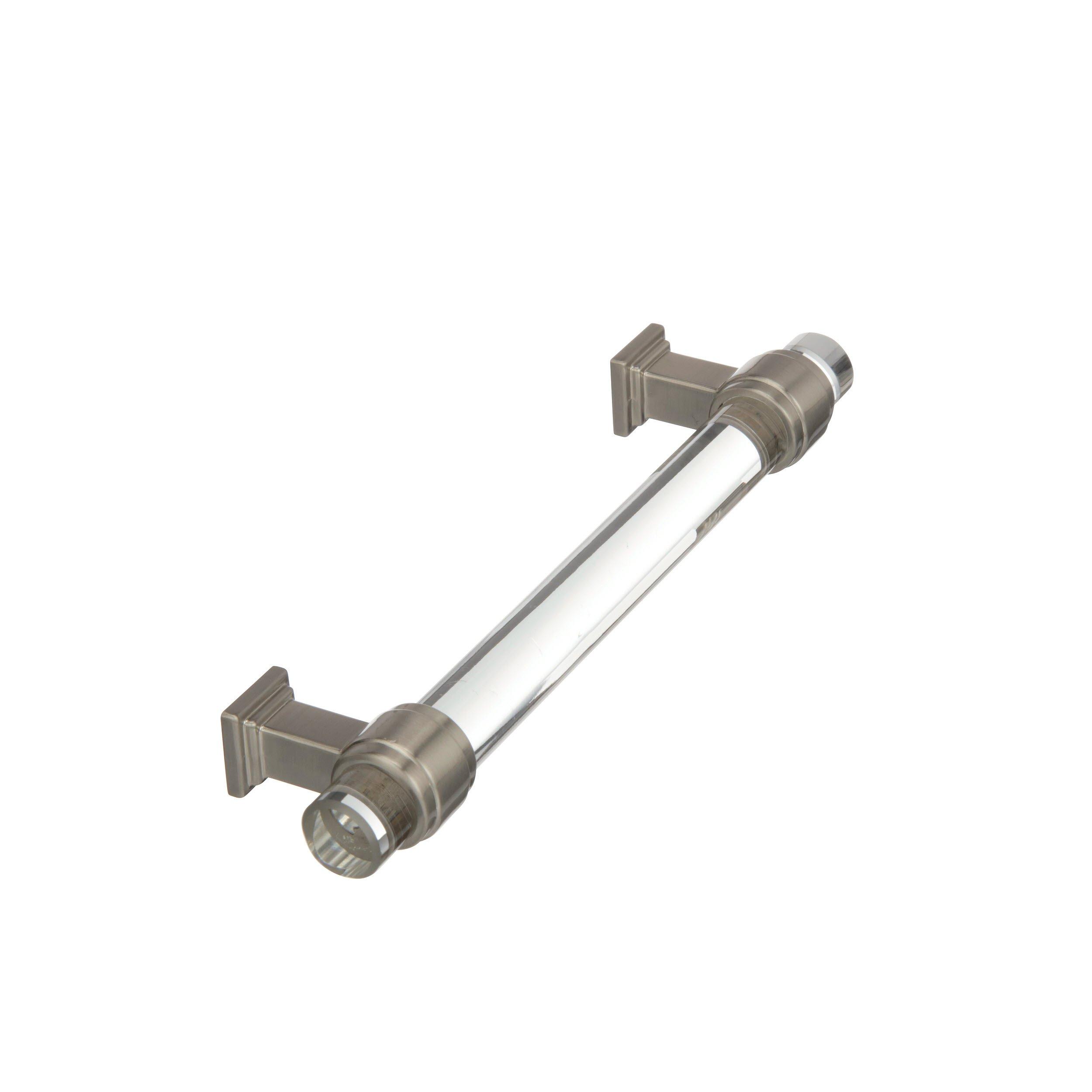 The Amerock Glacio 5-1/16 in. Center-to-Center Clear and Satin Nickel Cabinet Pull is finished in satin nickel satin. In the Glacio collection, graceful metallic mountings hold clear accents that seem to float above the surface for an ethereal look and feel.