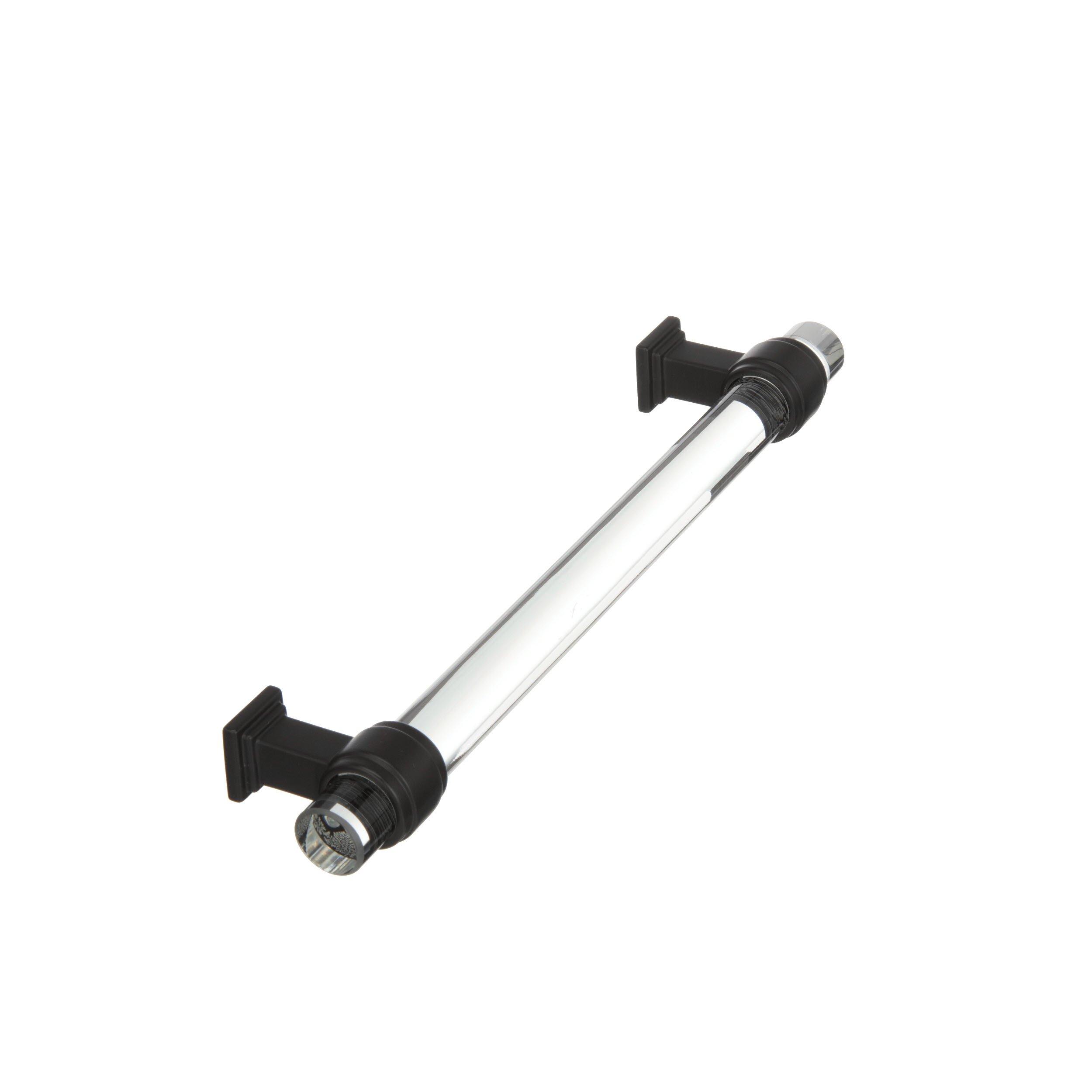The Amerock Glacio 6-5/16 in. Center-to-Center Clear and Black Bronze Cabinet Pull is finished in black bronze matte. In the Glacio collection, graceful metallic mountings hold clear accents that seem to float above the surface for an ethereal look and feel.