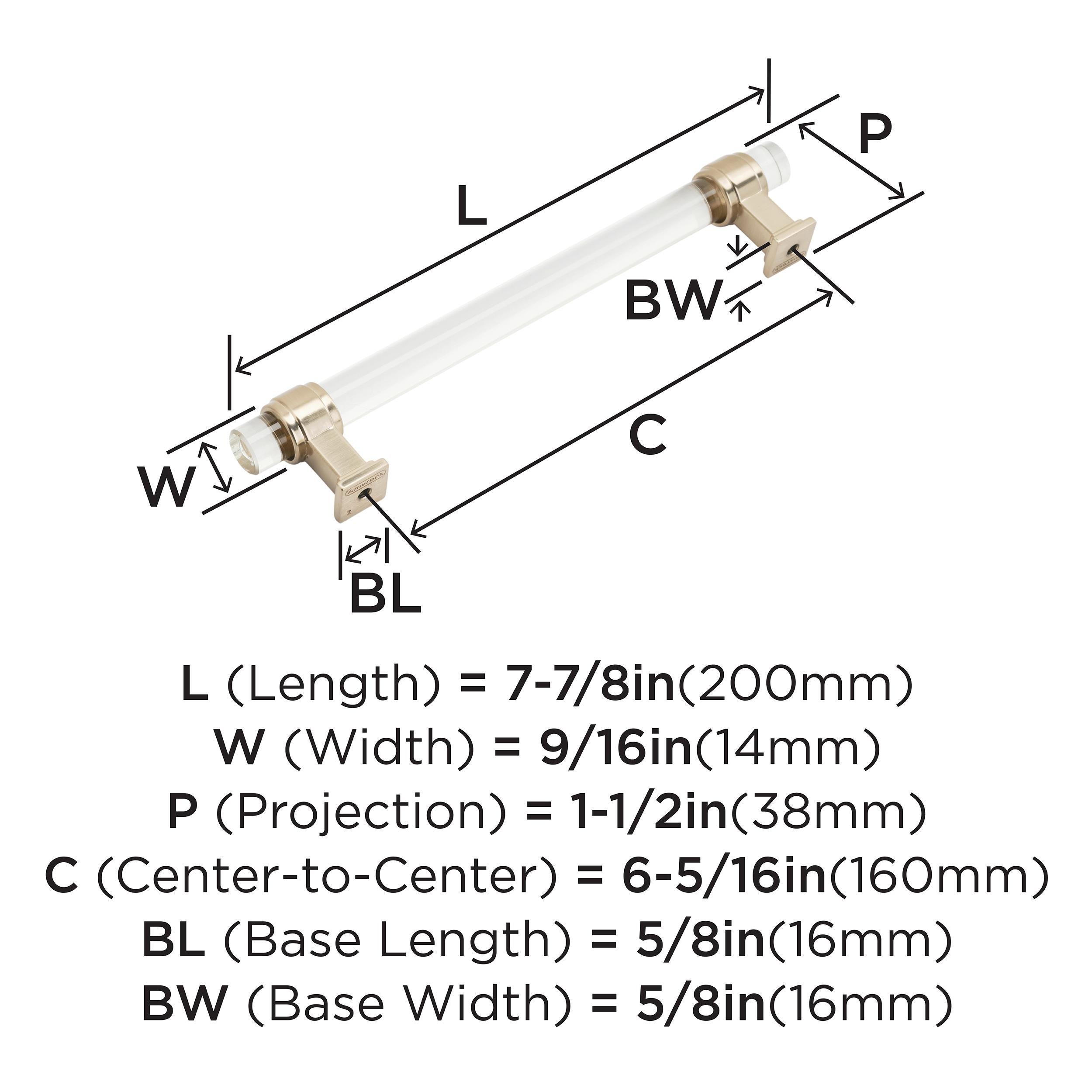 The Amerock Glacio 6-5/16 in. Center-to-Center Clear and Champagne Bronze Cabinet Pull is finished in champagne bronze satin. In the Glacio collection, graceful metallic mountings hold clear accents that seem to float above the surface for an ethereal look and feel.