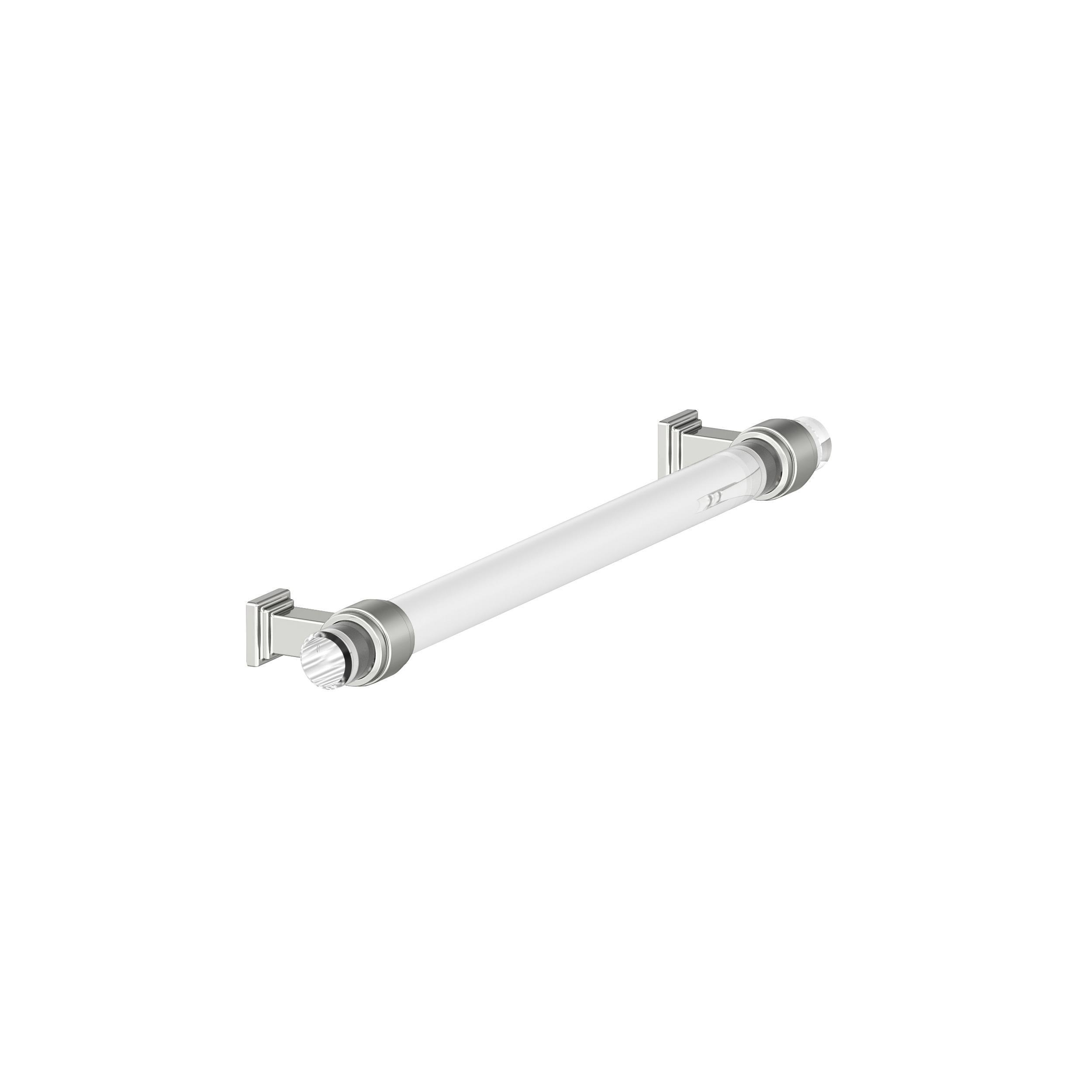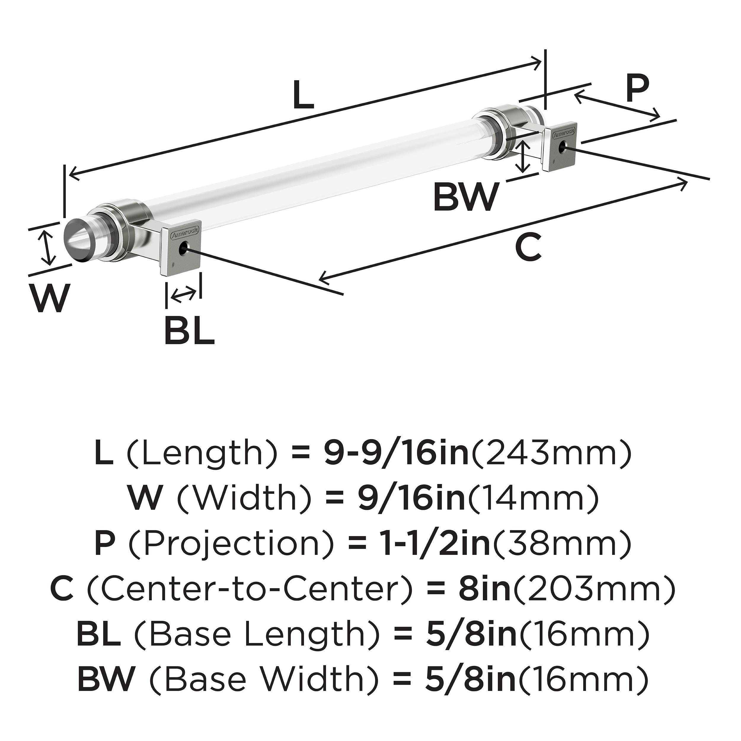 The Amerock Glacio 8 in. Center-to-Center Clear and Polished Chrome Cabinet Pull is finished in polished chrome polished. In the Glacio collection, graceful metallic mountings hold clear accents that seem to float above the surface for an ethereal look and feel.
