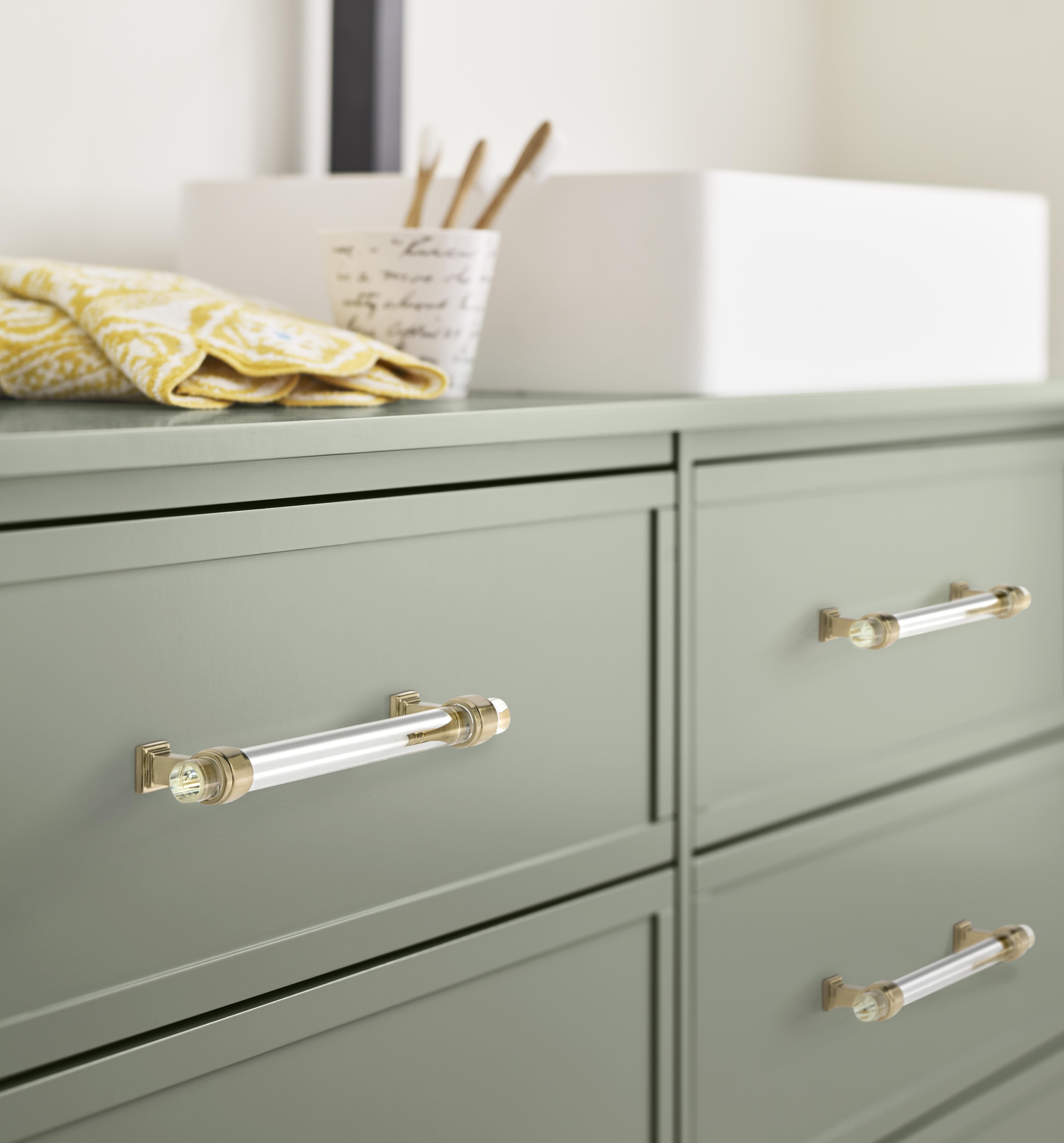 The Amerock Glacio 6-5/16 in. Center-to-Center Clear and Champagne Bronze Cabinet Pull is finished in champagne bronze satin. In the Glacio collection, graceful metallic mountings hold clear accents that seem to float above the surface for an ethereal look and feel.
