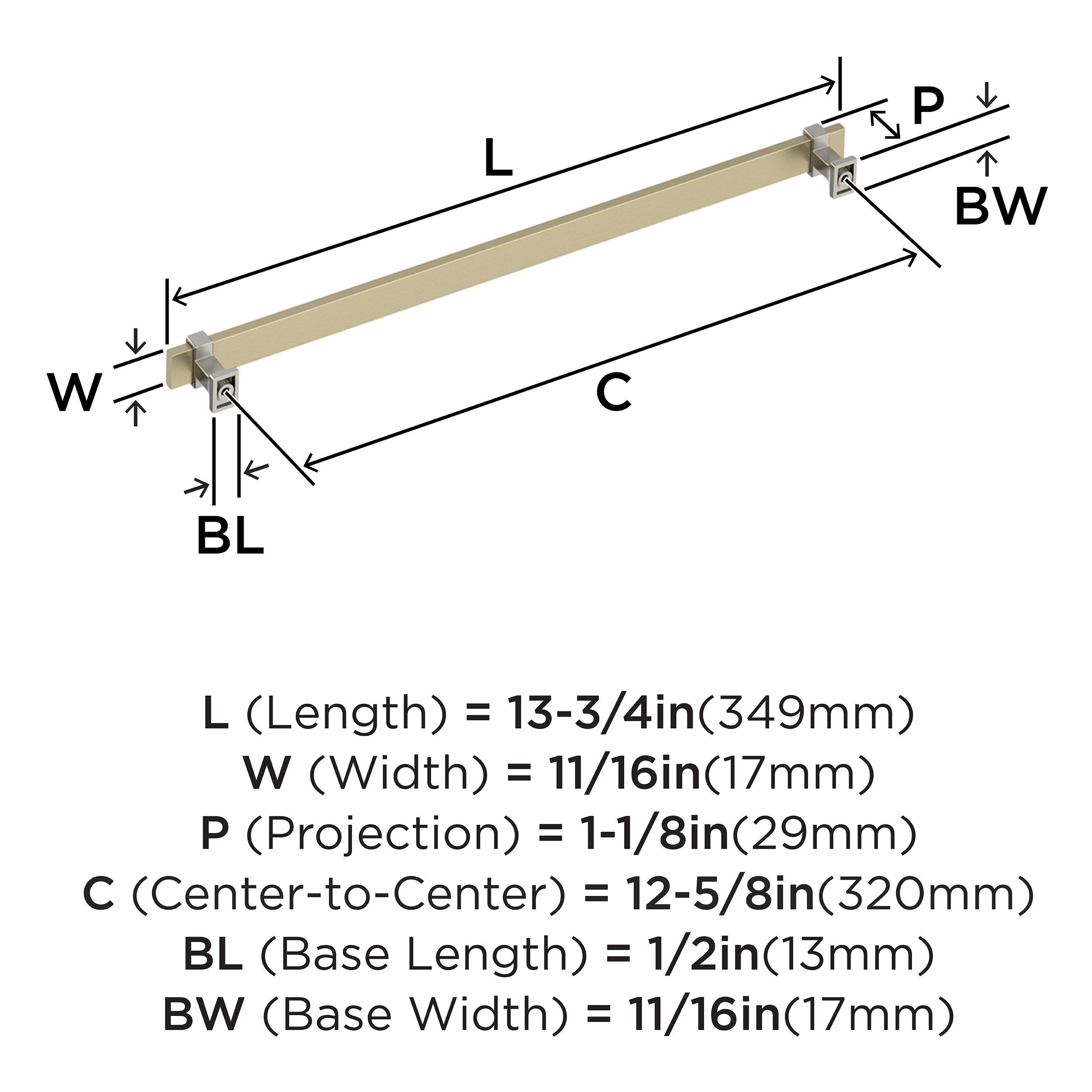 The Amerock Overton 12-5/8 in. Center-to-Center Golden Champagne and Satin Nickel Cabinet Pull is finished in satin nickel satin. Inspired by new traditional styling, the Overton collection offers a luxurious, split-finish design that accentuates its ribbonlike forms.