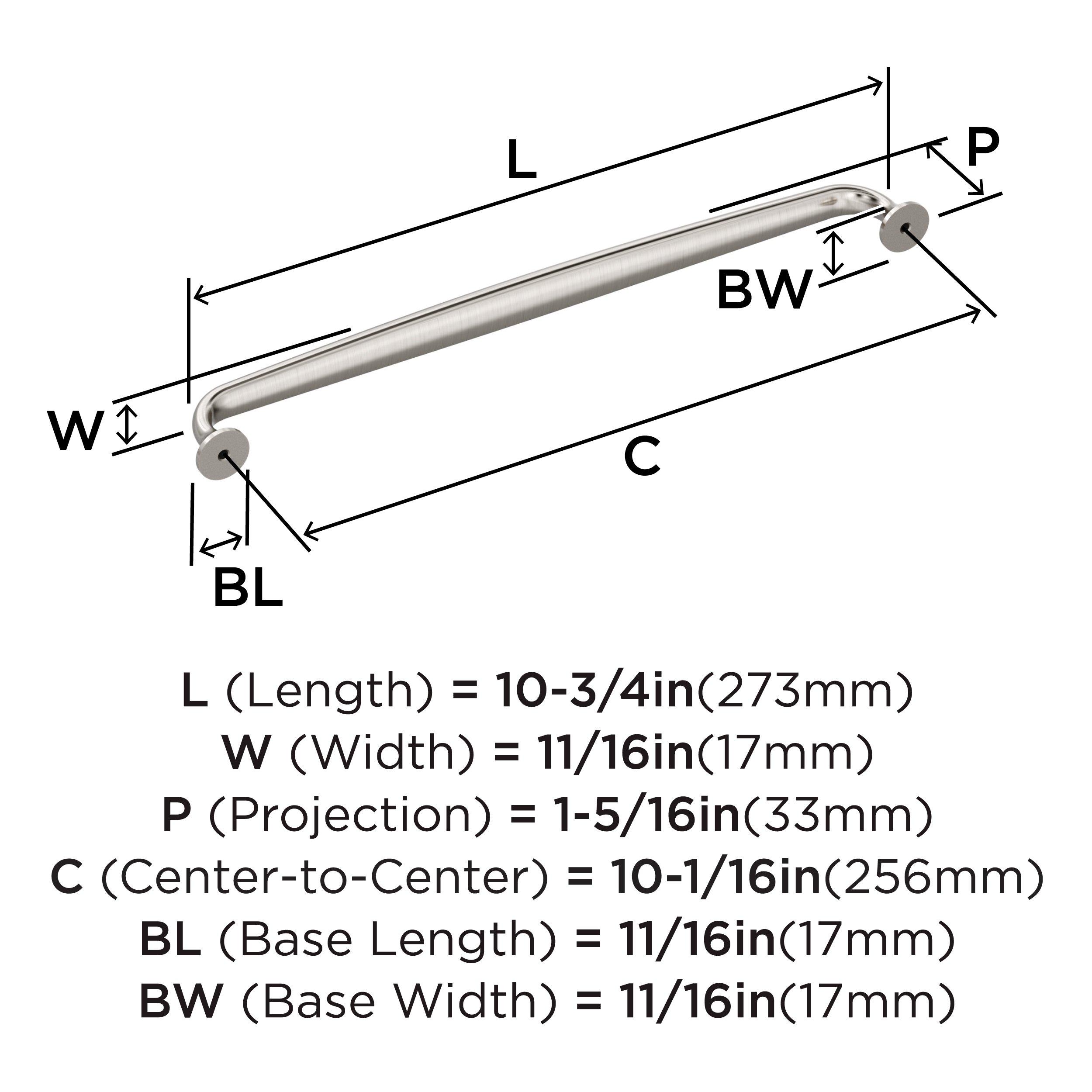 The Amerock Renown 10-1/16 in. Center-to-Center Satin Nickel Cabinet Pull is finished in satin nickel satin. A nod to new traditional style, the Renown collection imparts refined simplicity and approachable character that enhances the décor.