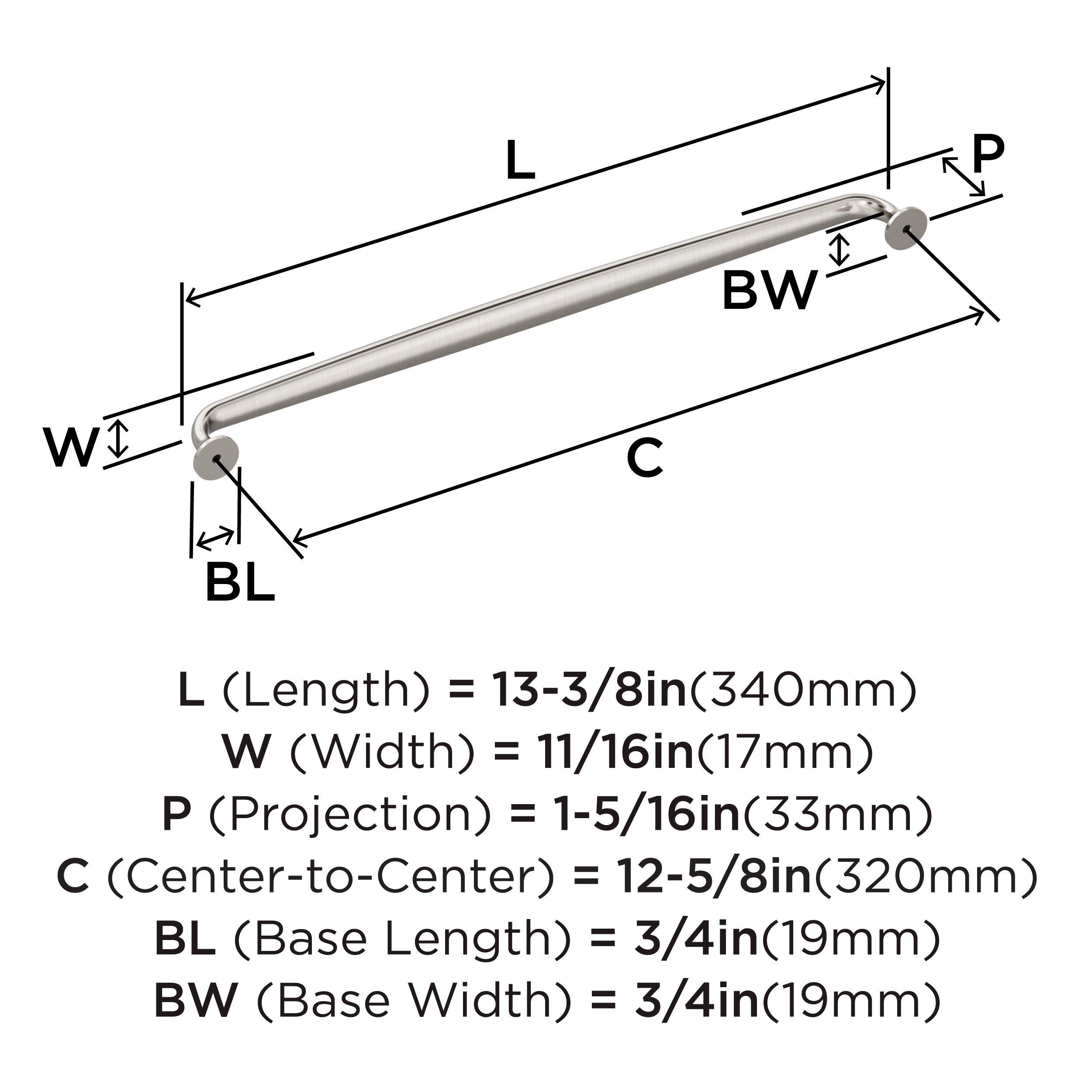 The Amerock Renown 12-5/8 in. Center-to-Center Satin Nickel Cabinet Pull is finished in satin nickel satin. A nod to new traditional style, the Renown collection imparts refined simplicity and approachable character that enhances the décor.