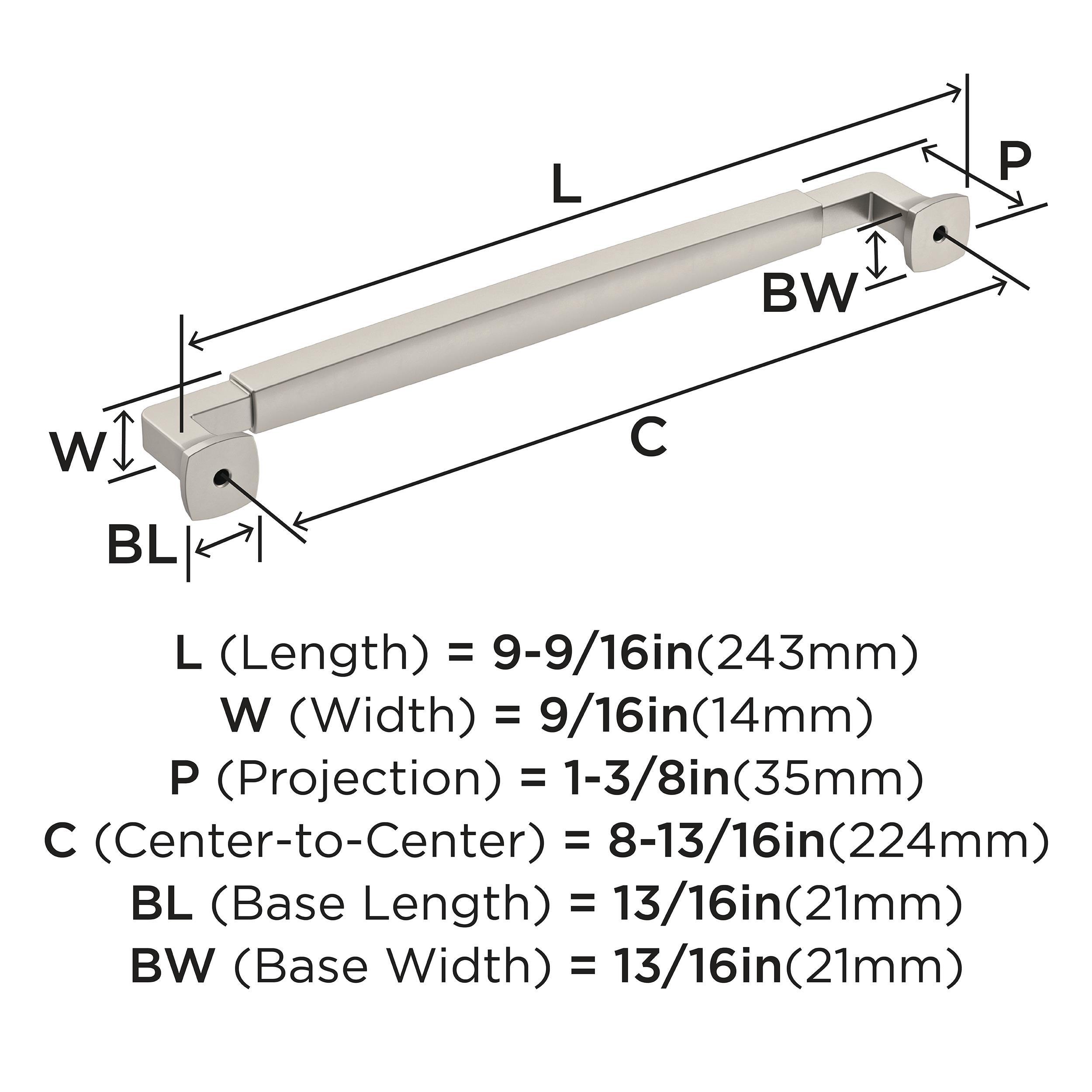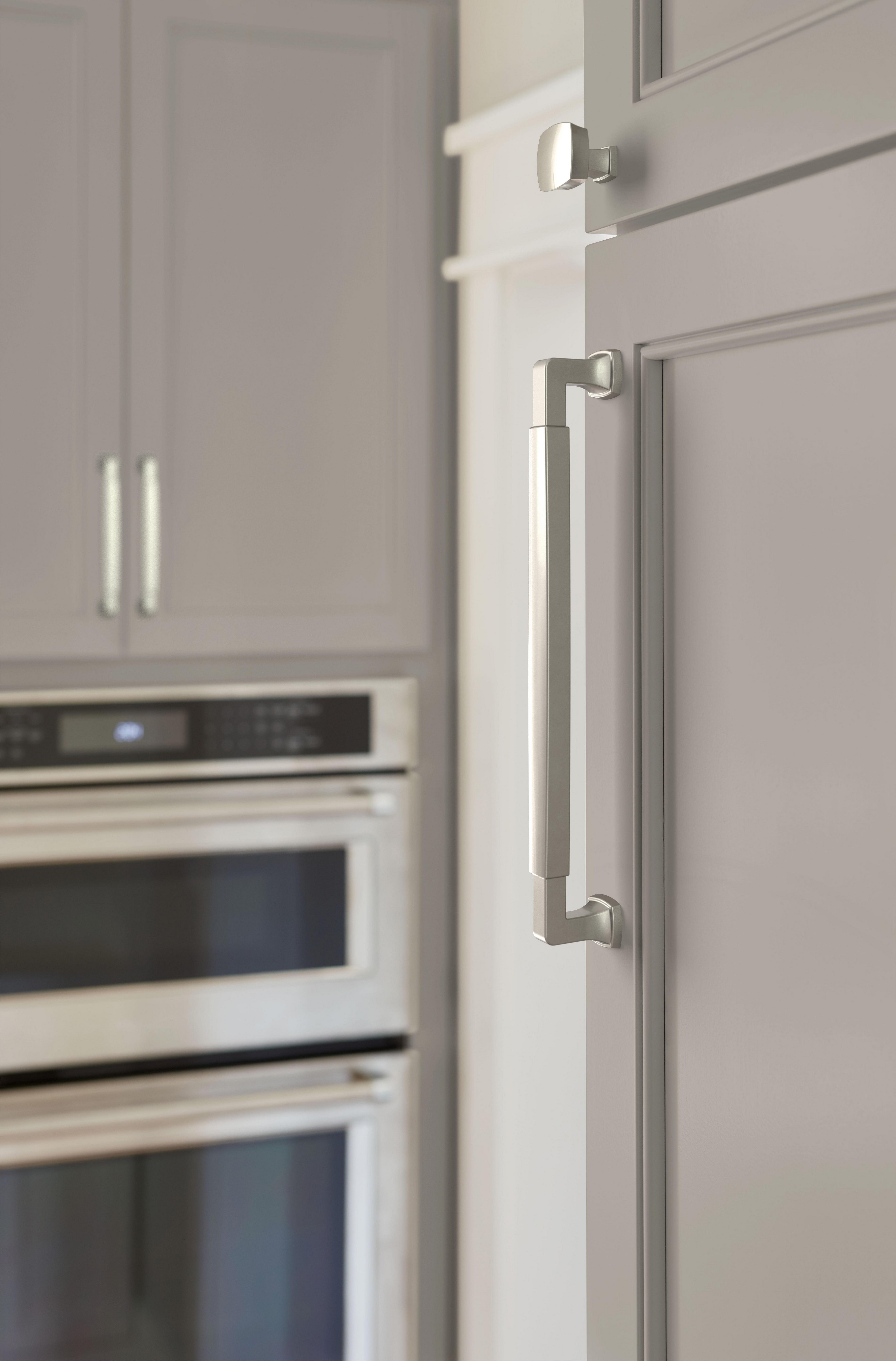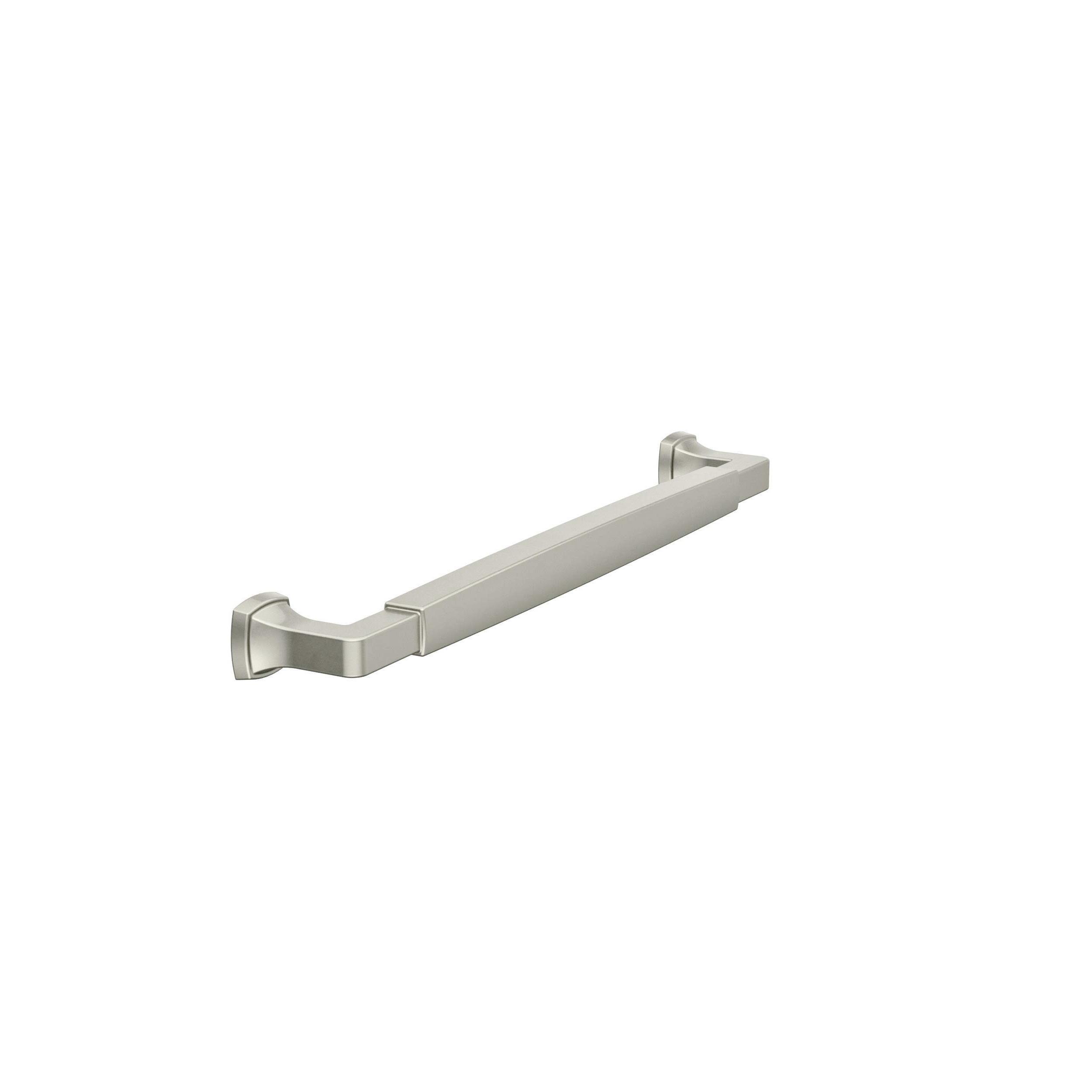 The Amerock Stature 8-13/16 in. Center-to-Center Satin Nickel Cabinet Pull is finished in satin nickel satin. Stately and substantial, the Stature collection features classic, bold designs and barrel-style pulls that are underlined with timeless appeal.