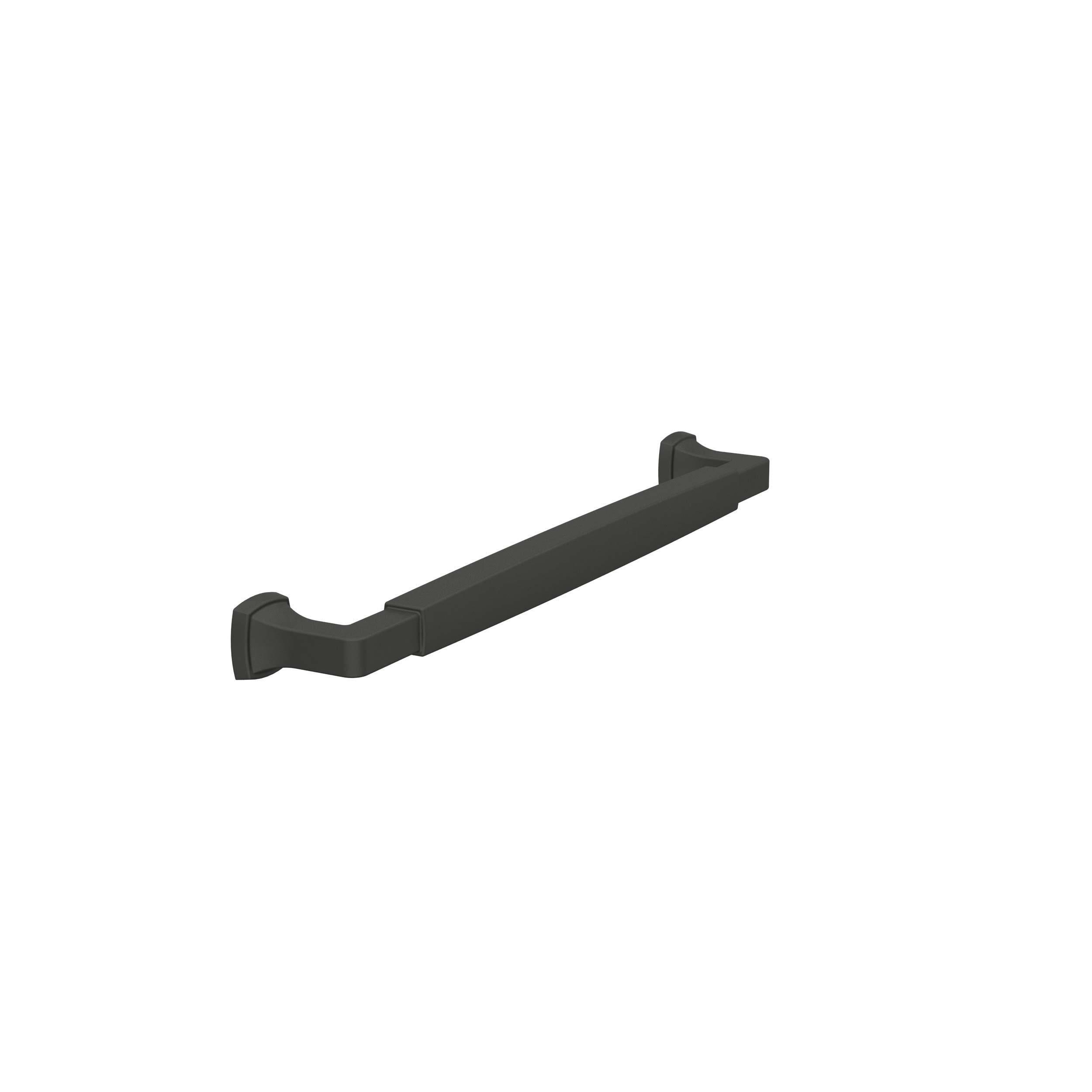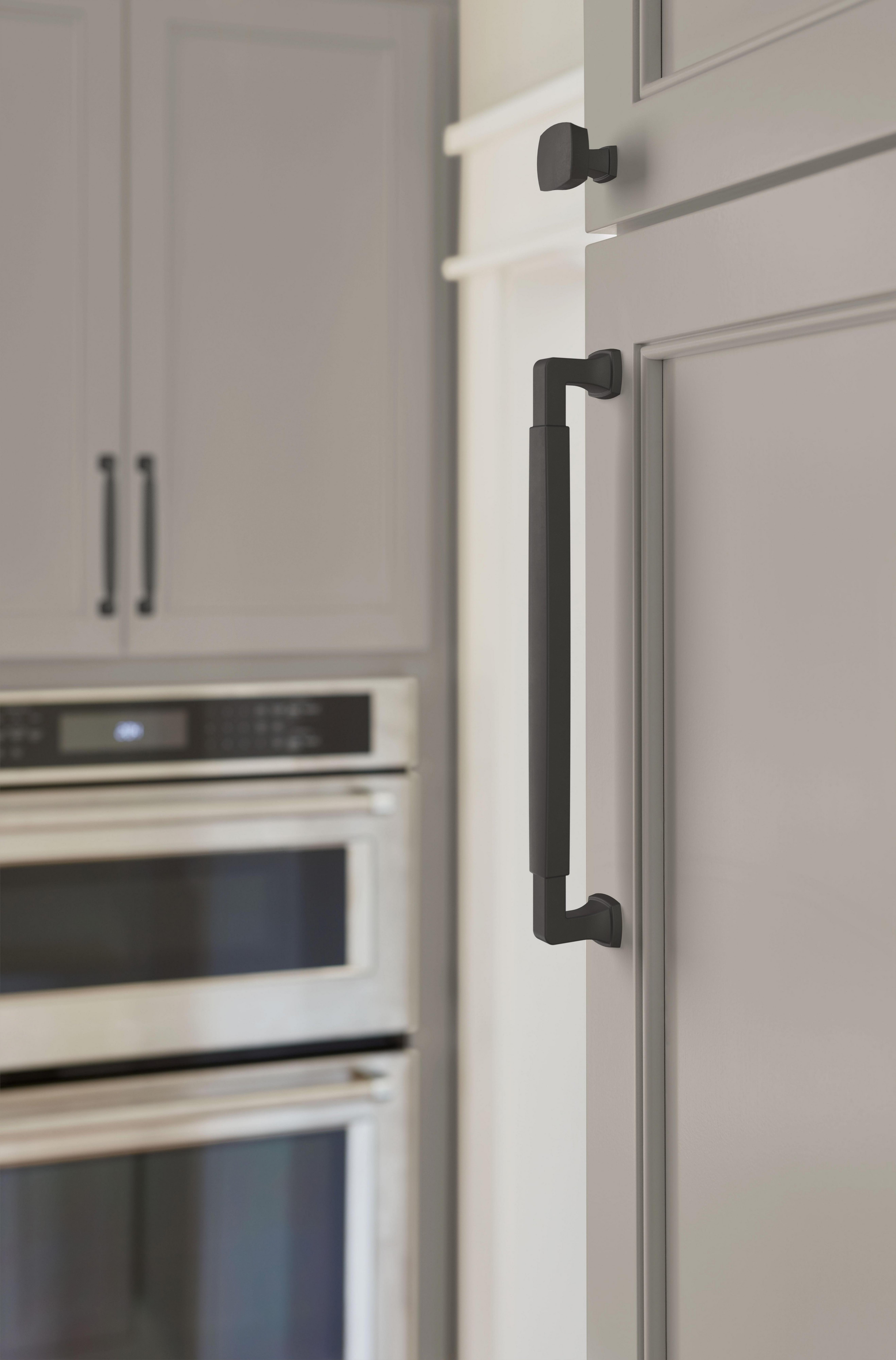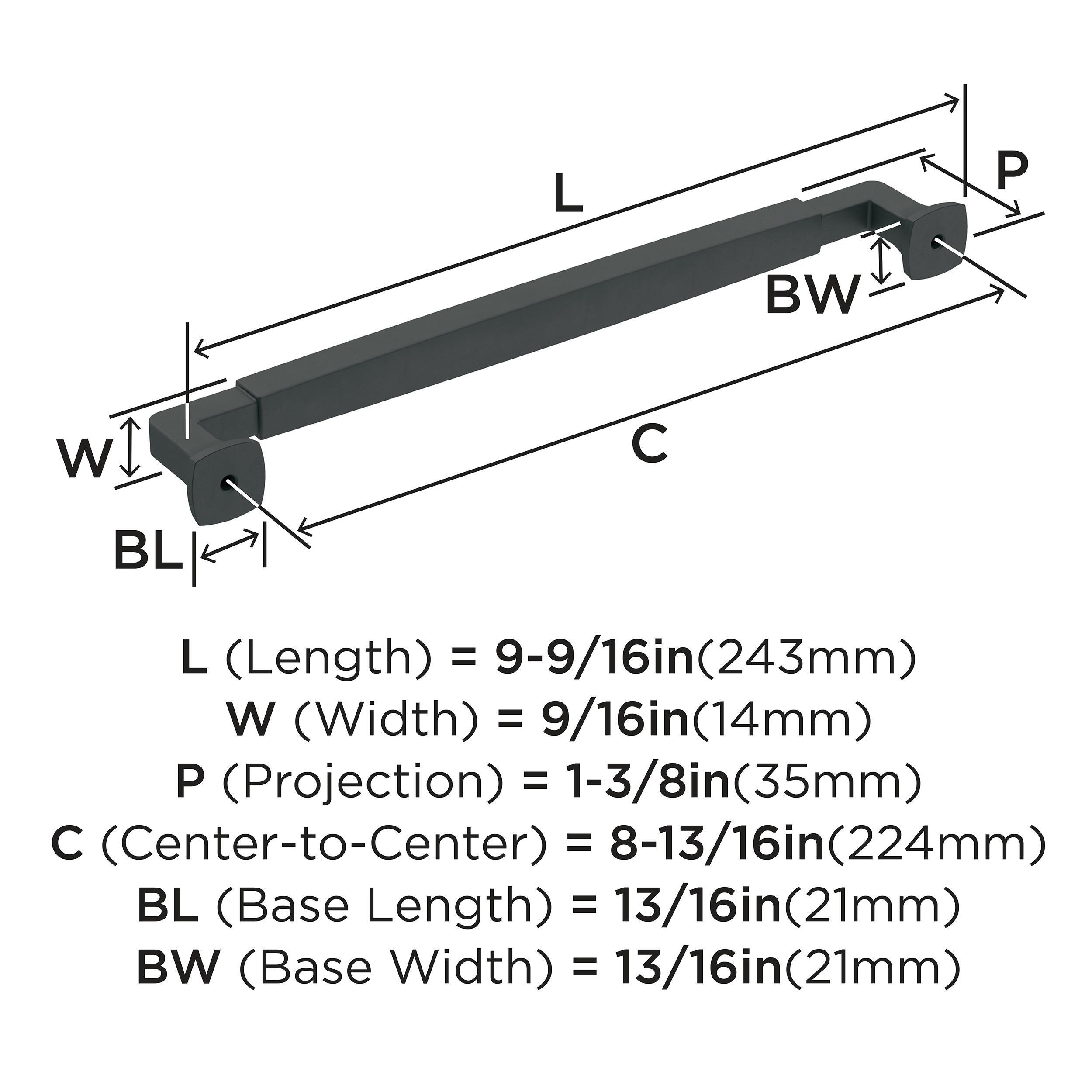 The Amerock Stature 8-13/16 in. Center-to-Center Matte Black Cabinet Pull is finished in matte black matte. Stately and substantial, the Stature collection features classic, bold designs and barrel-style pulls that are underlined with timeless appeal.