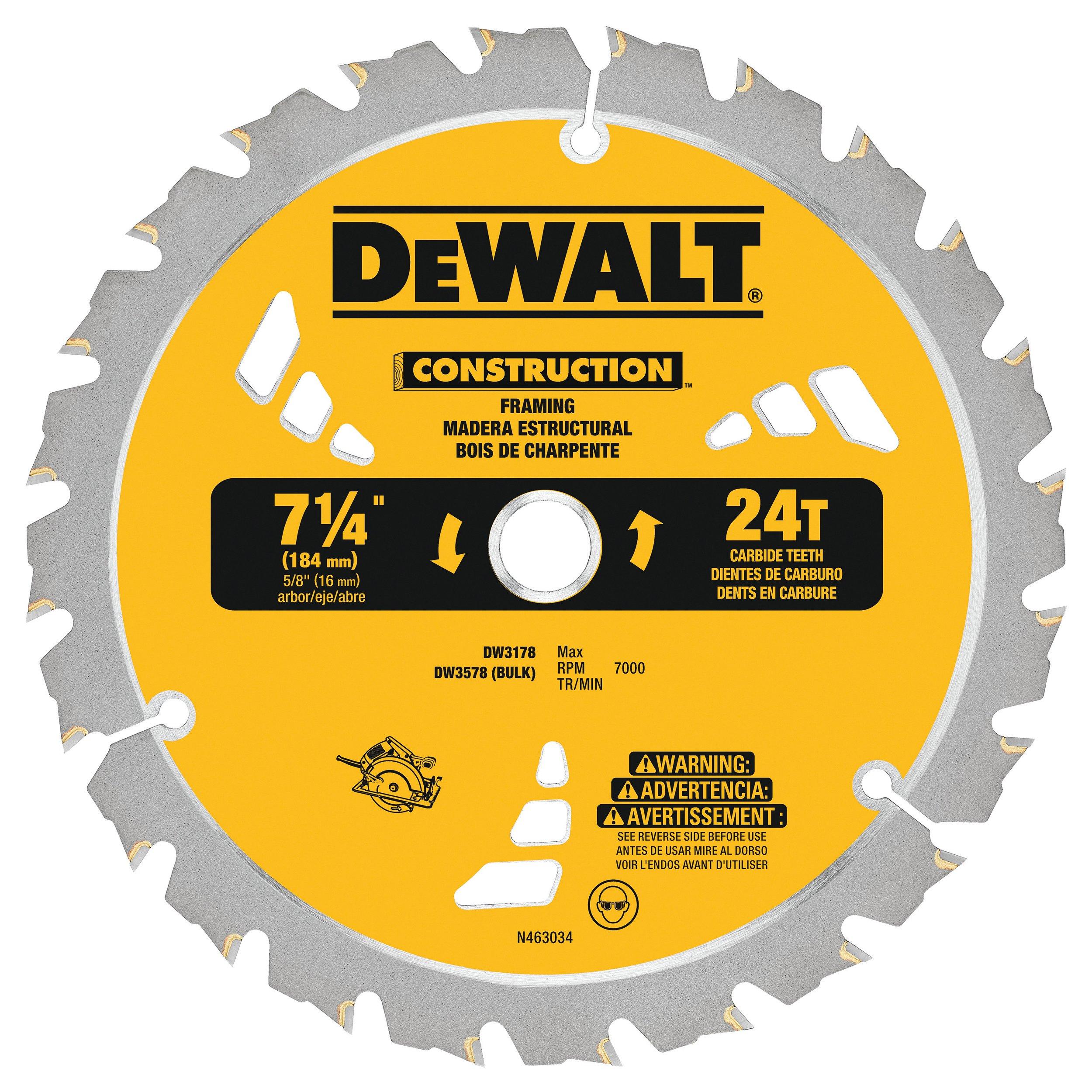 Floor/WallFeaturing tungsten carbide teeth for maximum durability and a thin kerf for fast, smooth cuts, DeWalt 7 1/4in. 24T Thin Kerf Framing Saw Blade powers through a variety of building materials with ease. Ribbed heat vents allow blades to run at cooler temperatures, reducing blade flexing and binding. Anti-stick coating minimizes friction and gum-up.•Tougher tungsten carbide stays sharper longer•Specially formulated anti-stick coating minimizes friction and gum-up for smoother cuts•Thin kerf for fast and smooth cutting action•Ribbed heat vents allow blade to run cooler, reducing blade flexing and binding•Blade feature 5/8" arbor with diamond knock-out