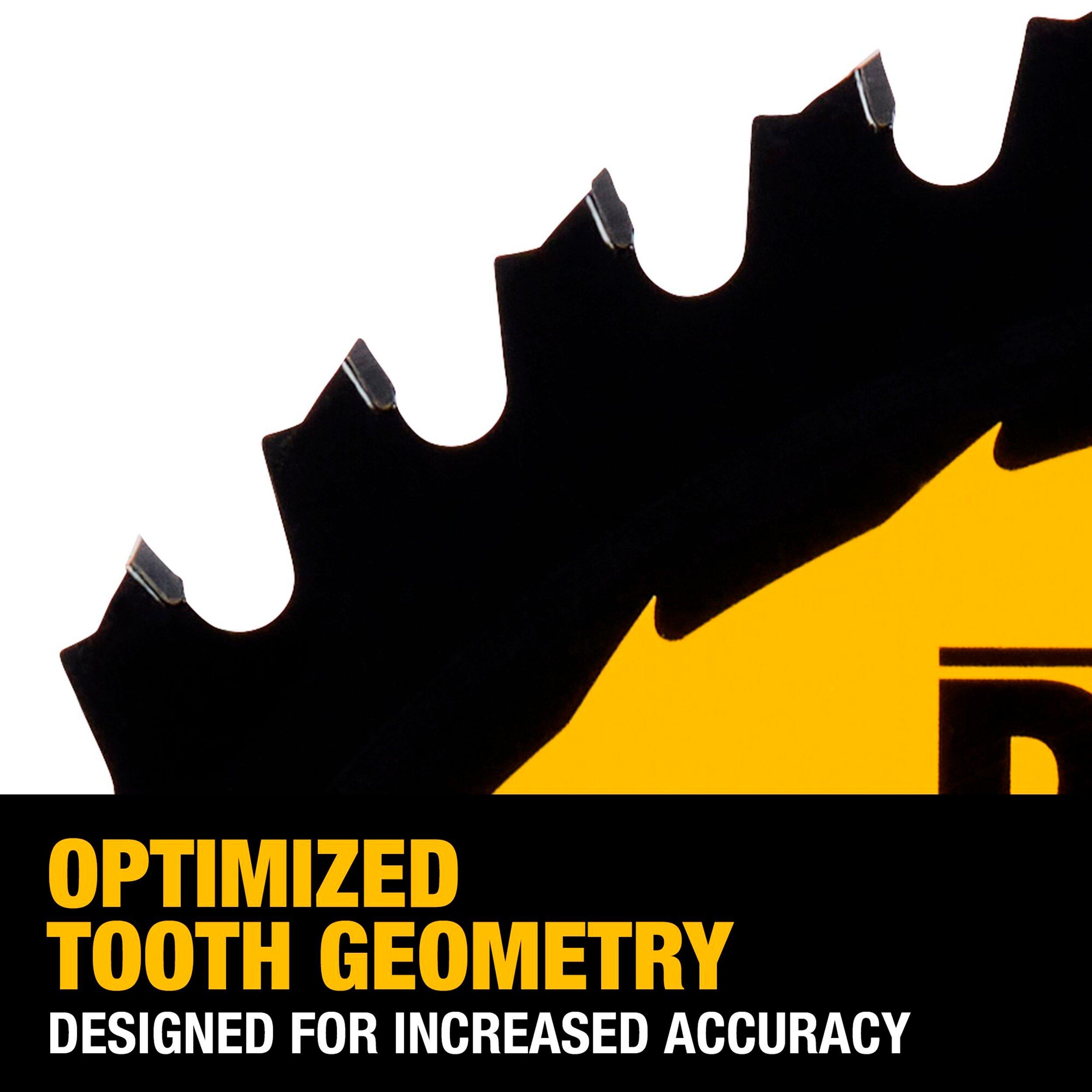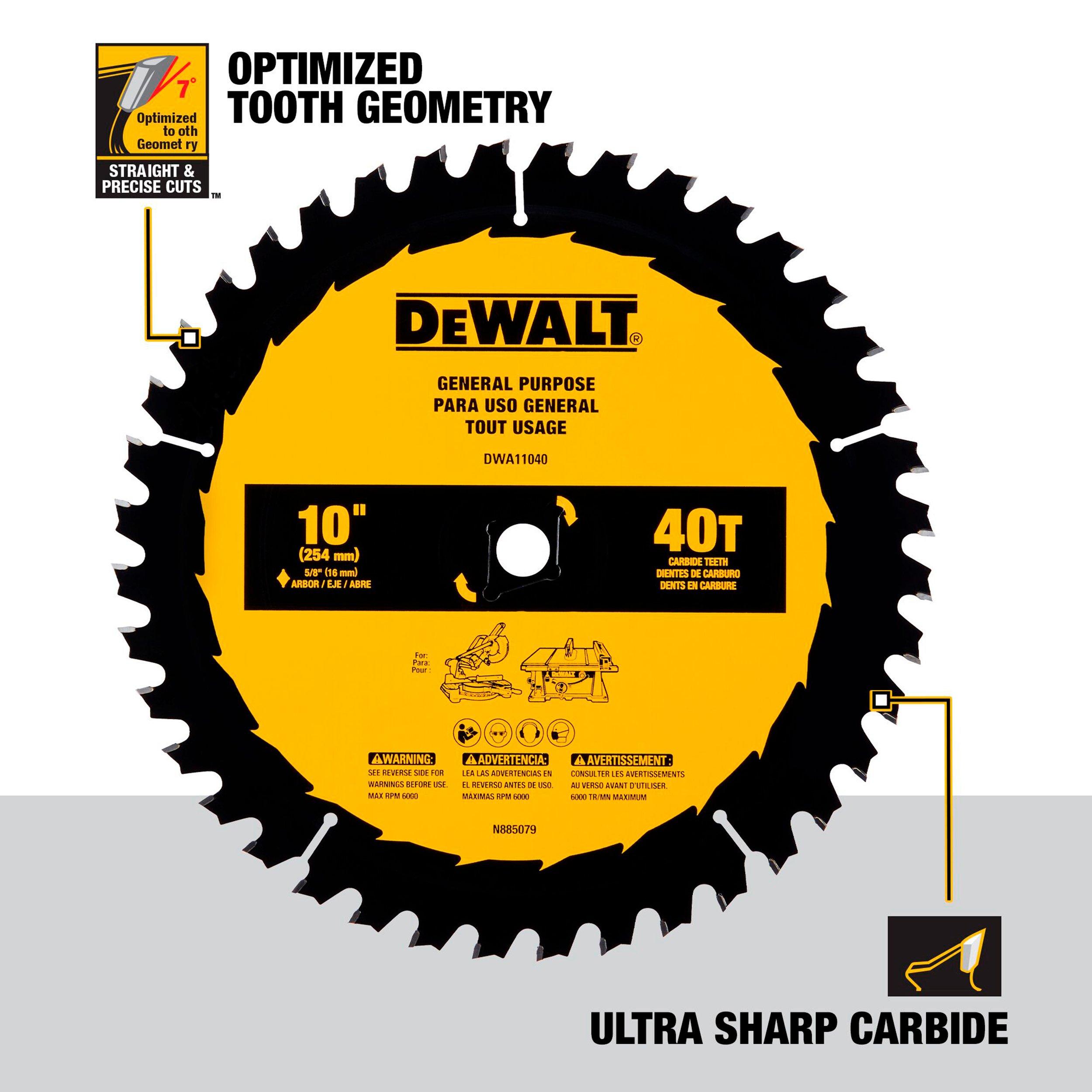 NONEMake clean cuts with the DeWalt 10in. 40T Saw Blade This blade features optimized tooth geometry, and ultra-sharp carbide tipped teeth for crisp, clean cutting. Manufactured to exceed expectations as you cut, the blades are specifically designed by tooth count for increased life and performance.