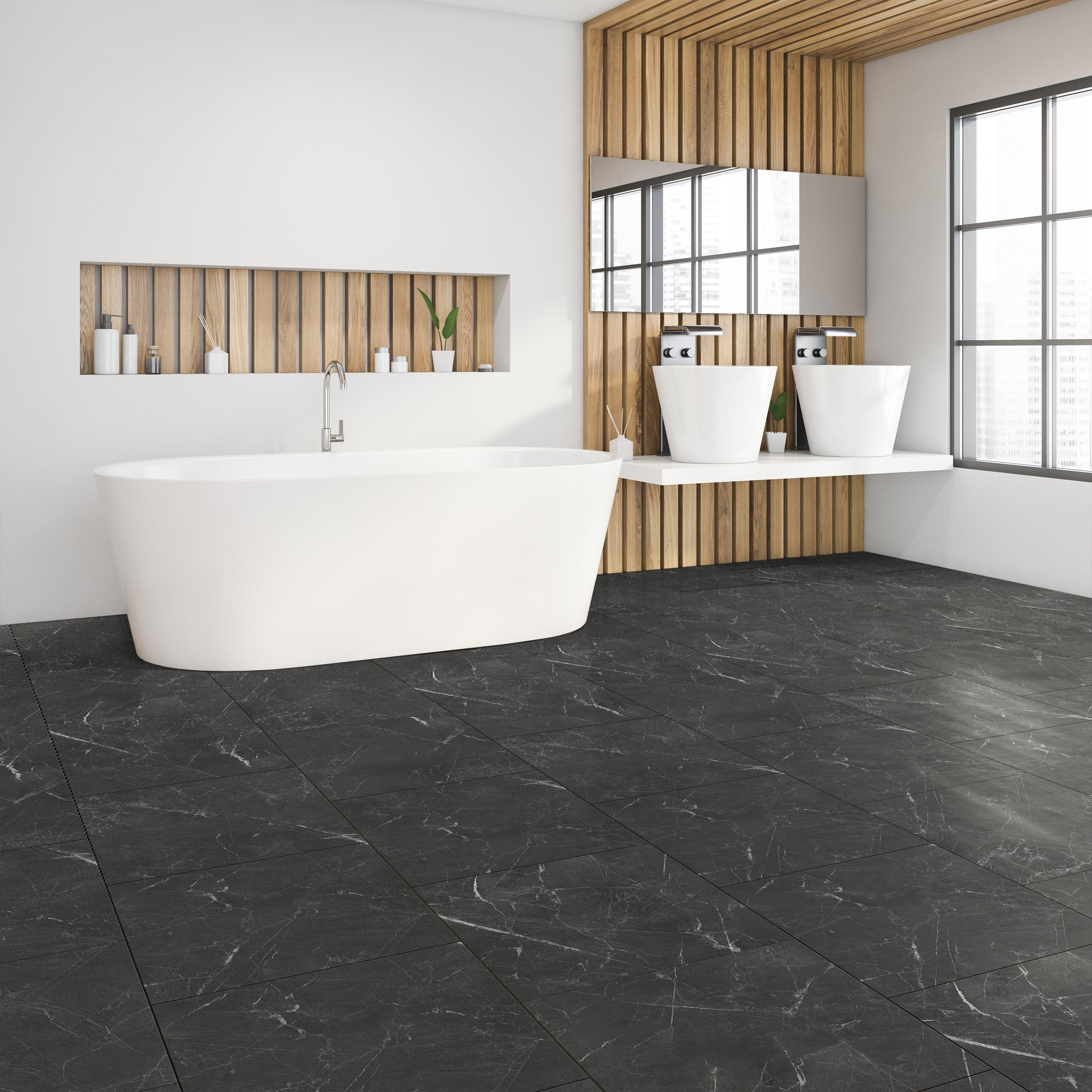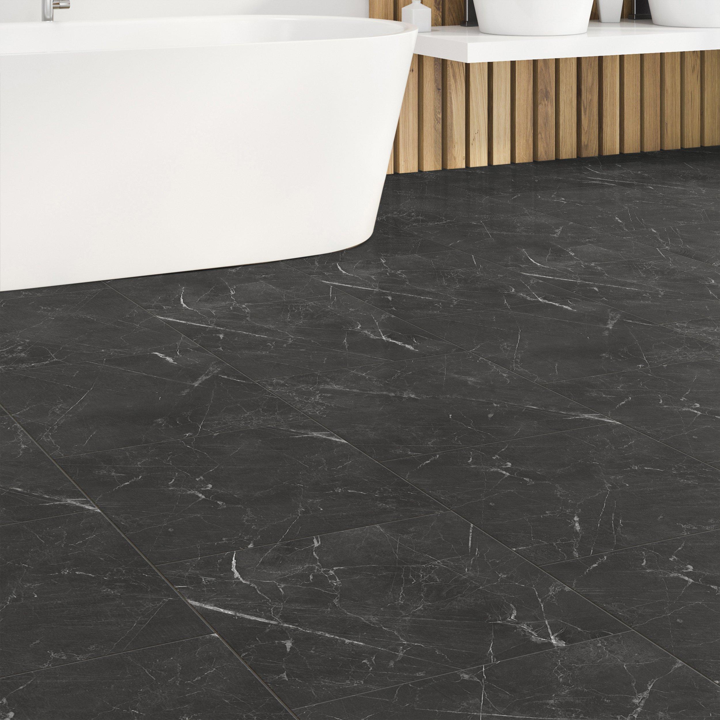 Luxury vinyl flooring is 100% waterproof and stands up to most anything life throws its way! 6mm x 18in x 36in DuraLux Performance Nero Marquina Waterproof Rigid Core Luxury Vinyl Tile- Foam Pad is a highly durable and waterproof flooring option that is suitable for any room in the house, including basements, sunrooms, and full bathrooms. Plus, its rigid stone-based core makes each plank dent-resistant and scratch-resistant, so DuraLux Performance is perfect for high-traffic areas.