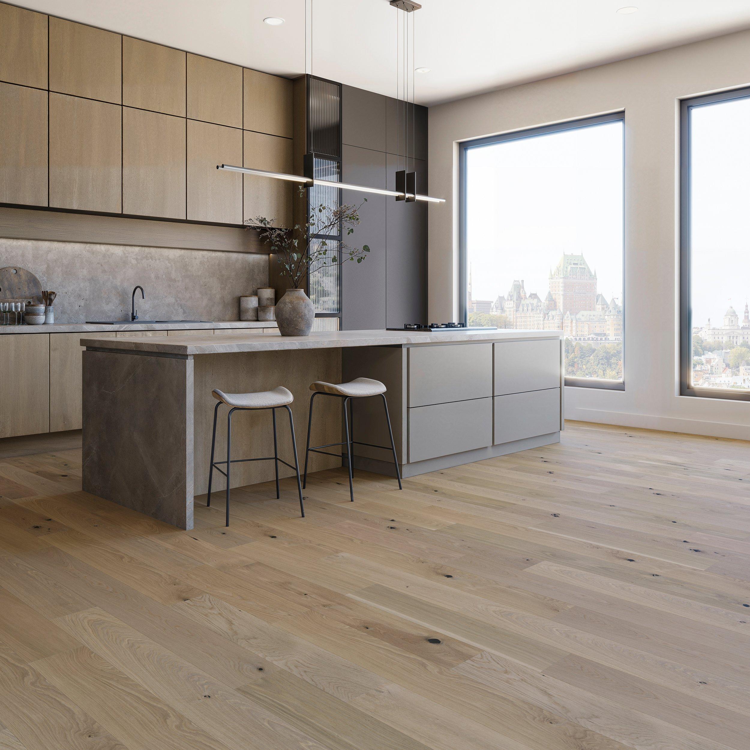 This 3/4 x 7 1/8in. Gabby White Oak FlexTech Handscraped Engineered Hardwood comes in a wire-brushed finish with a 35 year residential warranty.