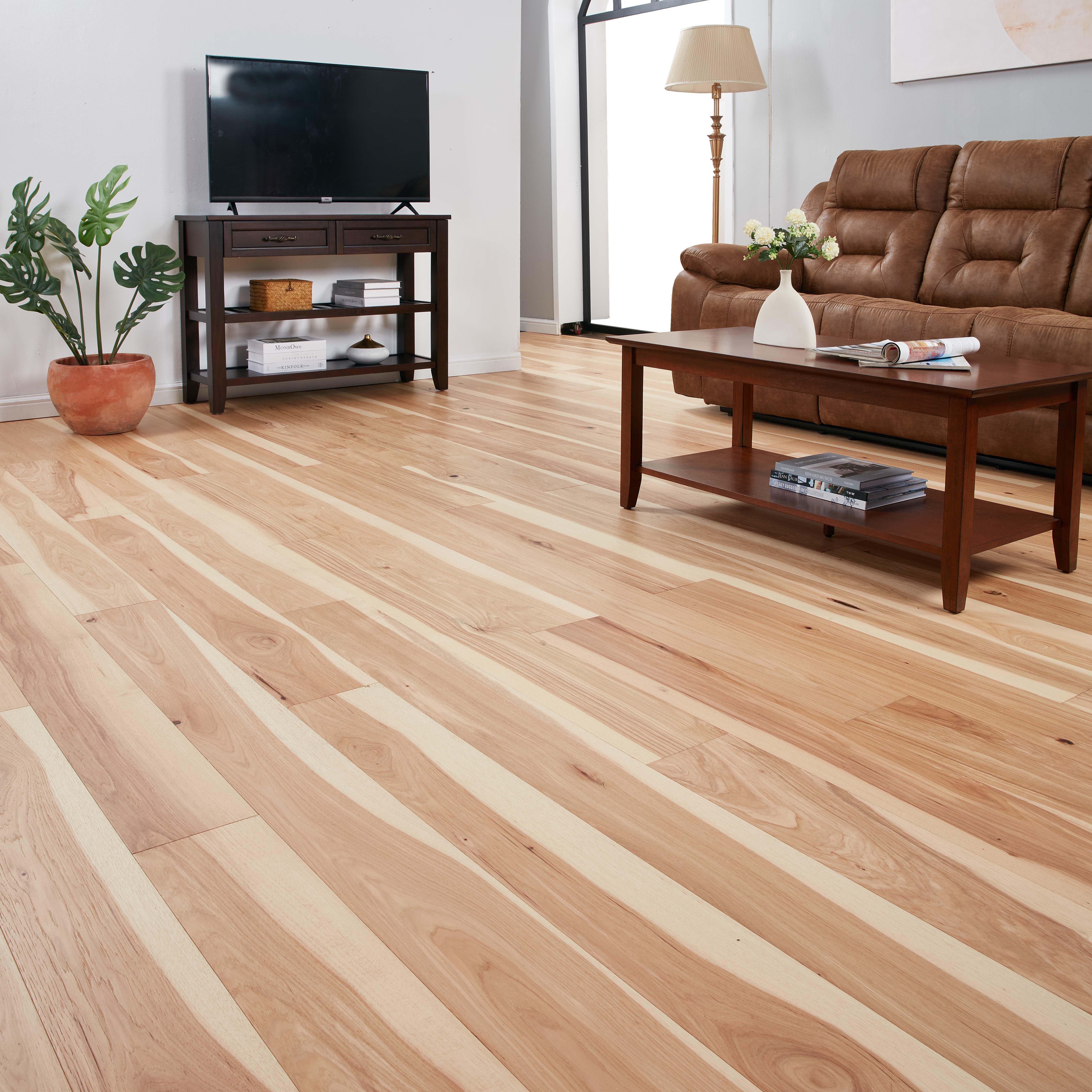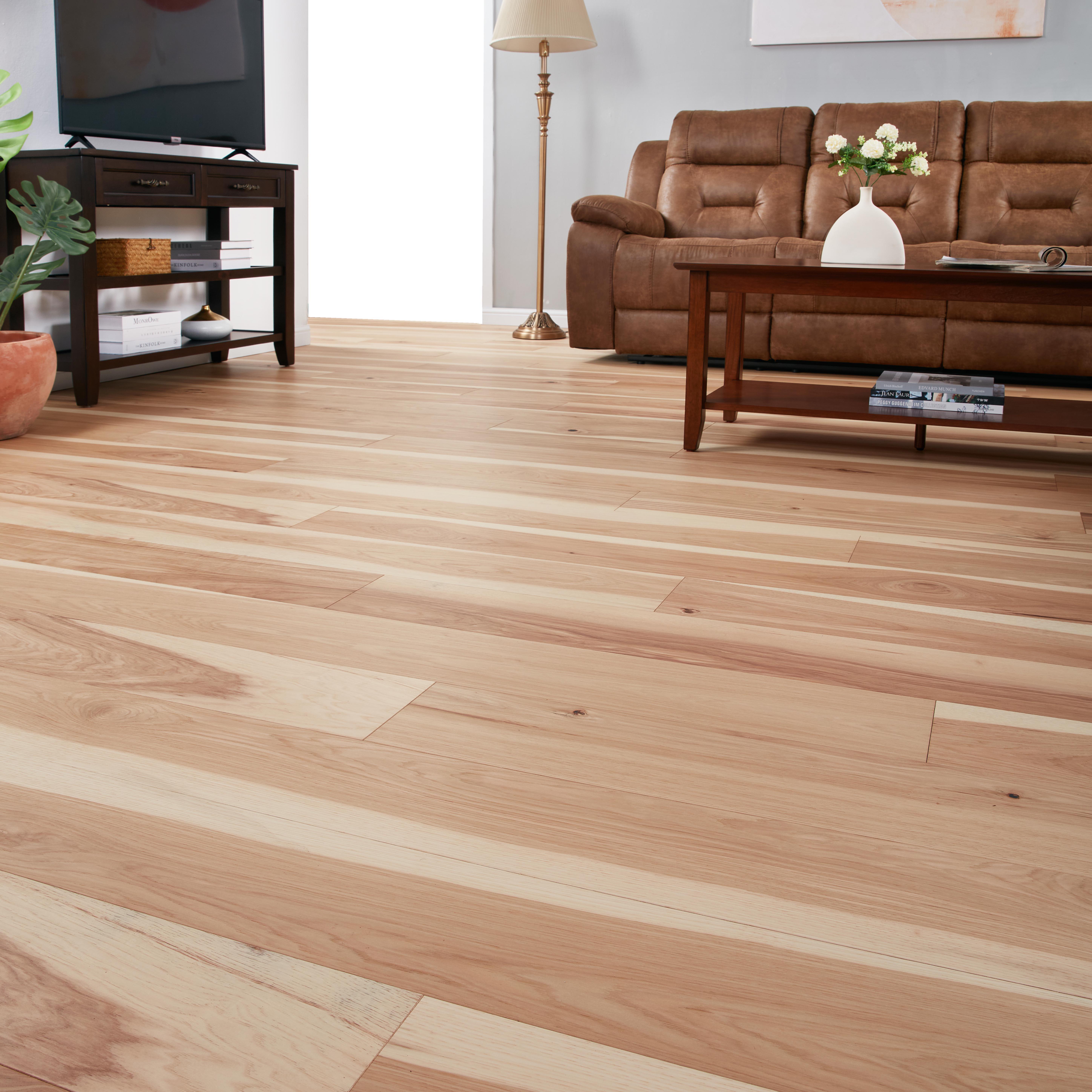 Hickory flooring has one of the most distinct domestic hardwood looks. Sinuous graining and mineral deposits run through each plank of hickory hardwood, creating a truly unforgettable look with its color variation. Hickory is one of the hardest types of wood flooring available, making it incredibly durable and resistant.