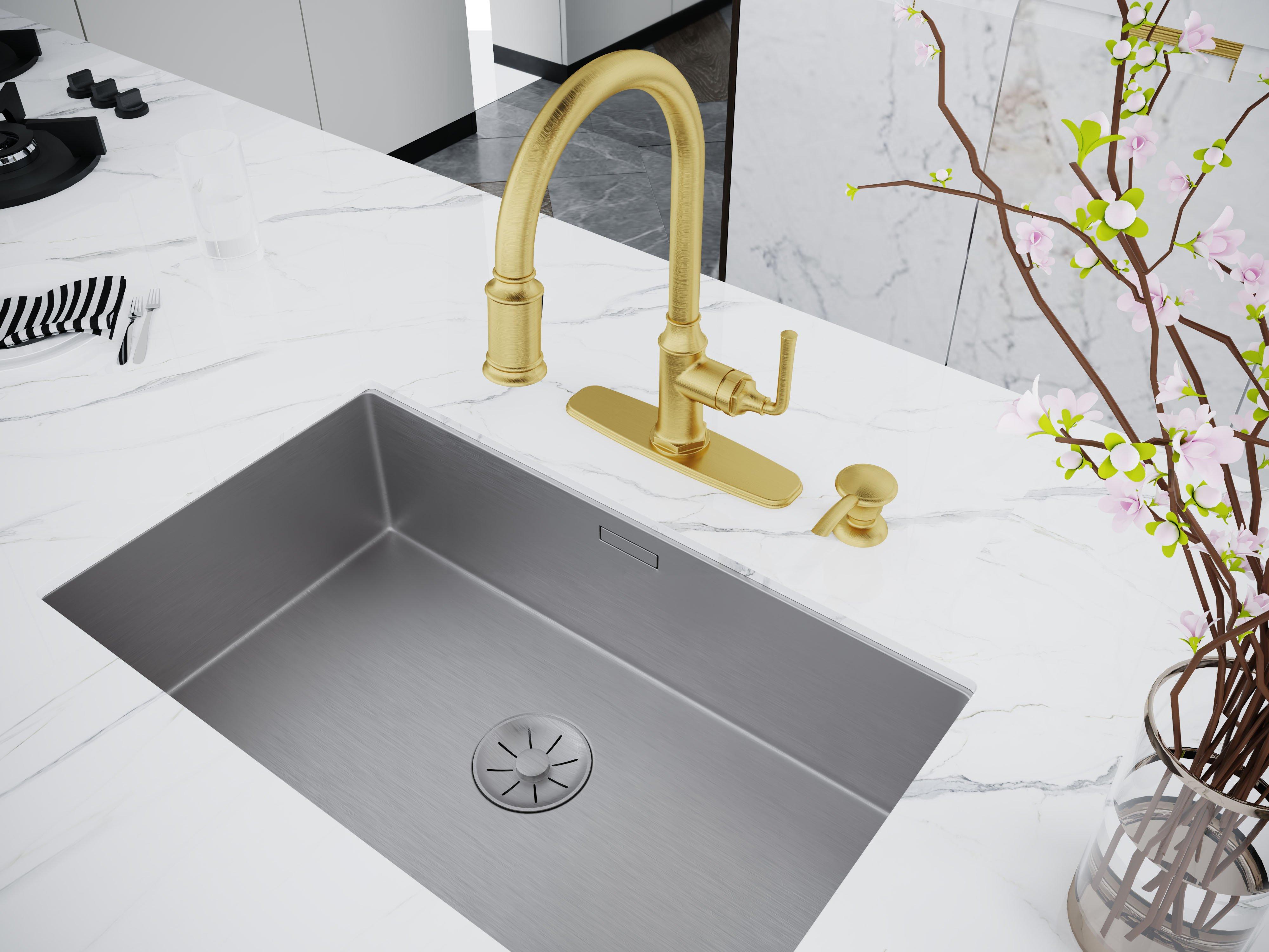 Accent your bathroom with this 11 x 17in. Tano Pull Down Brushed Gold Kitchen Faucet in gold/ yellow. Our varied selection of bathroom accessories is sure to offer just the right finishing pieces for your bath or shower project. We offer corner shelves, towel bars, soap dishes and more in a variety of materials, colors, and finishes. *Packaging includes the following installation materials: mounting plate, allen wrench, anchors and screws.