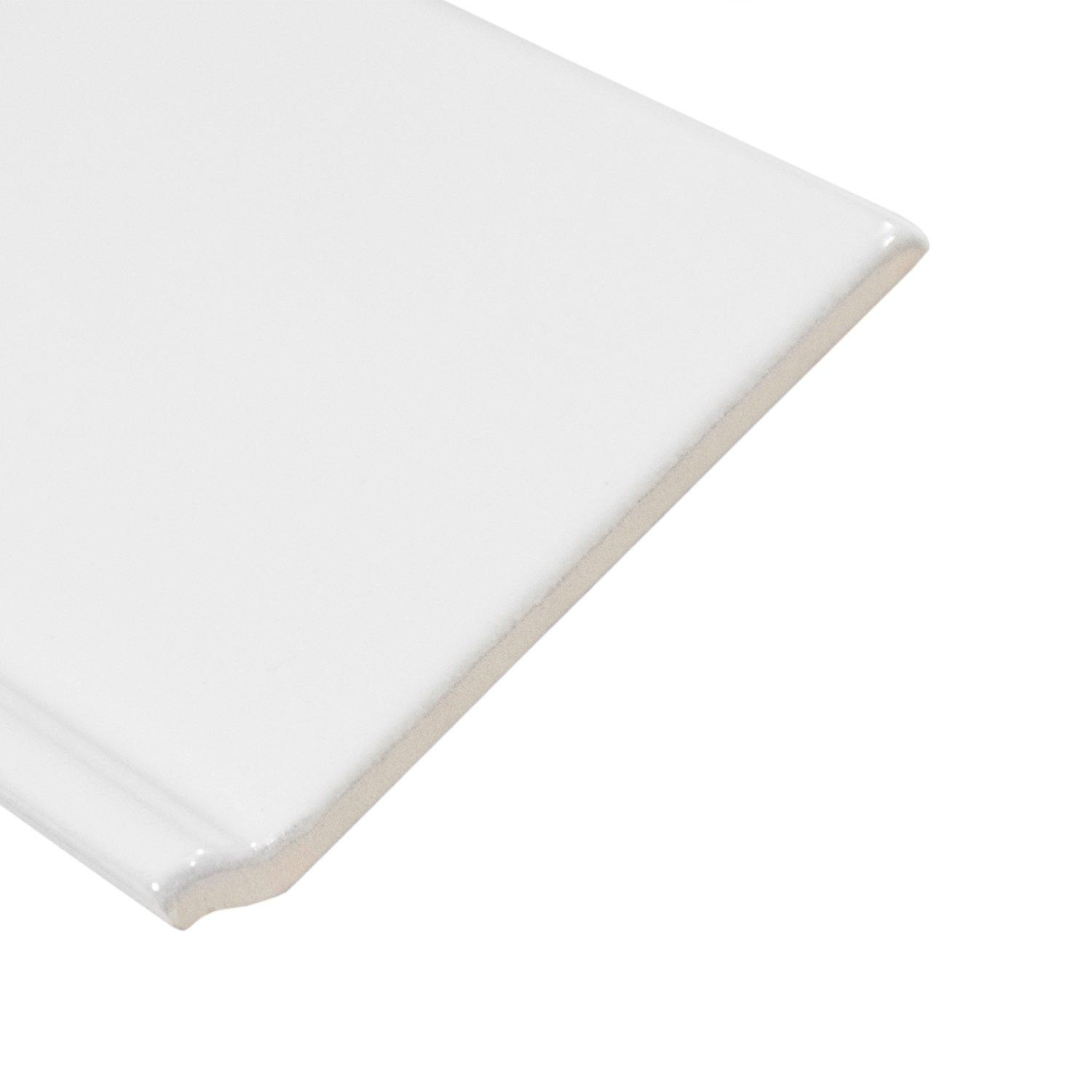 This 4 1/4 x 6 Bright White Ice Left Corner II Wall Tile in white reflects light and adds depth, and has a high gloss finish.