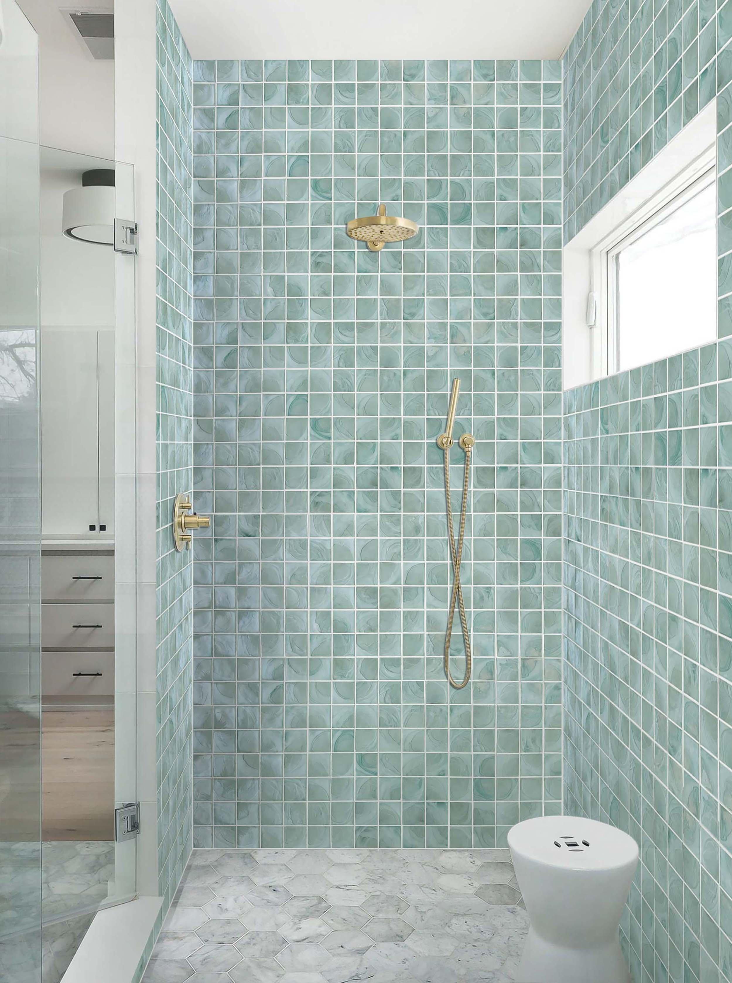 Add an accent to your design with this 12 x 12 square Antigua Square Hot Glass Mosaic. The green color will enhance any space.