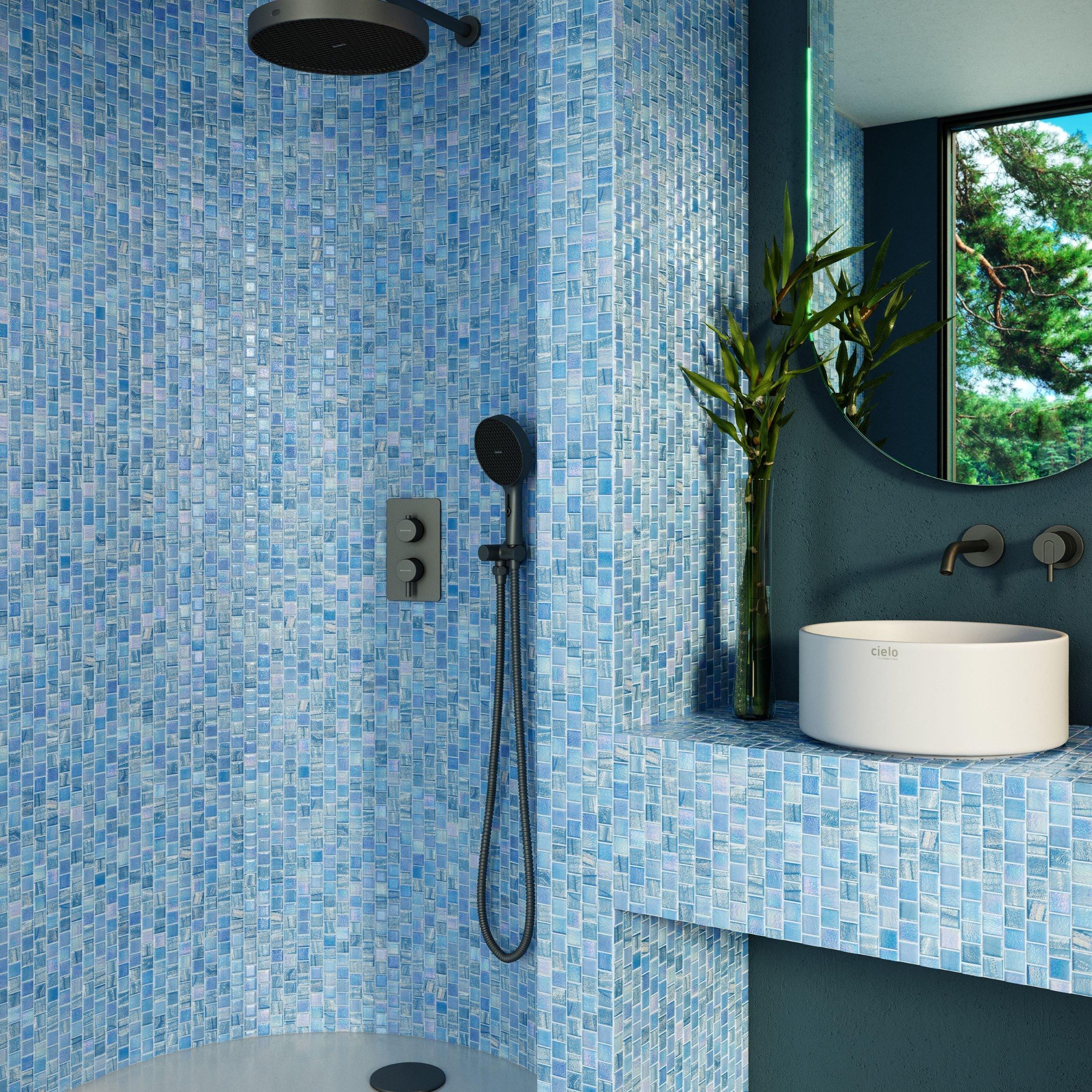 Fusion Light Blue Square Glass Mosaic is a stunning addition to any bathroom or kitchen space. This high gloss wall tile offers both beauty and durability, making it perfect for creating a striking backsplash or an elegant shower area.