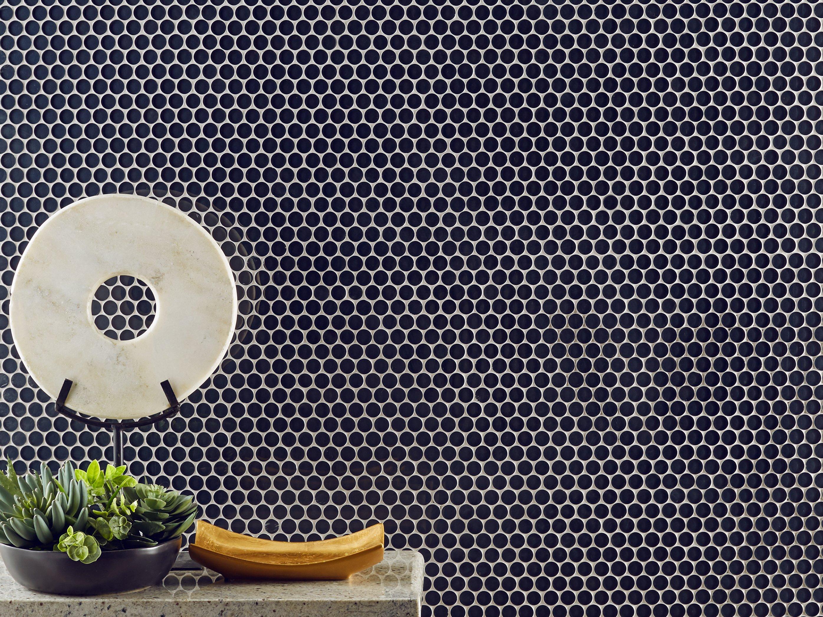Refresh your home's design with this 12 x 12 circle Newbury Glass Penny Mosaic in blue.
