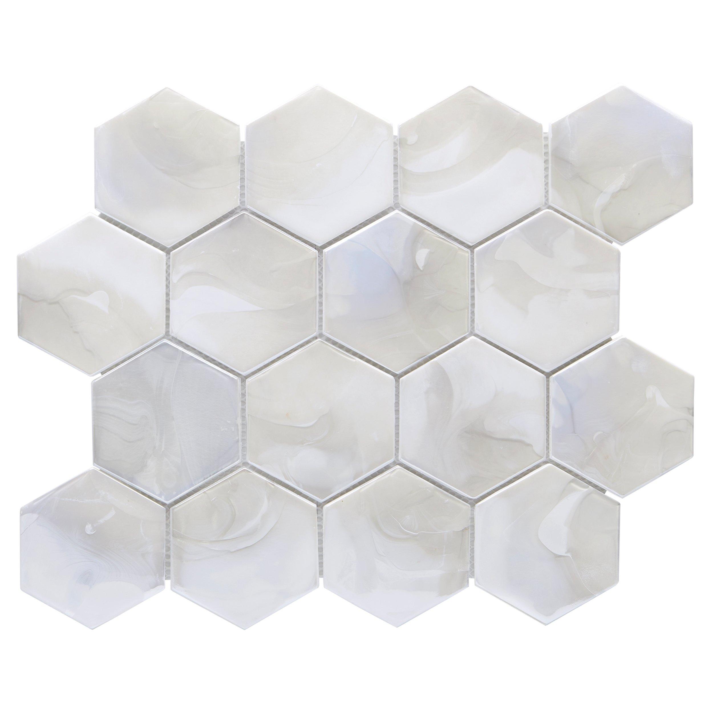Add an accent to your design with this 11 x 13 hexagon & octagon Perla Hot Glass Hexagon Glass Mosaic. The white color will enhance any space.