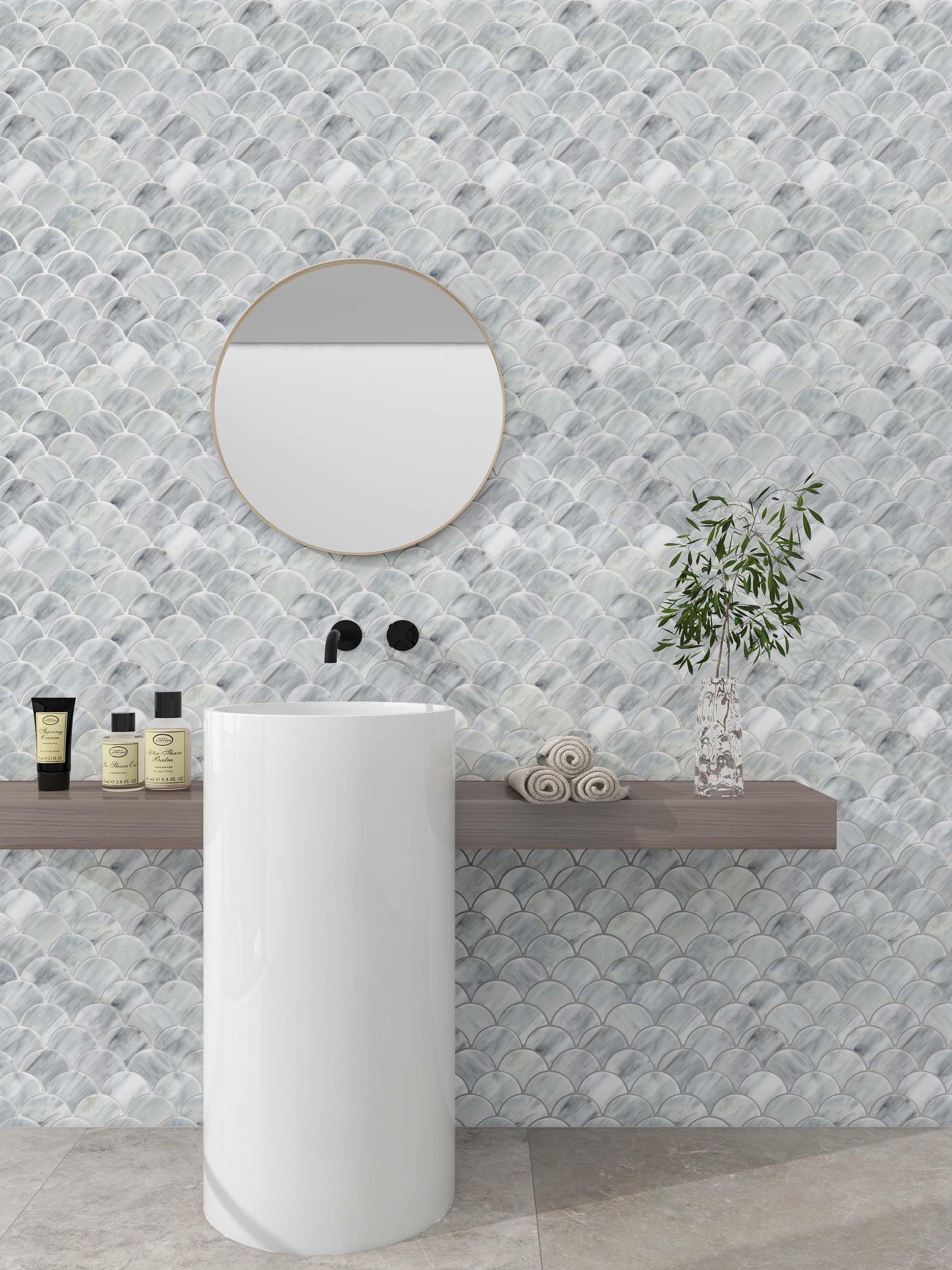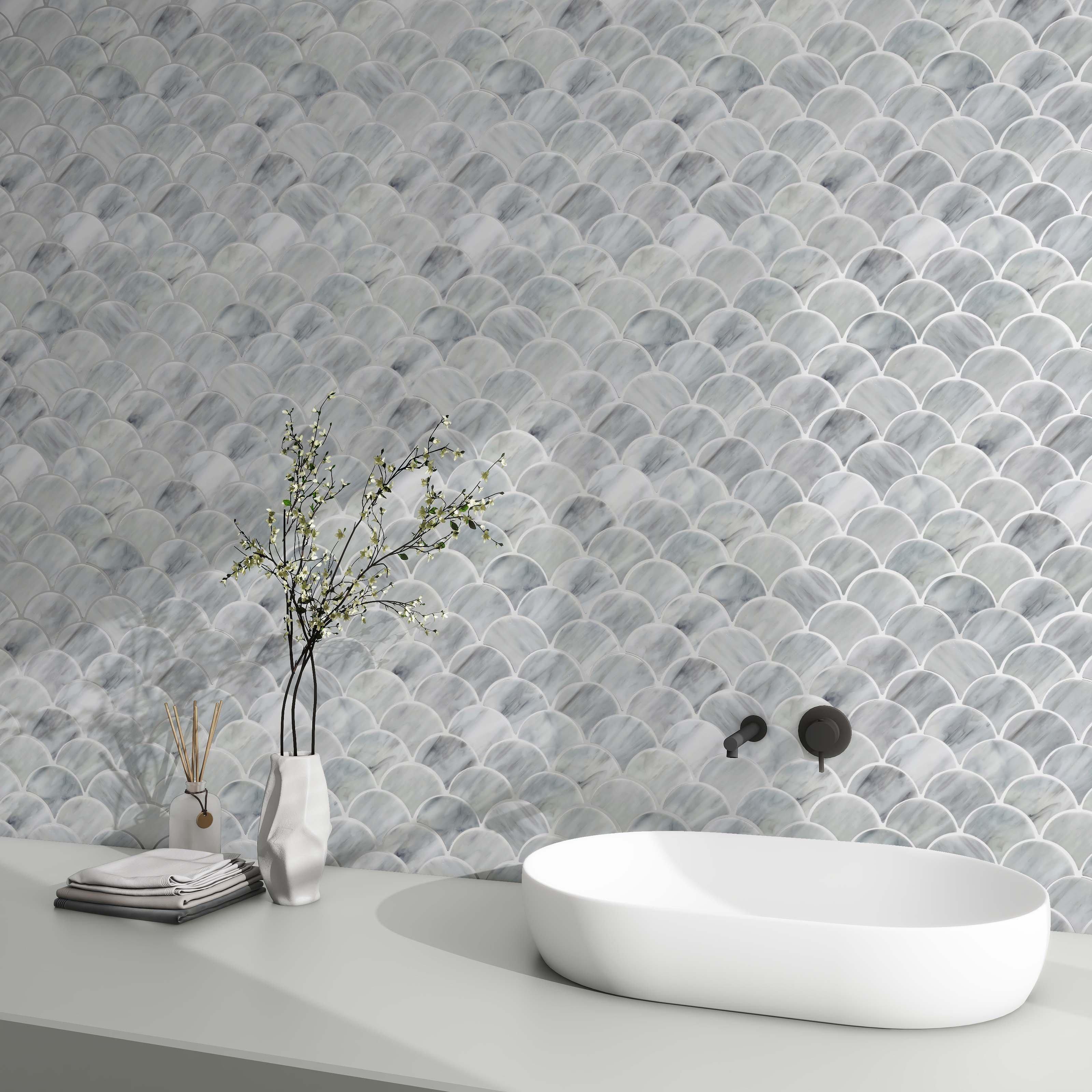 Add an accent to your design with this 13 x 15 fan Reva Art Glass Fan Mosaic. The gray color will enhance any space.