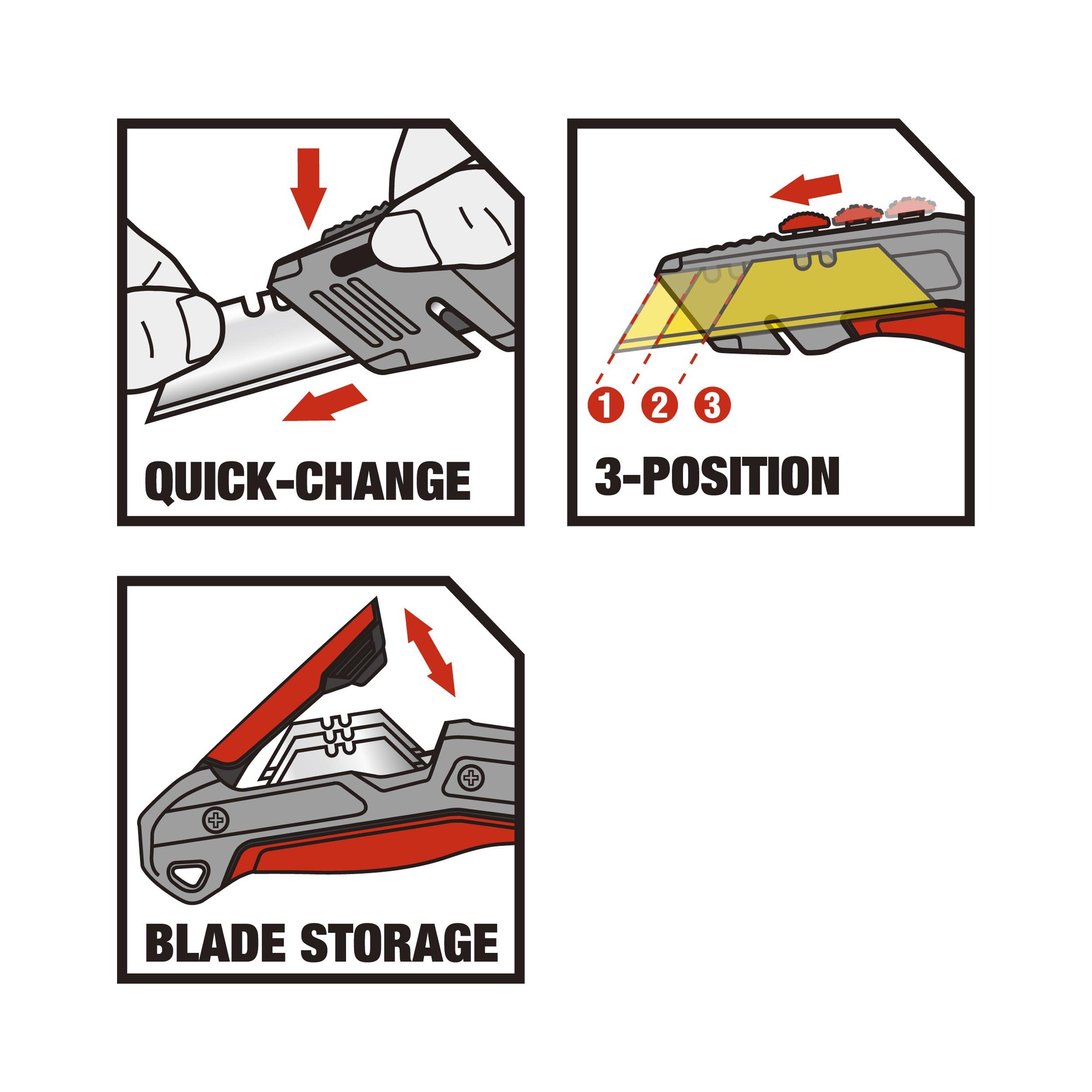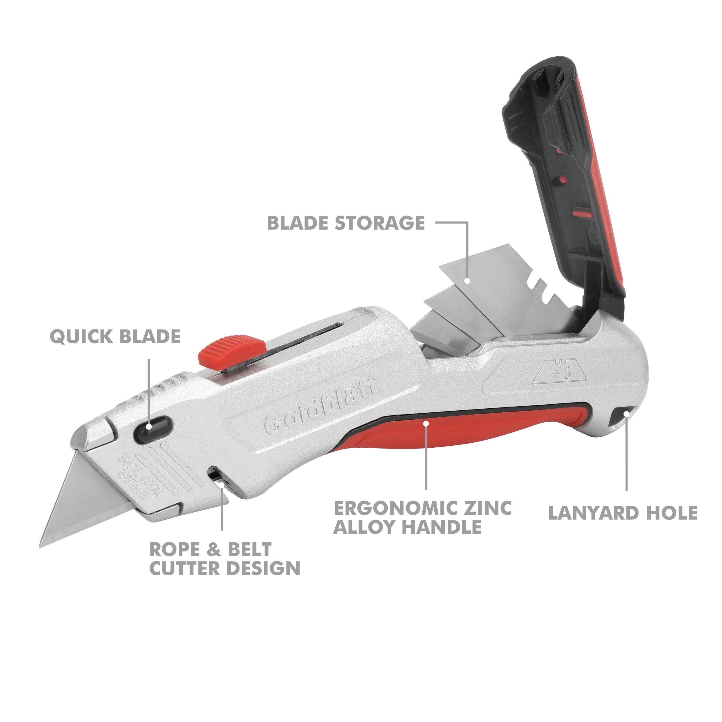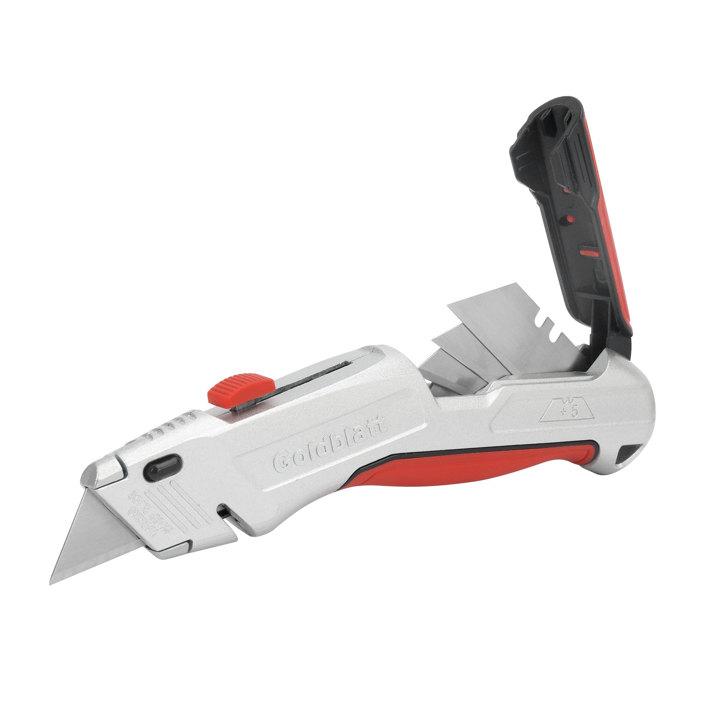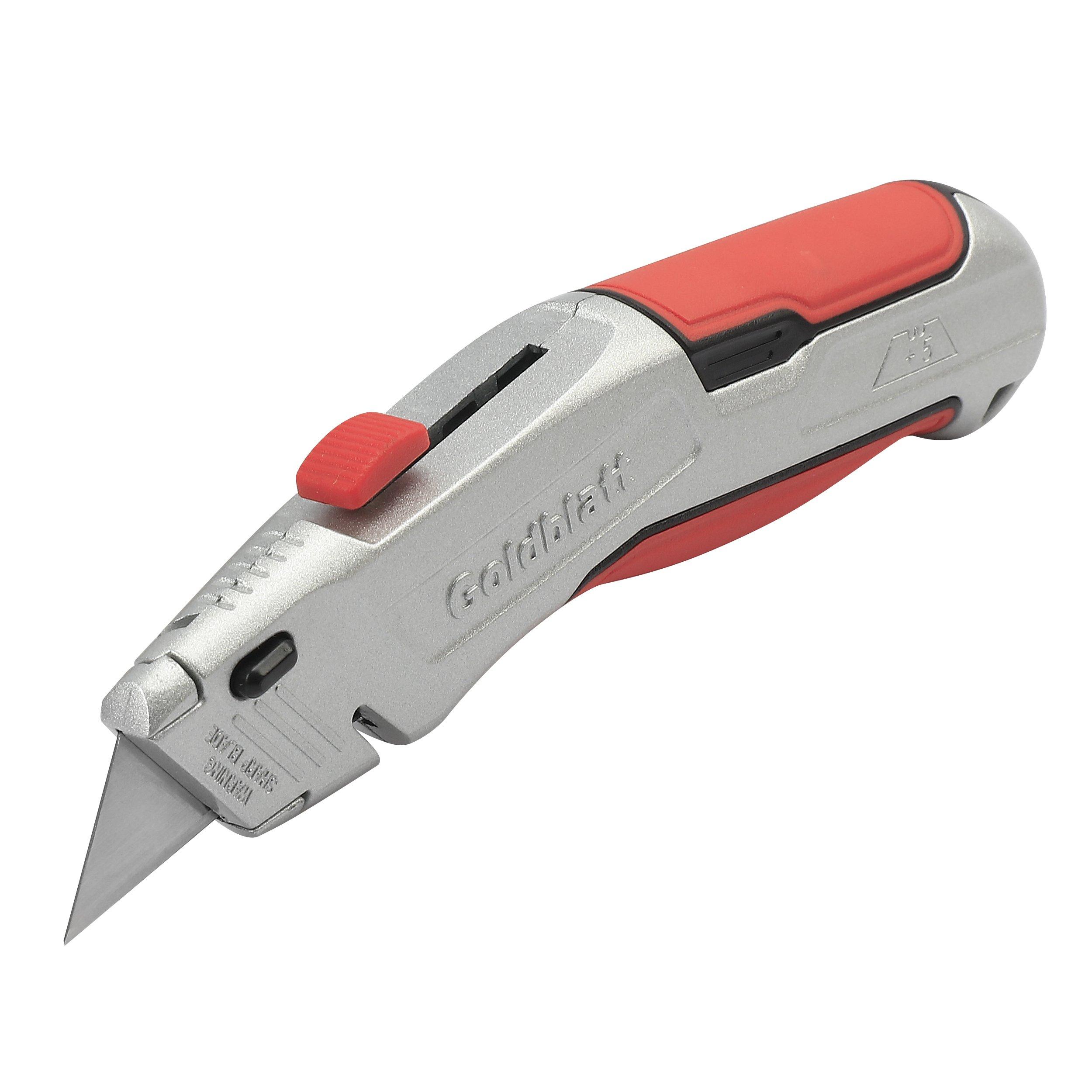 Lifetime LimitedThis new unique Goldblatt® utility knife features a diecast zinc alloy construction, which is designed for maximum jobsite toughness and durability. It incorporates our quick-change blade system that greatly simplifies the chore of replacing blades. The retractable blade design offers variable cut depth. Soft grip handle provides comfort and anti-slip cutting. Works with most standard utility blades.