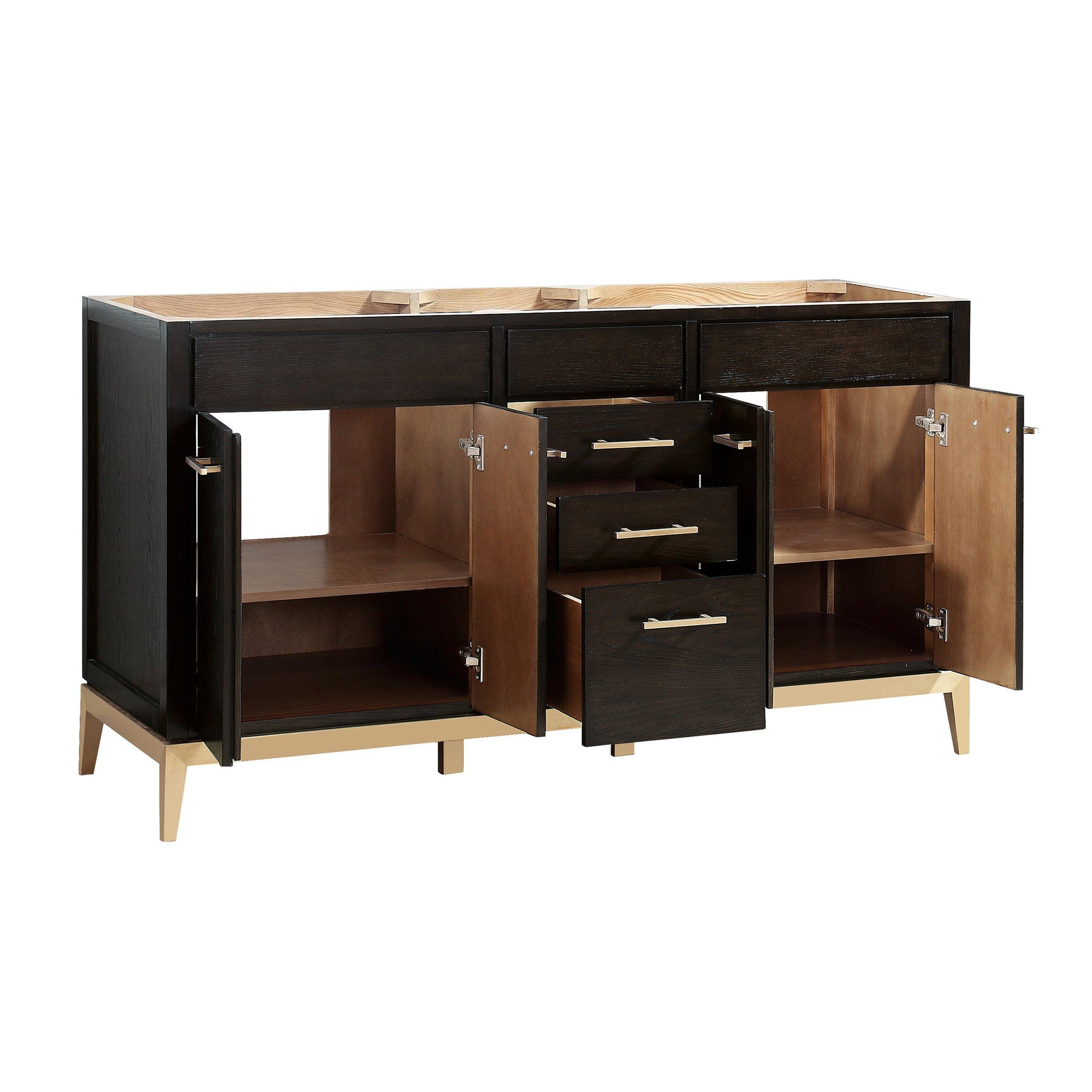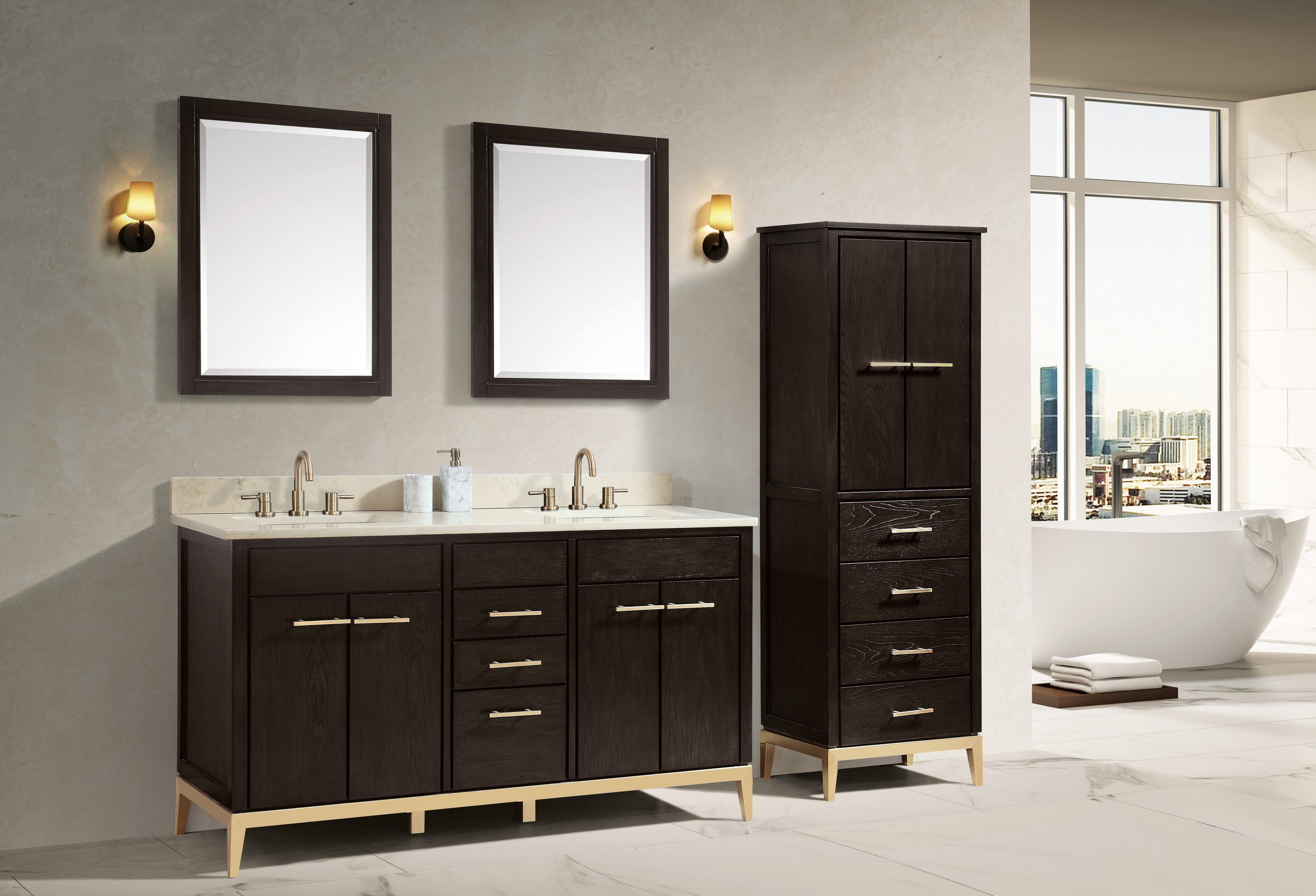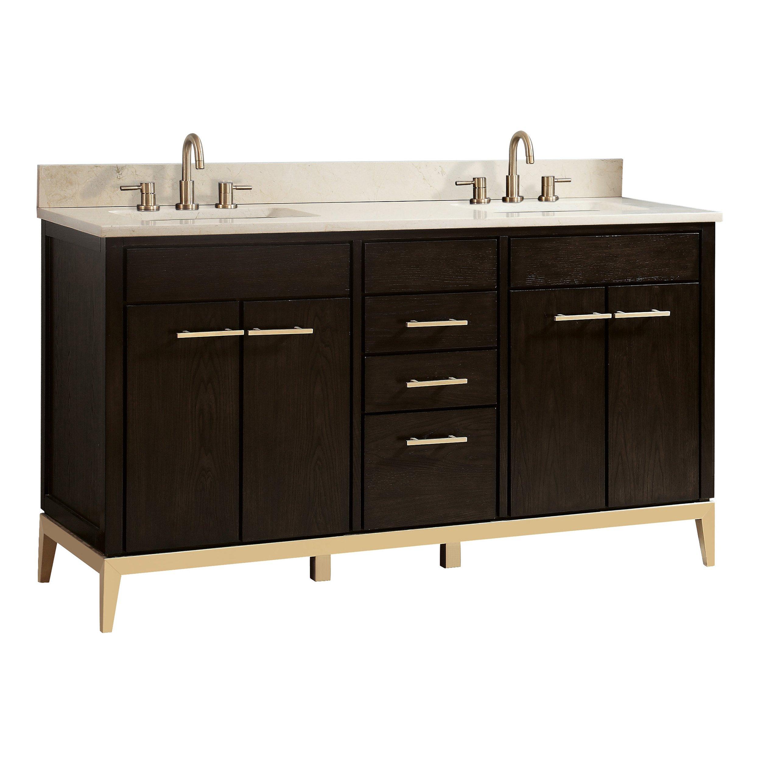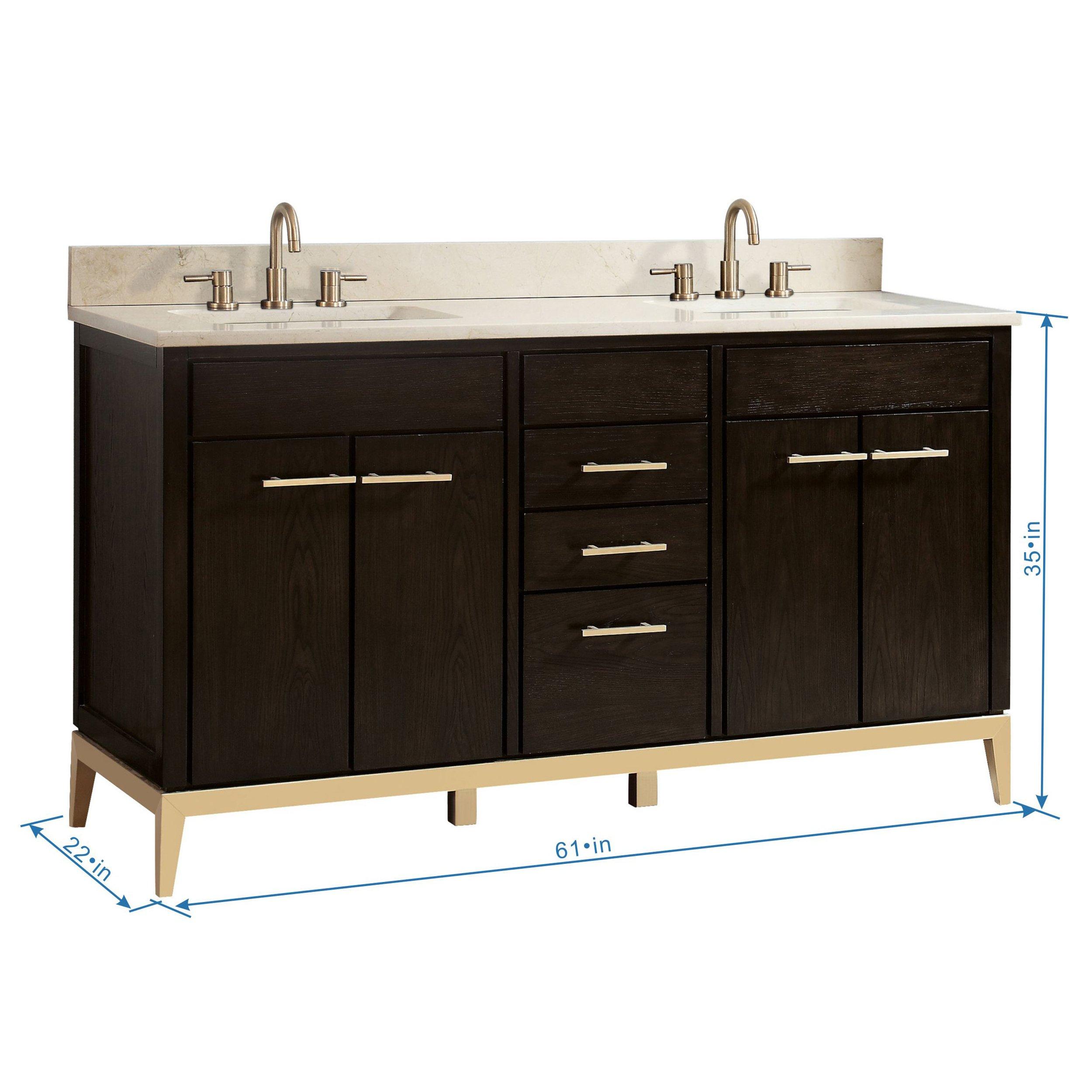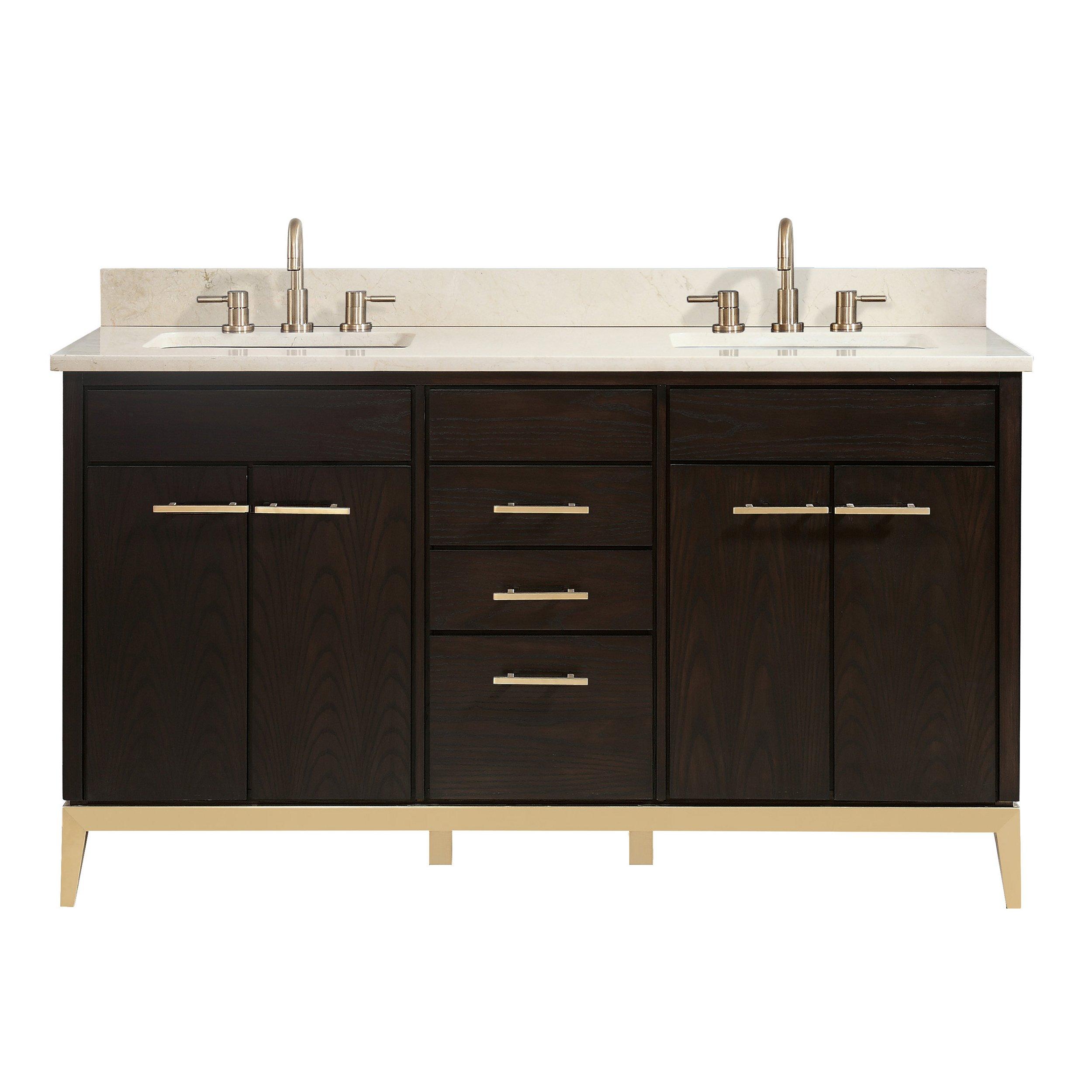 The Hepburn 61 in. Vanity with Crema Marfil Marble Top is layered with a sumptuous dark chocolate finish upon the solid ash wood frame. Added premium materials include a sturdy matte gold base, matte gold hardware and soft-close glides and hinges. The 61in. vanity combination includes a Crema Marfil marble top and dual rectangular undermount sinks. Match the vanity with the coordinating mirror, and Hepburn is sure to delight for years to come.• Freestanding Installation• Soft Closing Drawers and Doors• Rectangular Undermount Sinks• Adjustable Height Levelers• Warranty: 1 Year Limited• Faucet Sold SeparatelyVANITY DETAILS• Cabinet Color: Chocolate Brown Stain• Cabinet Materials: Solid Hardwood• Vanity Top Materials: Crema Marfil Marble• Number of Drawers: 3• Number of Doors: 4• Number of Shelves: 2