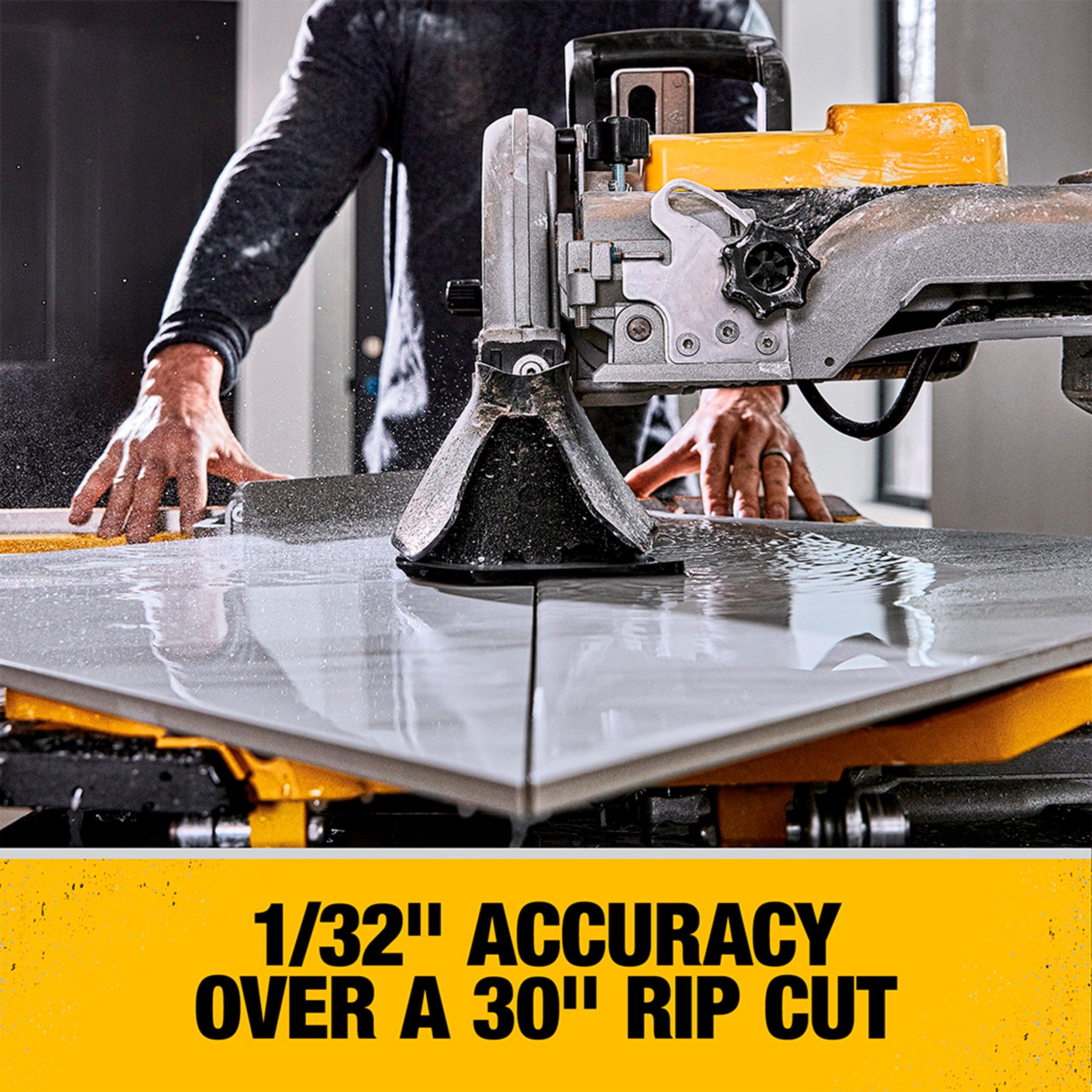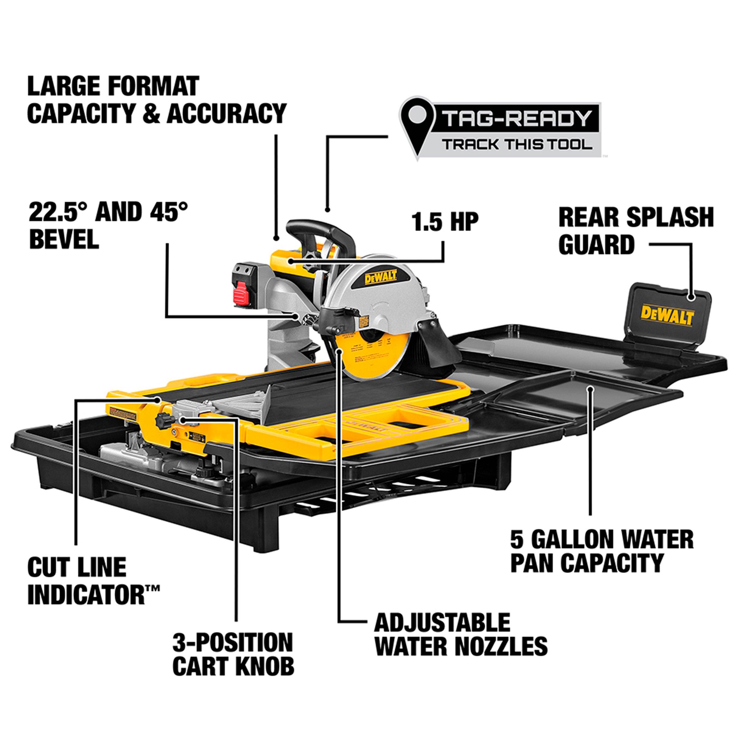 3 YearTackle large format tile cutting applications while remaining accruate with the Dewalt 10in High Capacity Wet Tile Saw. The powerful motor, 18” cutting clearance left of blade, and large format water tray set up allows users to rip 36” x 36” tile in half without a plunge cut. • 1.5 HP MOTOR• LARGE FORMAT CAPACITY• BEVEL CAPACITY• CUT LINE INDICATOR• WATER CONTAINMENT• ADJUSTABLE WATER NOZZLES• 3-POSITION CART KNOB