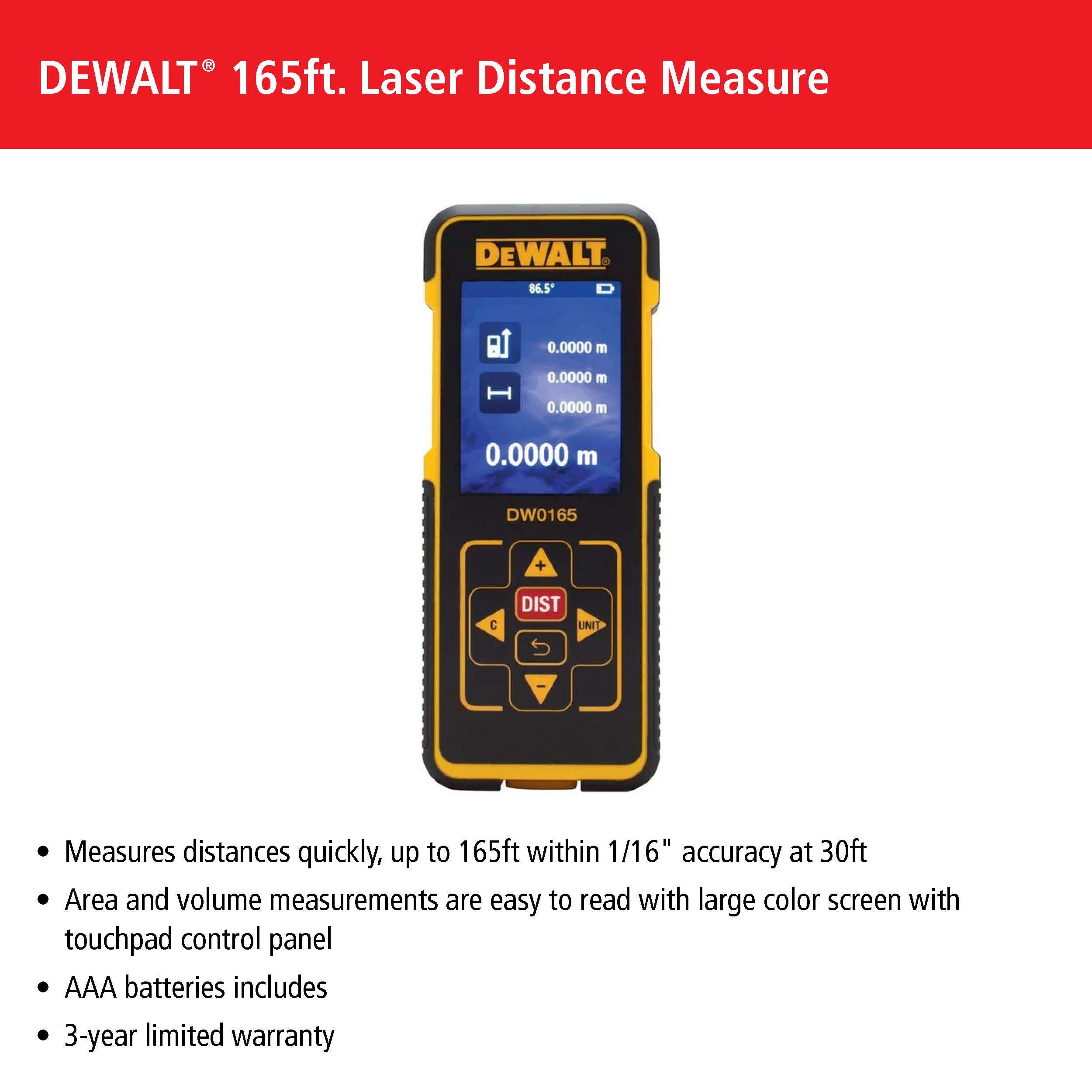 3 YearDW088K Features & Benefits:•Red cross line laser projects bright crossing horizontal and vertical lines for various leveling and layout applications.•Built tough with an over molded housing which can withstand up to a 1 meter drop.•Water and debris resistant with an IP54 rating.•Patented integrated magnetic bracket.•+/- 1/8 in. accuracy at 30 ft.•100 ft range (with detector (sold separately) up to 165 ft. range).•1/4" - 20 thread mount for use with a tripod (sold separately).