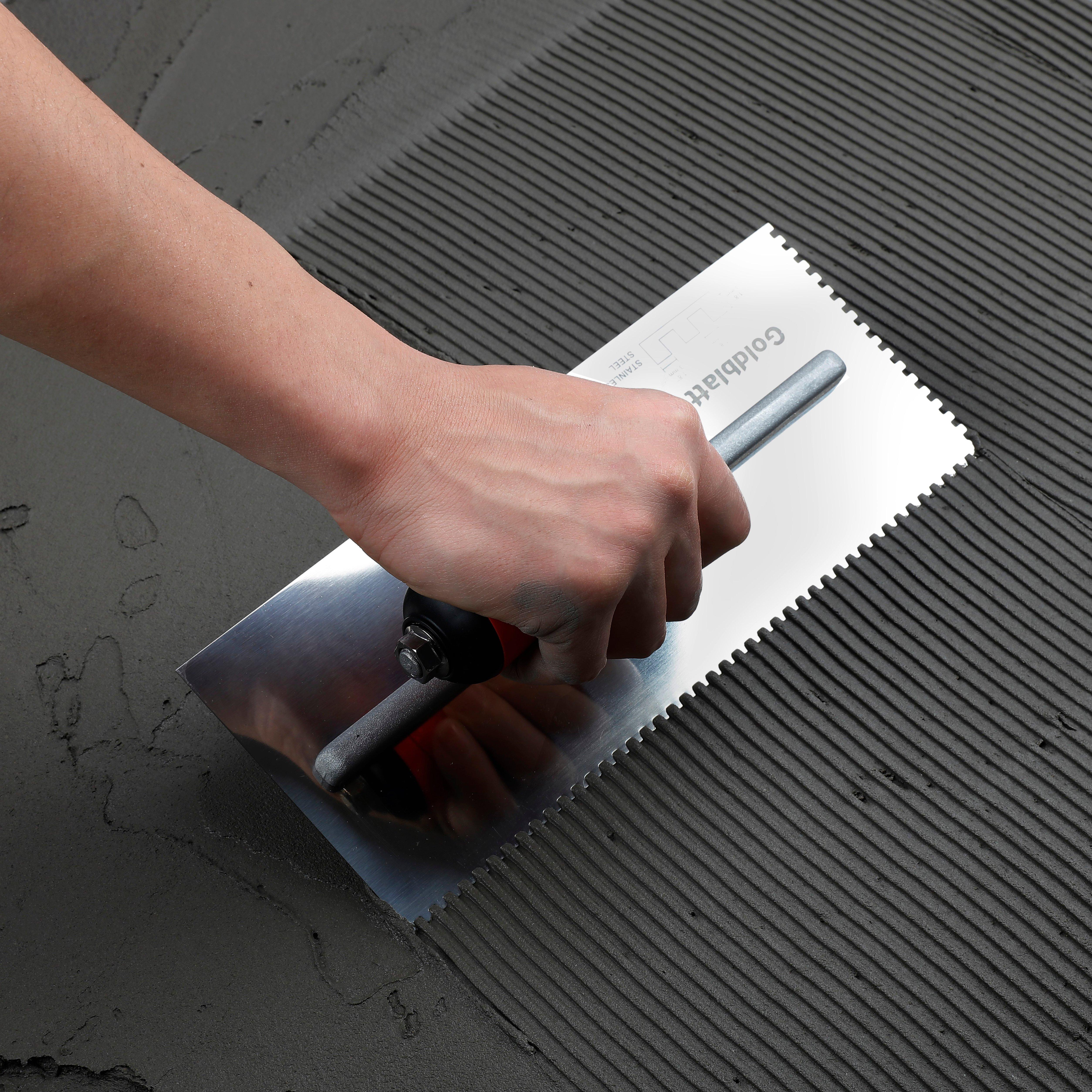 The Goldblatt® Pro notched trowel is designed for the trade professionals. Great for multiple types of flooring installations, especially tile and linoleum. This trowel offers a high grade stainless steel blade reducing rust. The blade is hardened and tempered for strength and durability. Sturdy aluminum mounting is durable, yet lightweight. A firm comfortable grip offers a soft feel, reduces fatigue. Blade measures 11-in x 4-1/2-in. Available in a variety of notch styles.