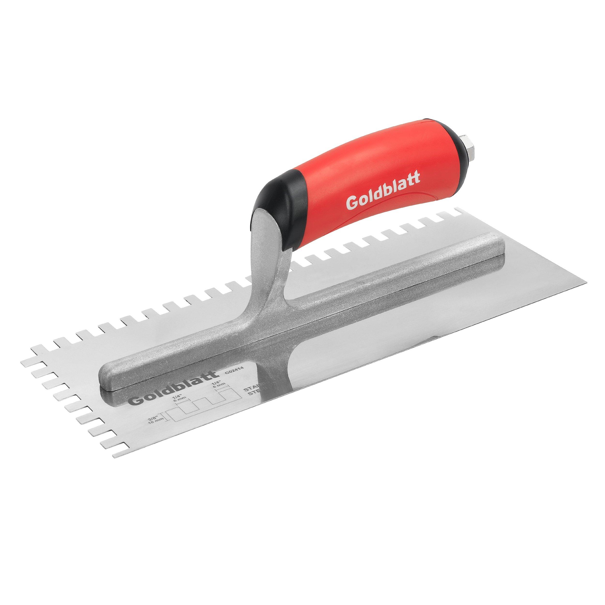 Lifetime LimitedThe Goldblatt® Pro notched trowel is designed for the trade professionals. Great for multiple types of flooring installations, especially tile and linoleum. This trowel offers a high grade stainless steel blade reducing rust. The blade is hardened and tempered for strength and durability. Sturdy aluminum mounting is durable, yet lightweight. A firm comfortable grip offers a soft feel, reduces fatigue. Blade measures 11-in x 4-1/2-in. Available in a variety of notch styles.