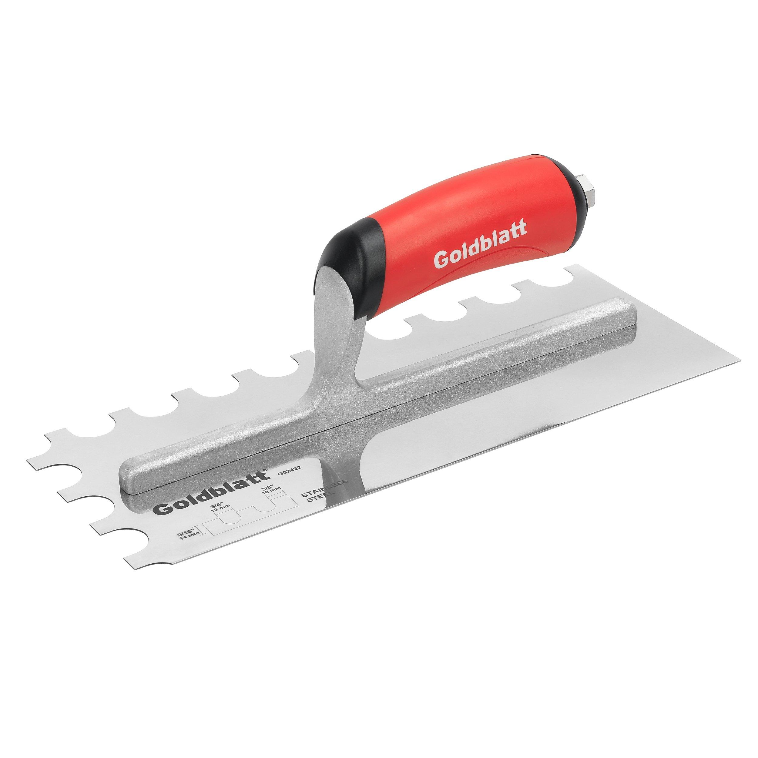 Lifetime LimitedThe Goldblatt® Pro notched trowel is designed for the trade professionals. Great for multiple types of flooring installations, especially tile and linoleum. This trowel offers a high grade stainless steel blade reducing rust. The blade is hardened and tempered for strength and durability. Sturdy aluminum mounting is durable, yet lightweight. A firm comfortable grip offers a soft feel, reduces fatigue. Blade measures 11-in x 4-1/2-in. Available in a variety of notch styles.