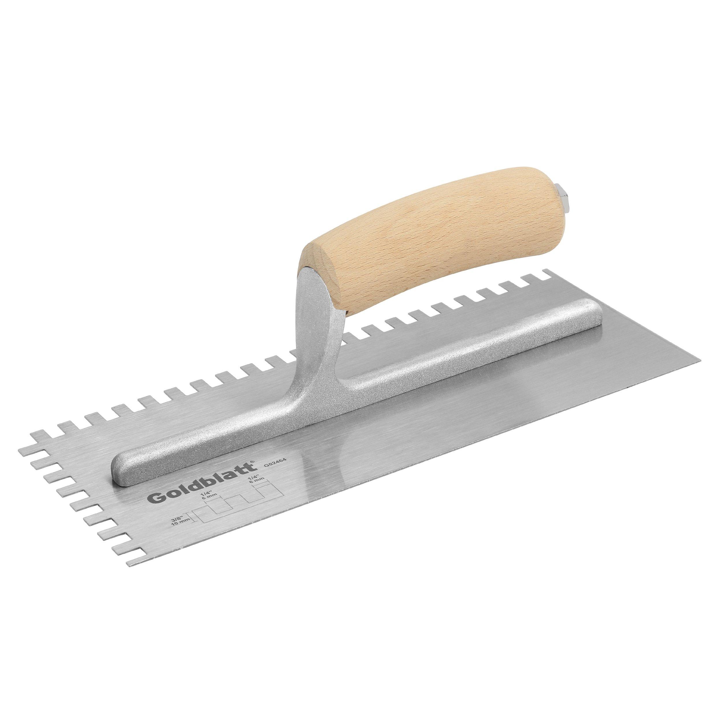 The Goldblatt® notched trowel is designed for the trade professionals. Great for many types of floor installations, especially tile and linoleum. This trowel features a tempered high carbon steel blade for strength and durability. Sturdy aluminum mounting. Firm comfortable hardwood handle. Blade measures 11-in x 4-1/2-in. Available in a variety of notch styles.