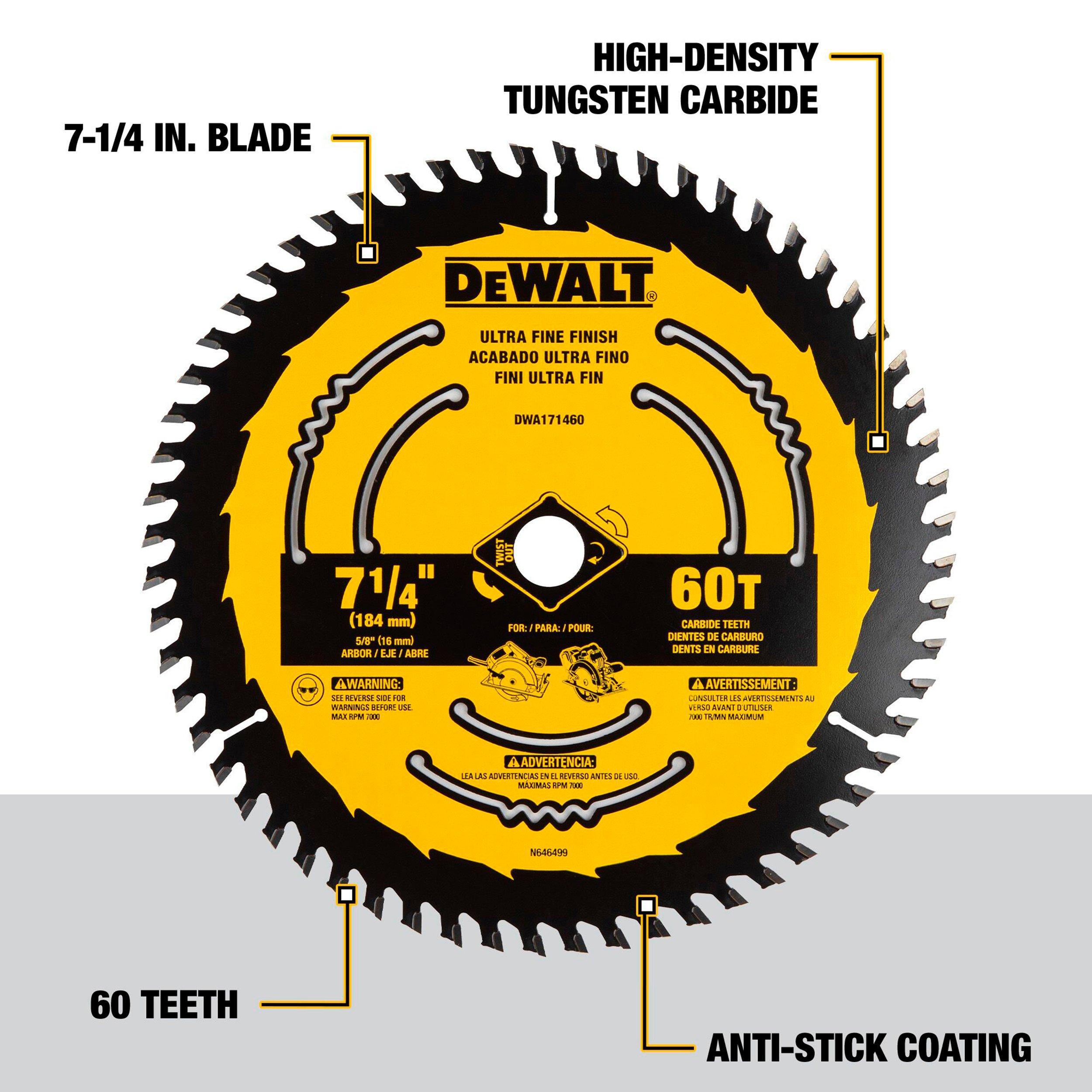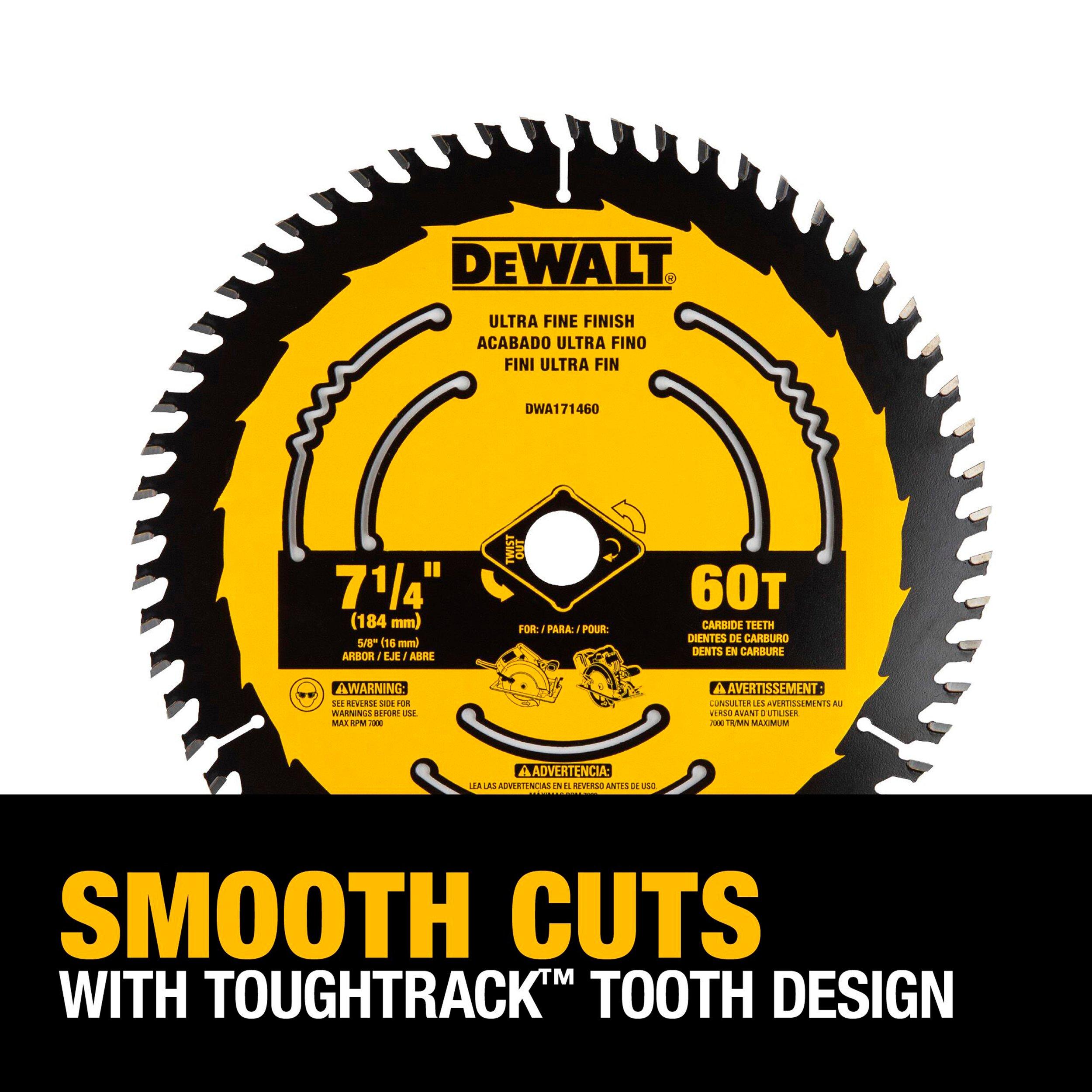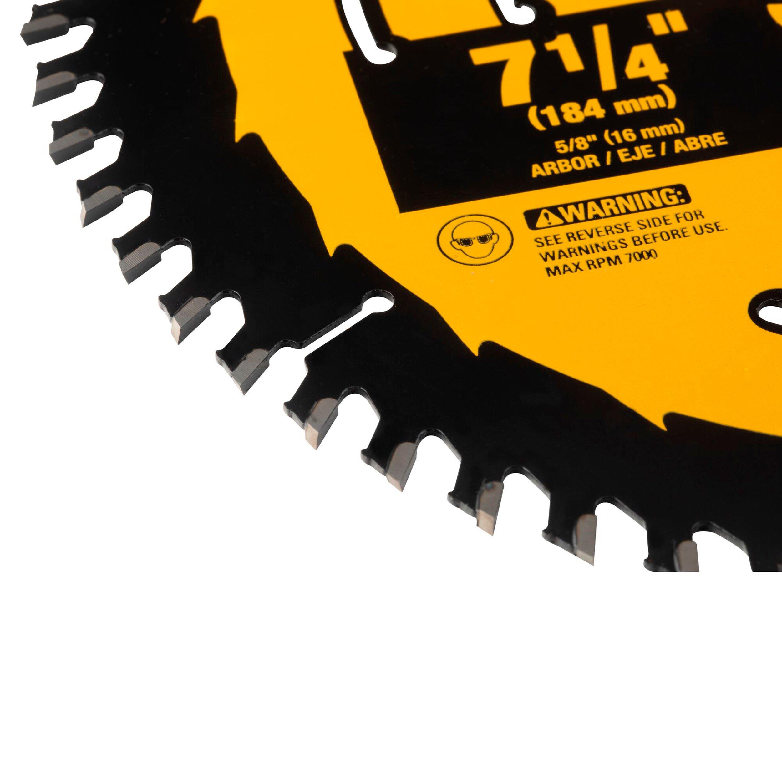 NONEDeWalt 7 1/4 in. 60T Saw Blade with patented body slots reduce vibration for exceptional feel. High-density tungsten carbide for toughness, wear-resistance, and long life. ToughCoat anti-stick coating reduces friction and gumming. Thin kerf design for smooth cuts. Reinforced shoulder for improved carbide support and impact resistance in nail-embedded wood. Optimized for use on both corded and cordless circular saws.•Patented body slots reduce vibration for exceptional feel•High-density tungsten carbide for toughness, wear-resistance, and long life•ToughCoat anti-stick coating reduces friction and gumming•Thin kerf design for smooth cuts