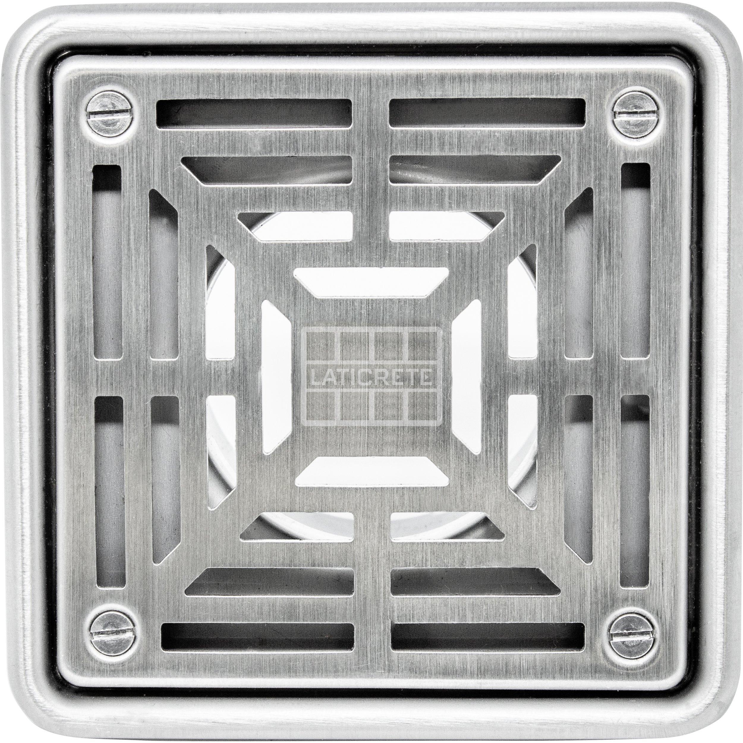 Lifetime SystemLaticrete Hydro Ban 4 in. x 4 in. Brushed Stainless Steel Grate is a precision-engineered stainless steel drain designed for durability and seamless integration with tile floors and waterproofing systems. Its robust construction and versatile design make it ideal for residential and commercial shower installations.