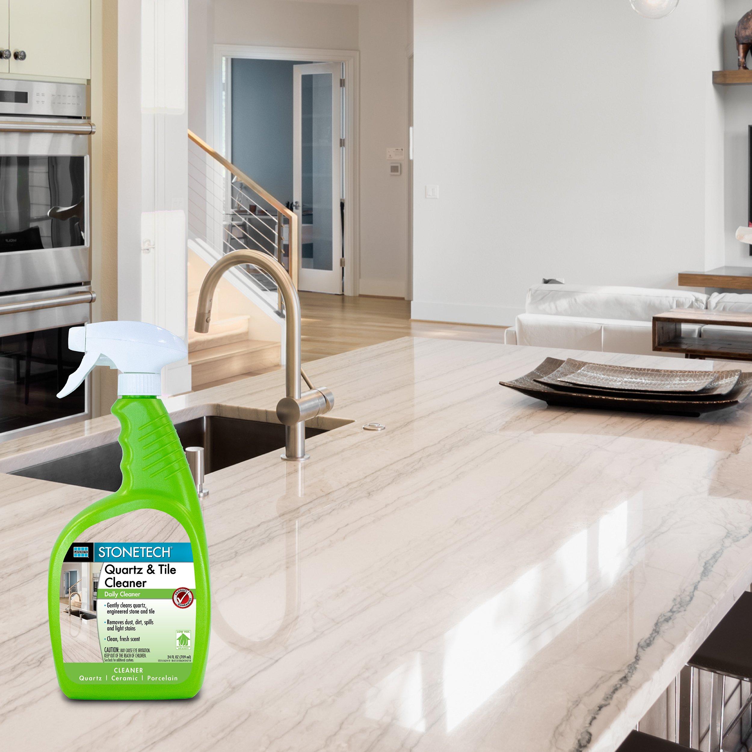 1 Year LimitedSTONETECH® Quartz & Tile Cleaner is the ready-to-use, daily cleaner that removes dust, dirt, spills and even light stains from quartz, engineered stone and tile surfaces. This gentle, non-abrasive cleaner is a safe, low VOC solution to maintaining a clean quartz surface without the need to rinse down with water. It leaves a clean fresh scent and is great for use for use on kitchen and bathroom countertops and backsplashes.