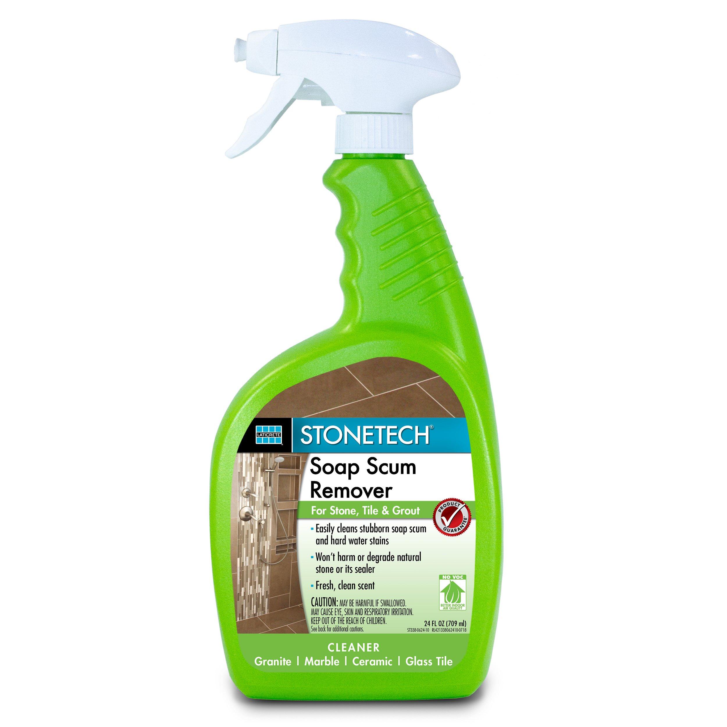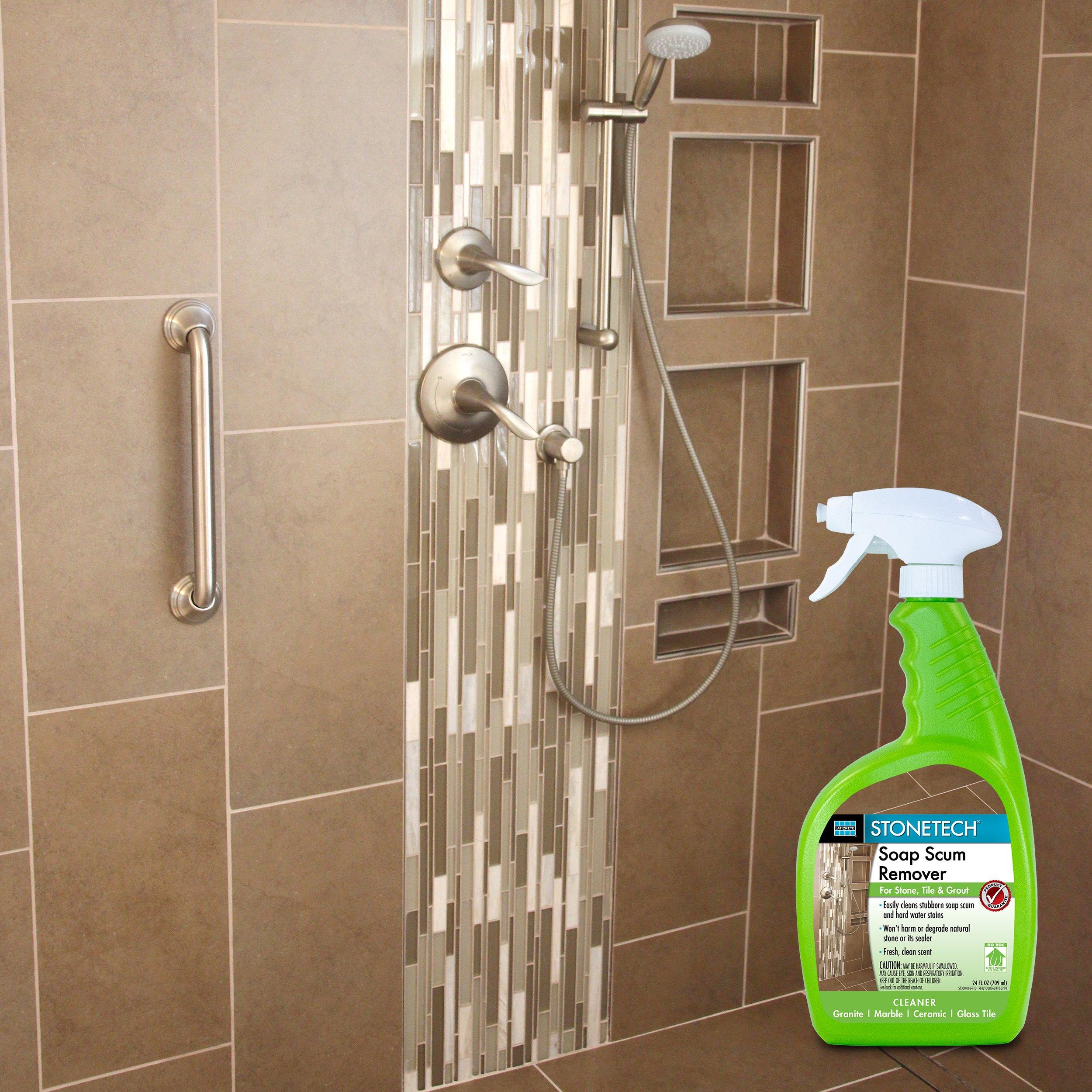 1 Year LimitedSTONETECH® Soap Scum Remover is a ready-to-use, powerful specialty cleaner specifically formulated to remove stubborn soap scum, hard water stains and dirt on natural stone, tile and grout. Unlike other household cleaners that may harm or degrade natural stone, STONETECH Soap Scum Remover gently cleans soap scum build up on natural stone without scratching. It features a foaming action sprayer that allows the cleaner to adhere well to vertical applications and avoid messy drips. Great for use on bathroom vanities, showers, tubs and more.