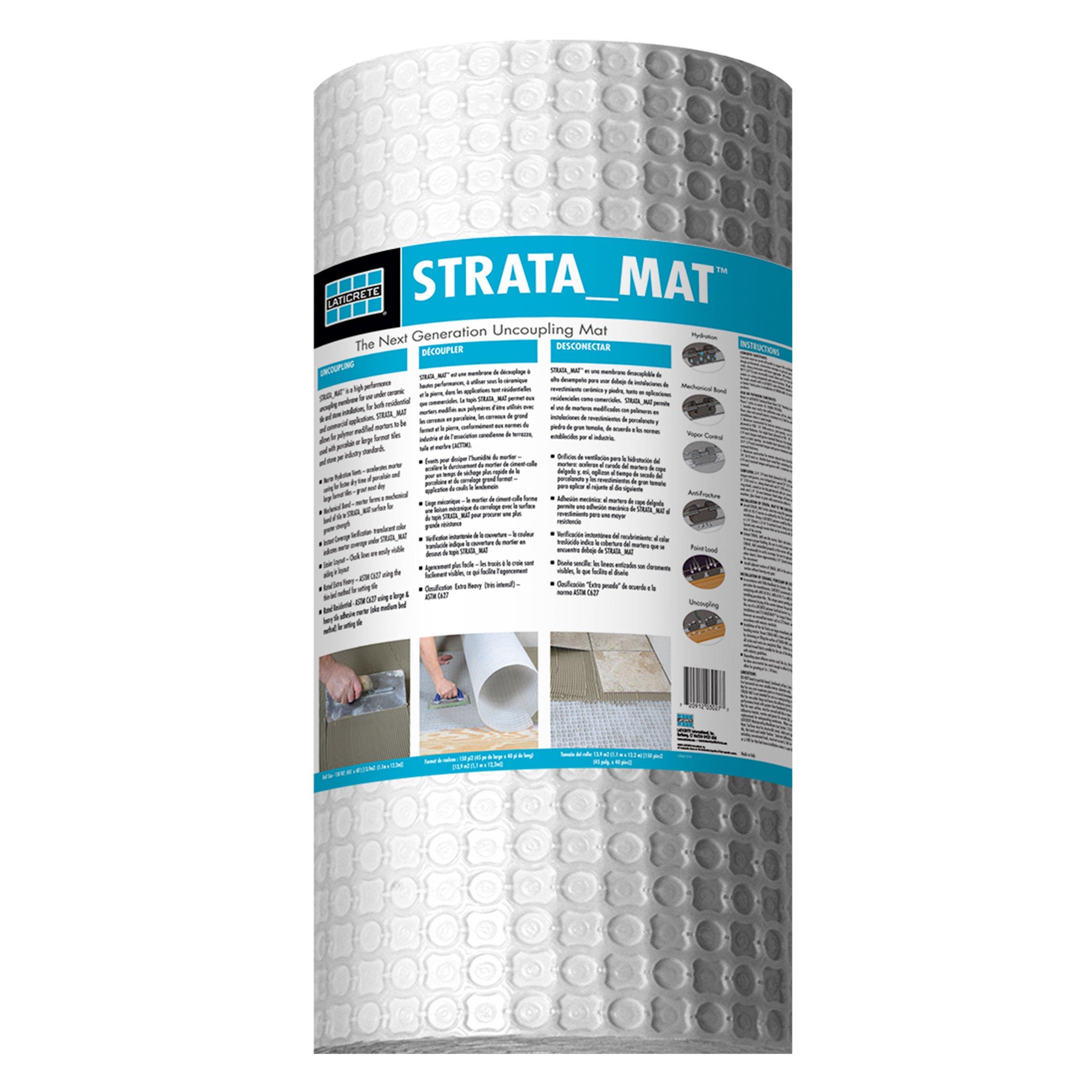 Laticrete Strata Mat 323sqft. is designed to provide effective crack isolation and improve the overall quality of your tile installation. It helps prevent substrate cracks from telegraphing through your tile surface. Engineered with mortar hydration vents, it accelerates thin-set curing, allowing grout to be applied as soon as the next day. The translucent color makes it easy to confirm full coverage of thin-set adhesive during installation. Its patented surface promotes a strong mechanical bond with the mortar, ensuring durability. Lightweight and easy to handle, the mat installs quickly using standard tools. At 1/8" (3 mm) thick, it also helps transition between uneven floor surfaces for a smooth finish.