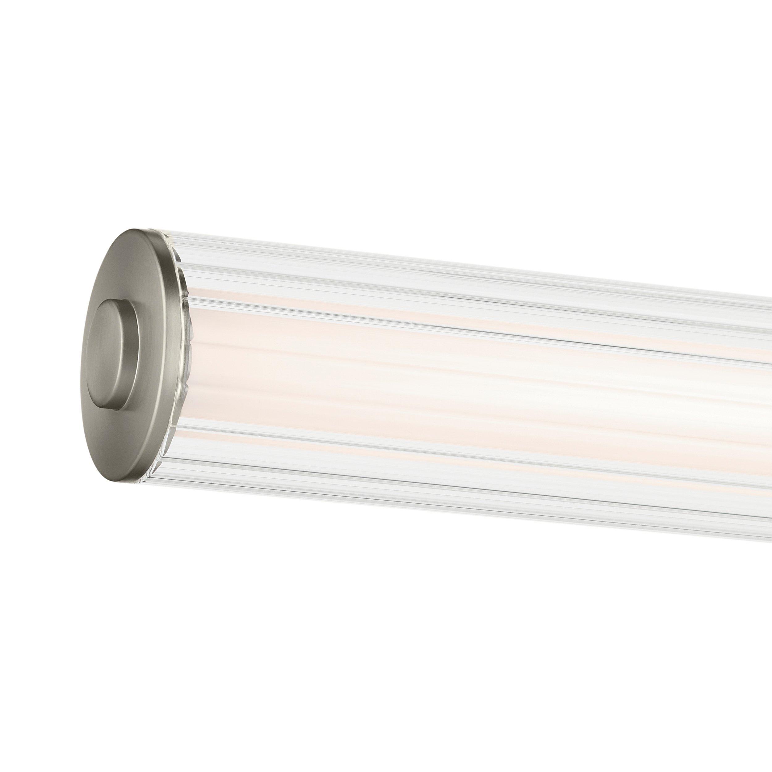 5 Year LimitedIntroducing the Laurene Collection, a linear bath piece that embodies the trending design of layered materials and metal finish accents. Laurene's cylindrical clear outer glass offers striking visual appeal and beautiful illumination. Its 3000K integrated LED light provides a radiant full-room glow. Install it vertically or horizontally to suit your space. Energy-efficient and dimmable, with a durable steel frame for stability.